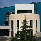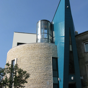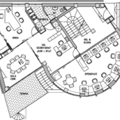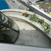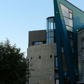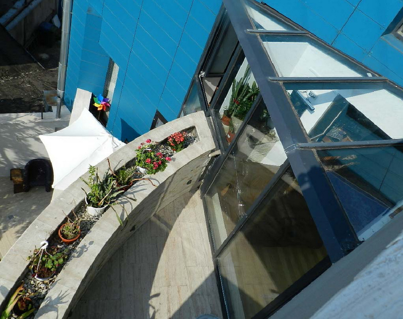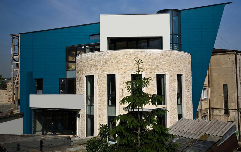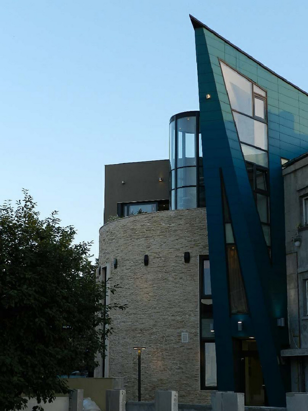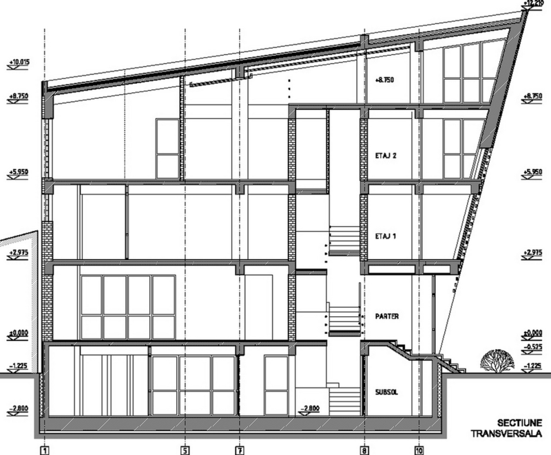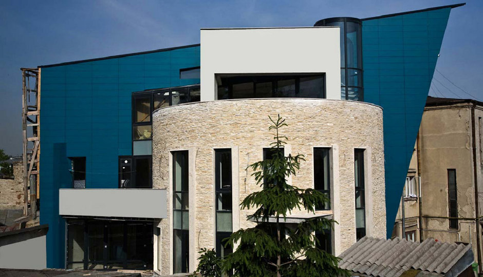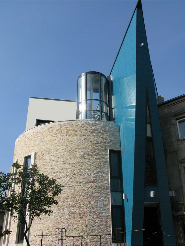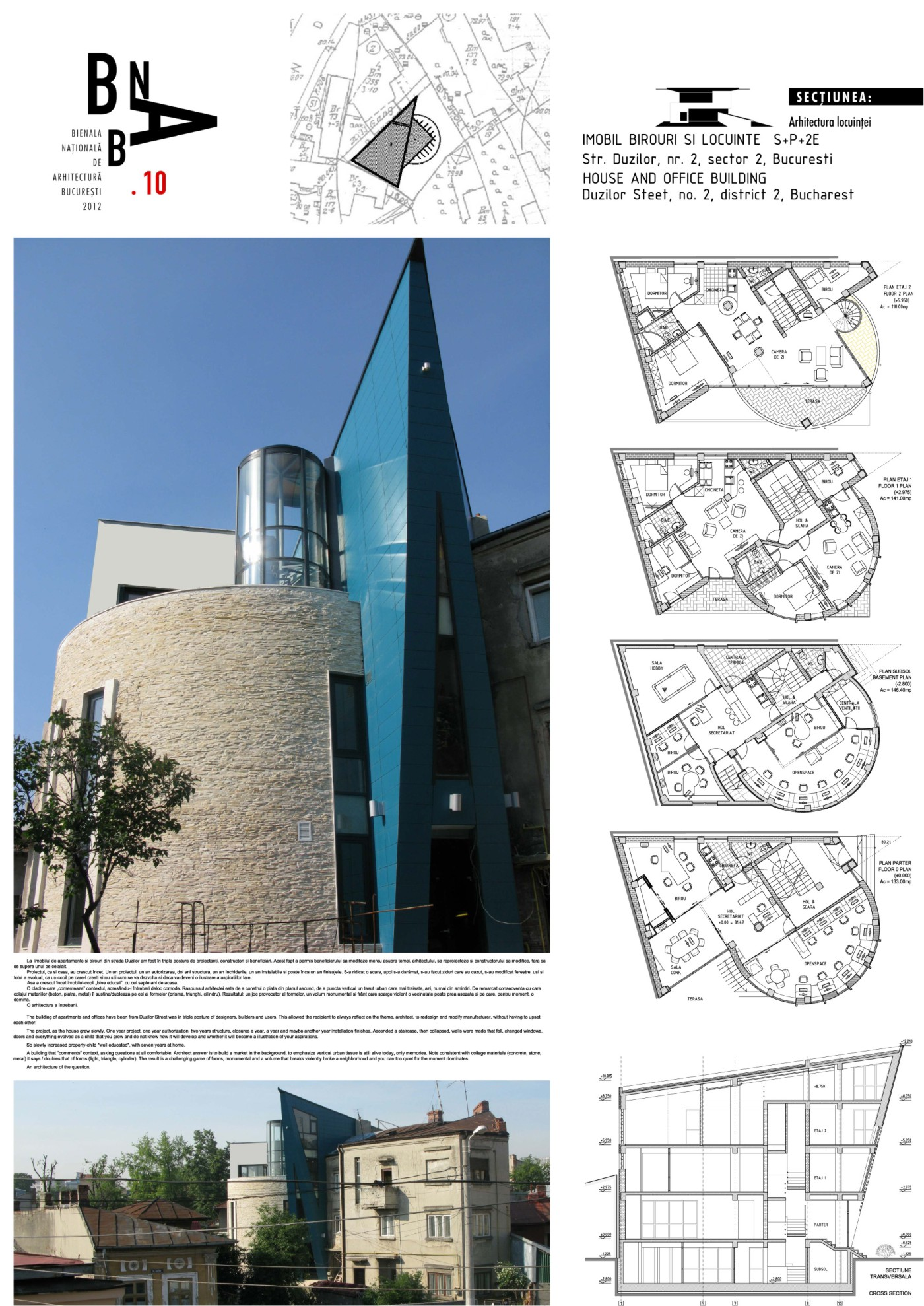 O cladire care „comenteaza” contextul, adresându-i întrebari deloc comode. Raspunsul arhitectei este de a construi o piata din planul secund, de a puncta vertical un tesut urban care mai traieste, azi, numai din amintiri. De remarcat consecventa cu care colajul materiilor (beton, piatra, metal) îl sustine/dubleaza pe cel al formelor (prisma, triunghi, cilindru). Rezultatul: un joc provocator al formelor, un volum monumental si frânt care sparge violent o vecinatate poate prea asezata si pe care, pentru moment, o domina.