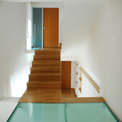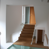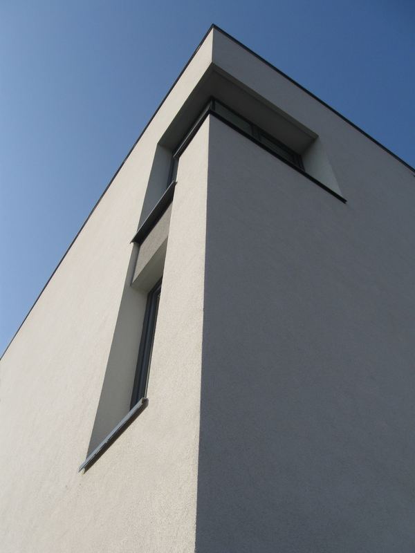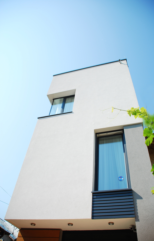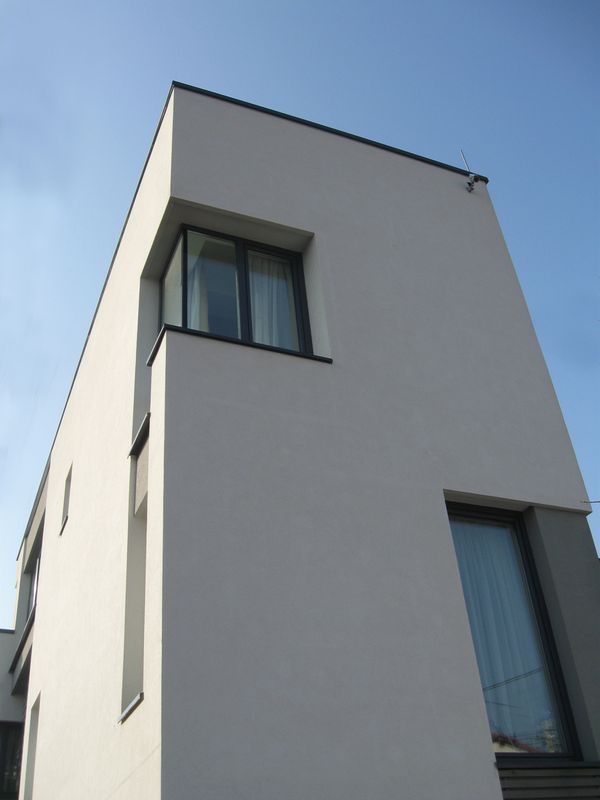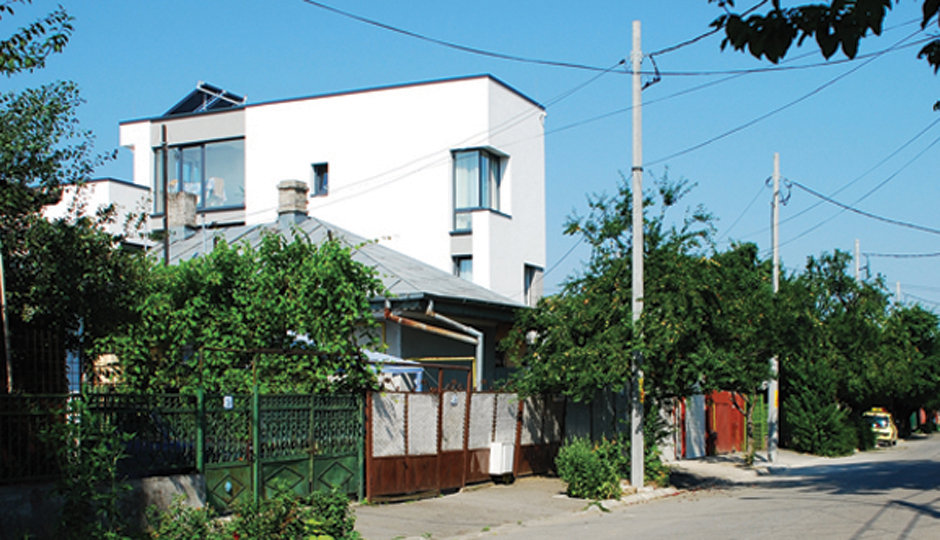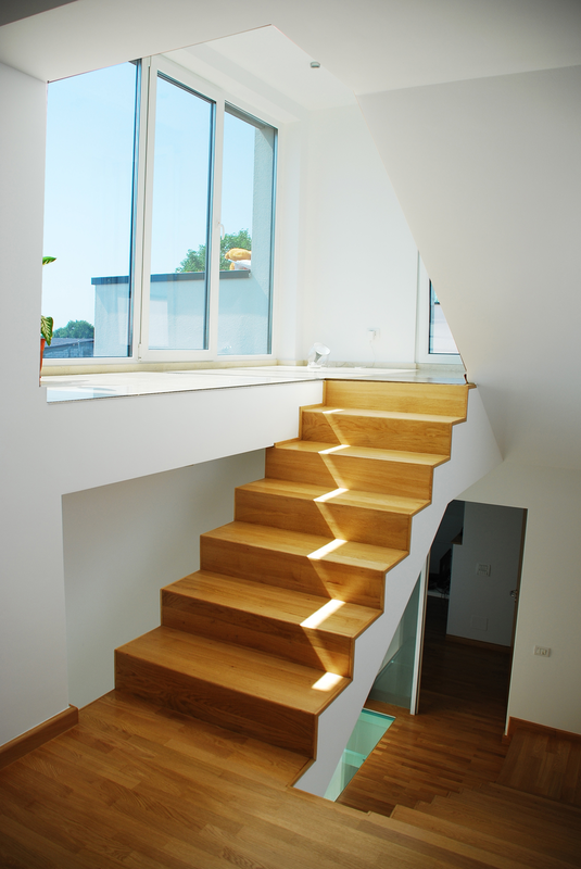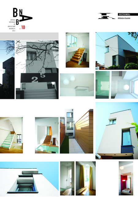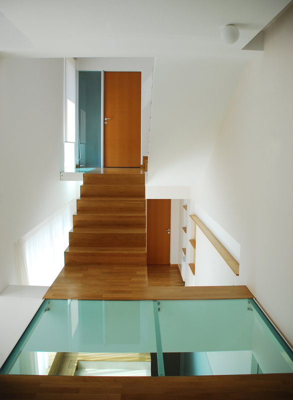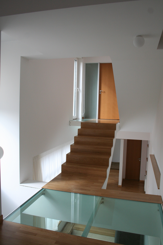 Detaşarea interioară a scării încearcă să marcheze şi ea, în inima casei, mariajul compoziţional al formelor exterioare – ecranul alb al faţadei vest, şi peretele perforat al faţadei de N, parţial placat cu lemn către zona de parter. În drum către terasă, grădina pe verticală îşi găseşte locul o seră, locul de refugiu şi meditaţie al locuinţei, în dialog cu perspectiva ce se deschide spre răsărit. Realizat cu mijloace simple, materiale şi tehnici autohtone, într-un spaţiu redus ca dimensiuni, dar cu efect maxim de spaţialitate, imaginea volumului propus, precum şi organizarea interioară, conferă ansamblului.