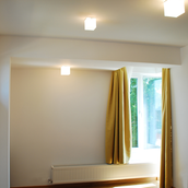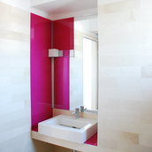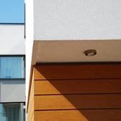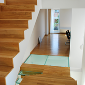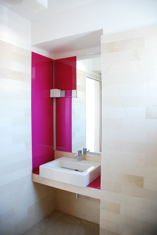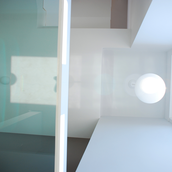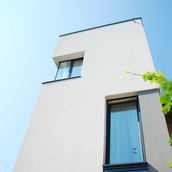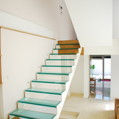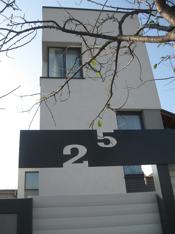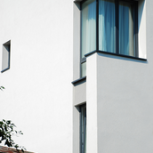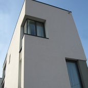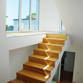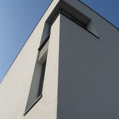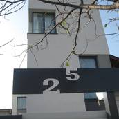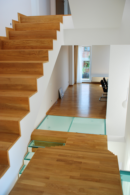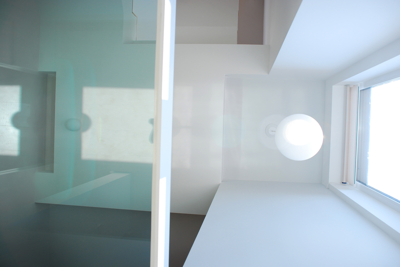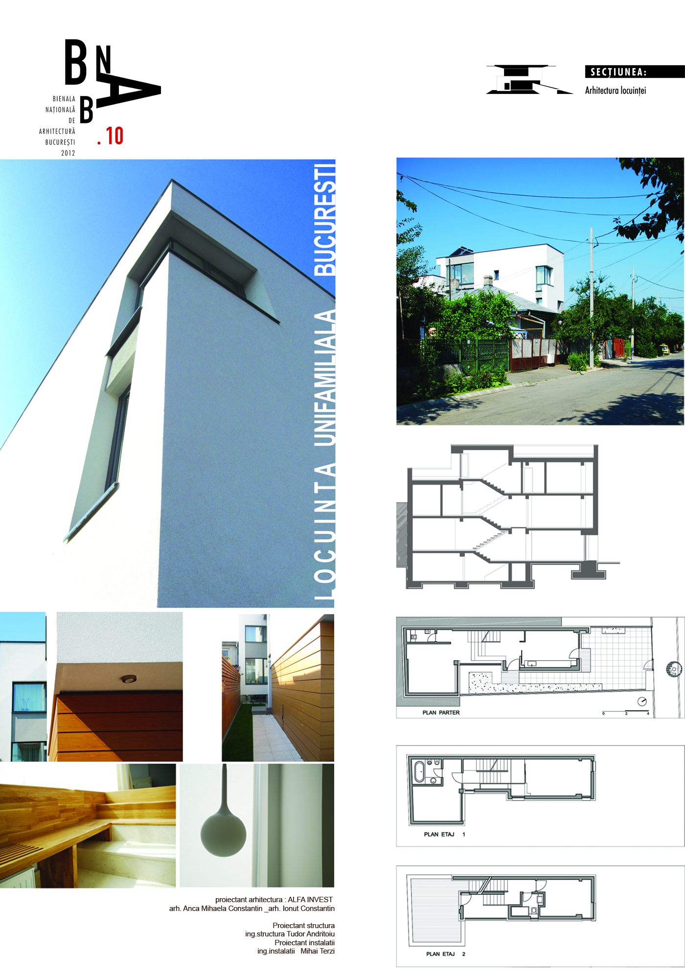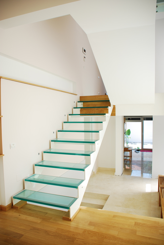 Detaşarea interioară a scării încearcă să marcheze şi ea, în inima casei, mariajul compoziţional al formelor exterioare – ecranul alb al faţadei vest, şi peretele perforat al faţadei de N, parţial placat cu lemn către zona de parter. În drum către terasă, grădina pe verticală îşi găseşte locul o seră, locul de refugiu şi meditaţie al locuinţei, în dialog cu perspectiva ce se deschide spre răsărit. Realizat cu mijloace simple, materiale şi tehnici autohtone, într-un spaţiu redus ca dimensiuni, dar cu efect maxim de spaţialitate, imaginea volumului propus, precum şi organizarea interioară, conferă ansamblului.