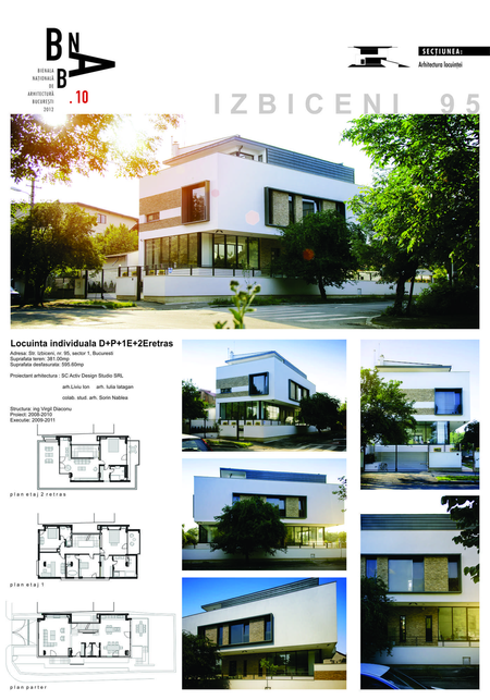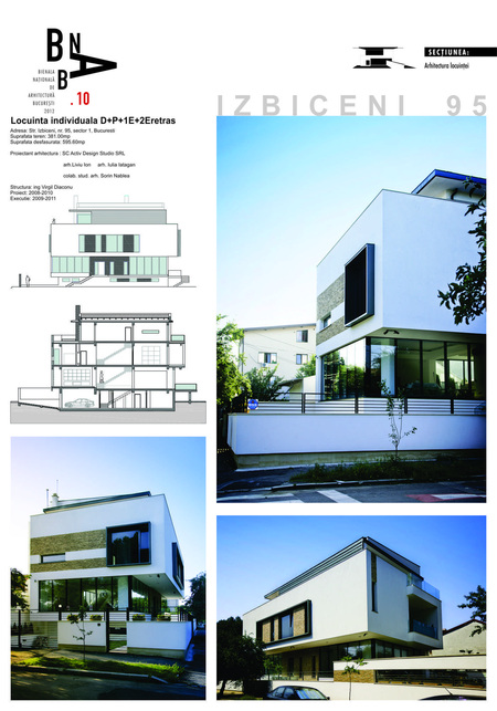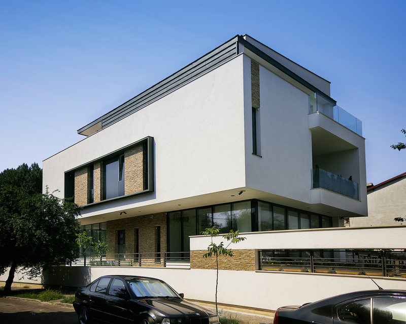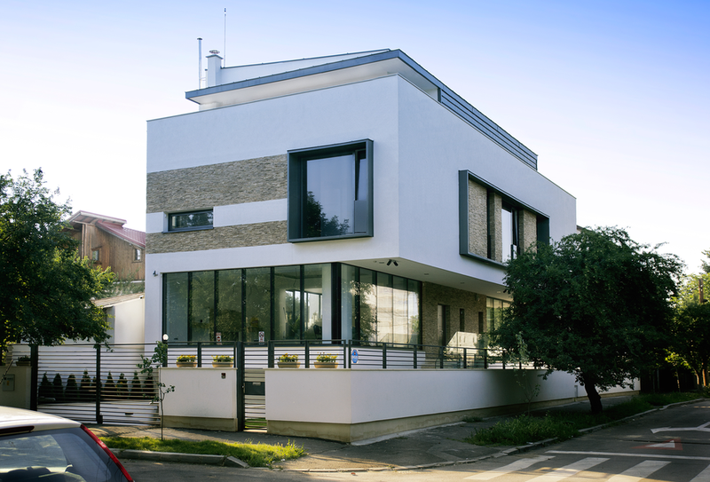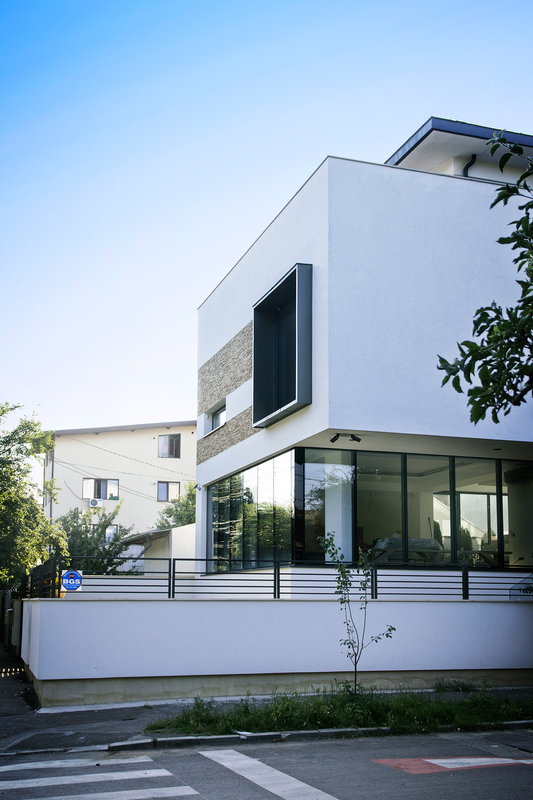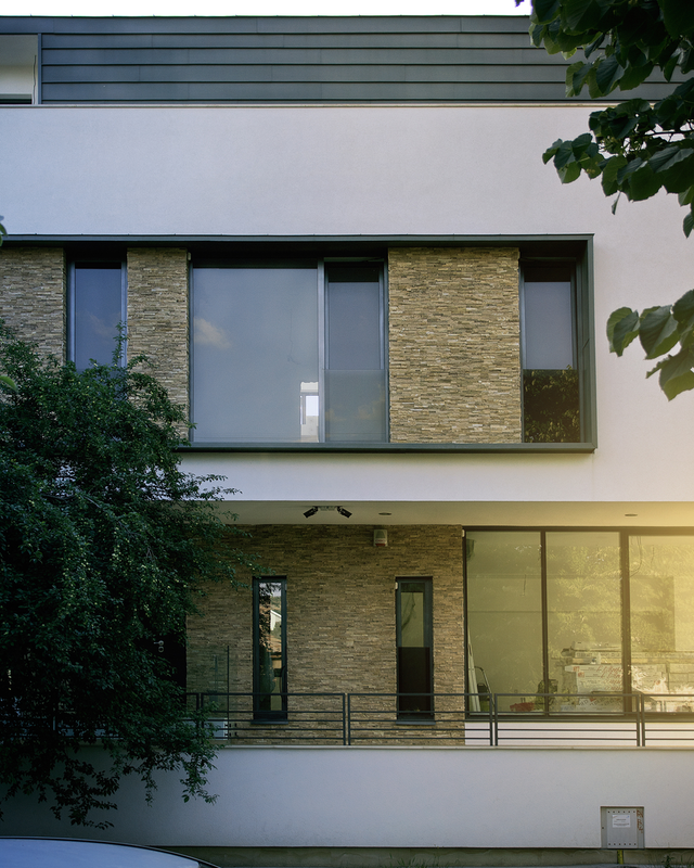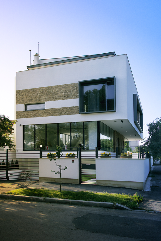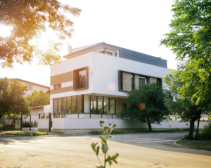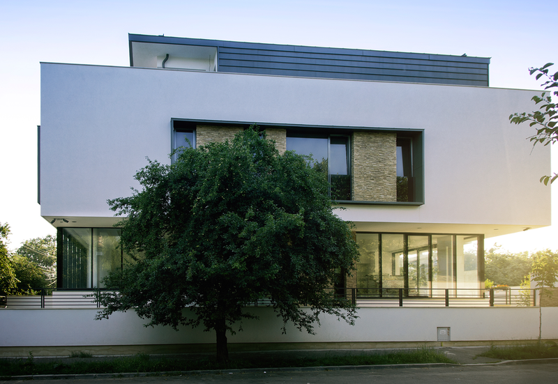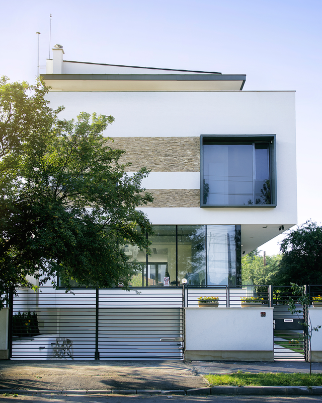 Este o casa impunatoare, cu o silueta moderna si cu linii simple. Proprietarii si-au dorit o locuinta cu spatii generoase, fluide, deschise si inundate de lumina, in acelasi timp beneficiind de tot confortul necesar: garaj pentru doua masini, sauna, studio pentru o bona, o zona de zi la parter cu living, bucatarie si dinning, o zona de noapte la etaj si la mansarda o zona pentru intalnirile cu prietenii.