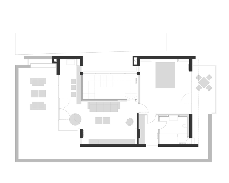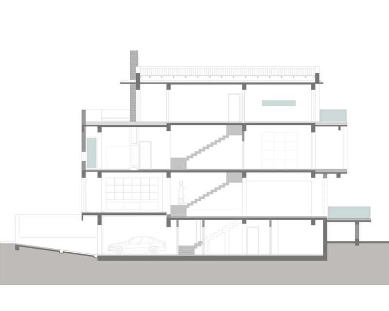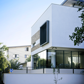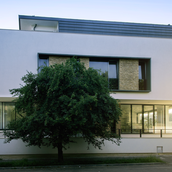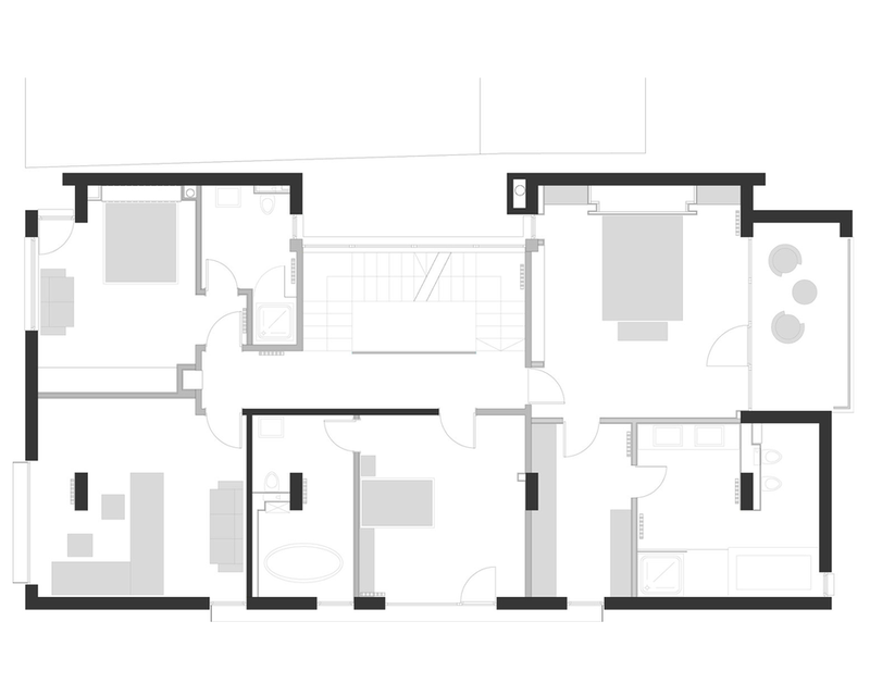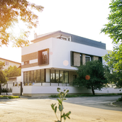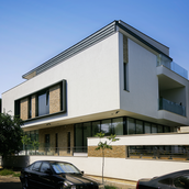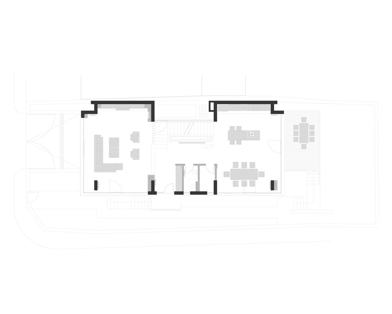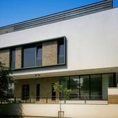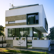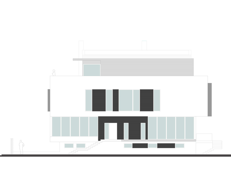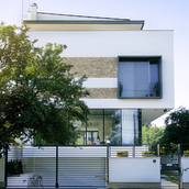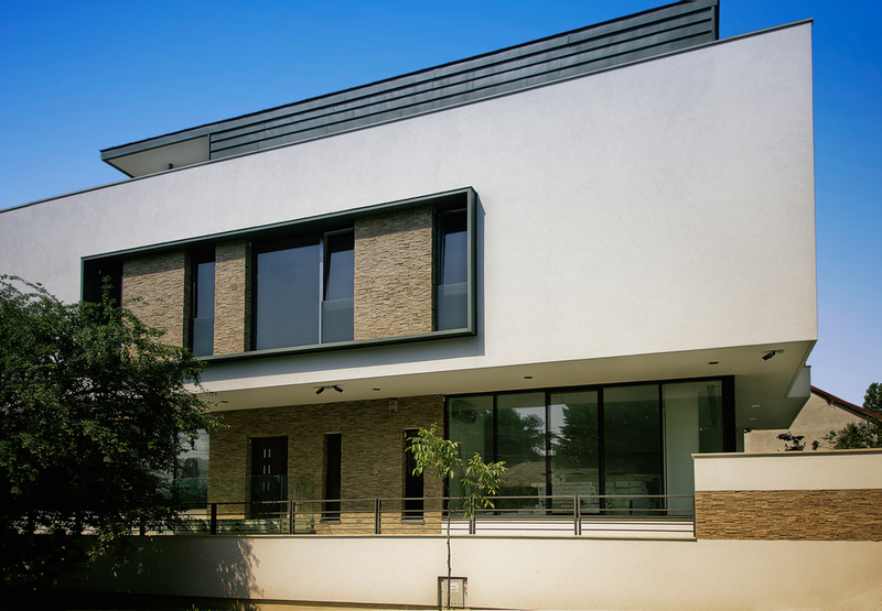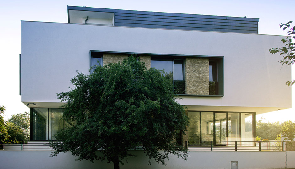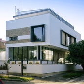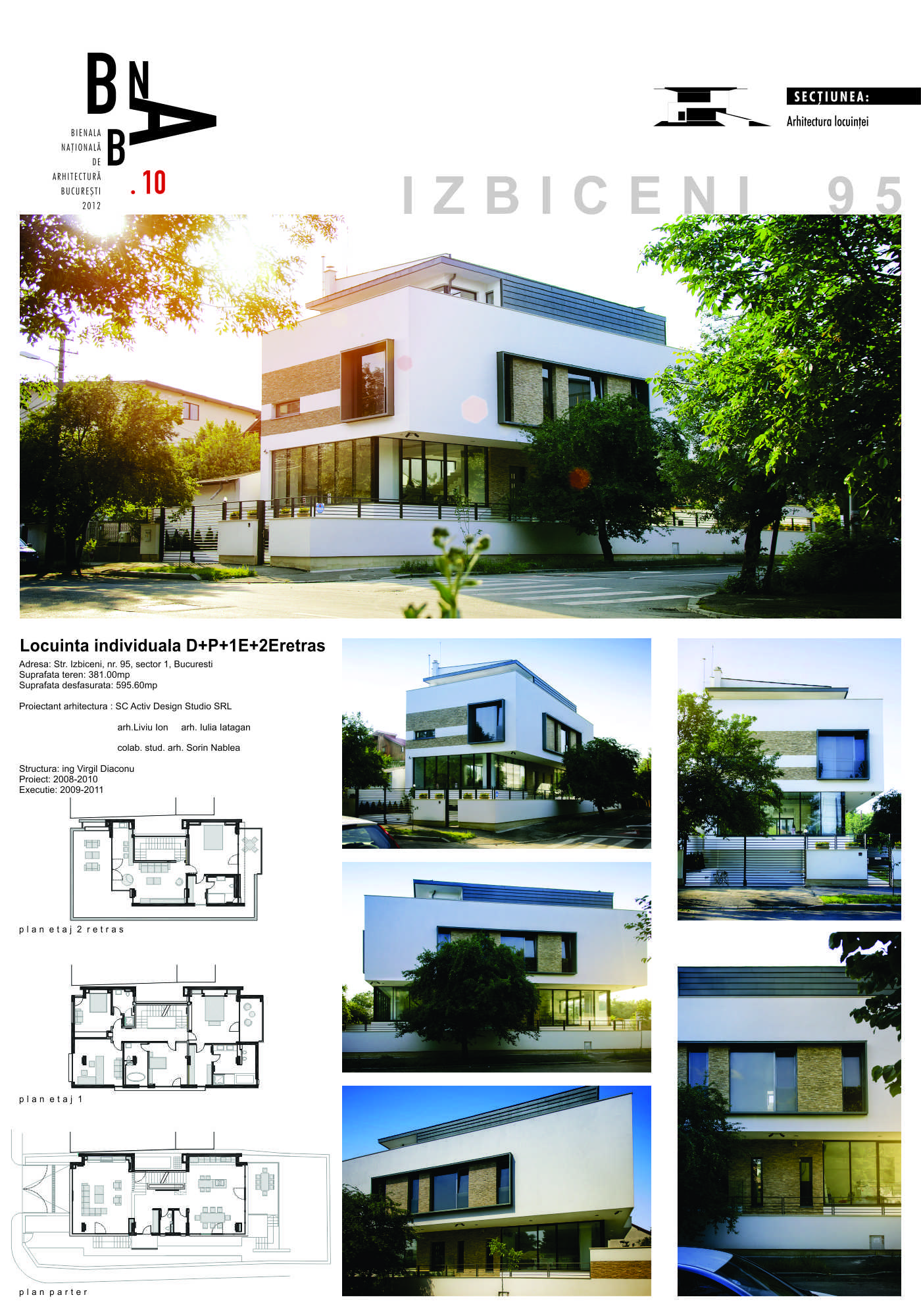 Este o casa impunatoare, cu o silueta moderna si cu linii simple. Proprietarii si-au dorit o locuinta cu spatii generoase, fluide, deschise si inundate de lumina, in acelasi timp beneficiind de tot confortul necesar: garaj pentru doua masini, sauna, studio pentru o bona, o zona de zi la parter cu living, bucatarie si dinning, o zona de noapte la etaj si la mansarda o zona pentru intalnirile cu prietenii.