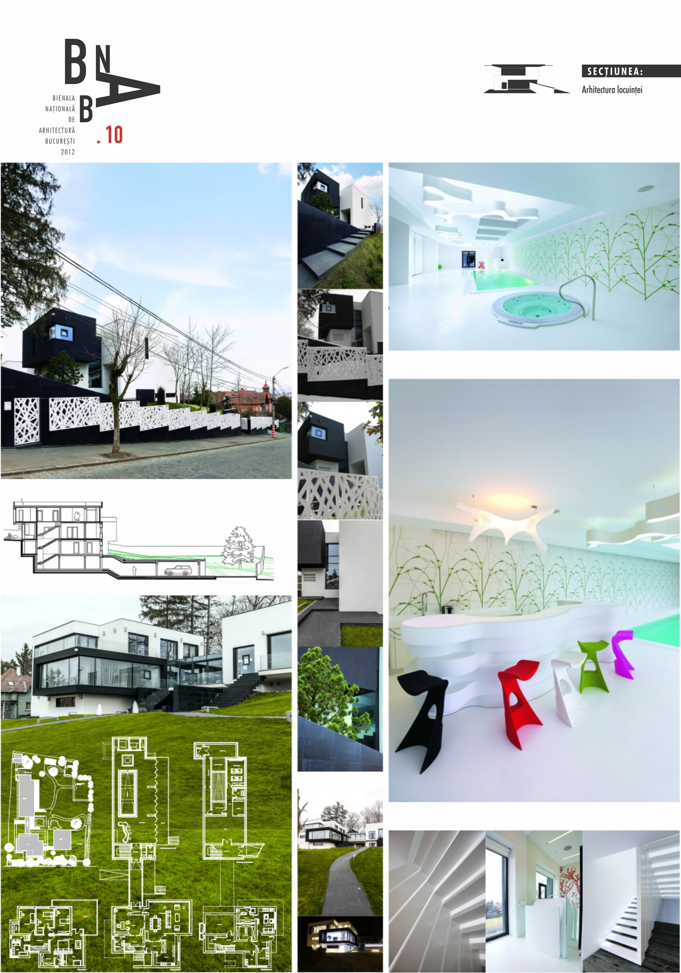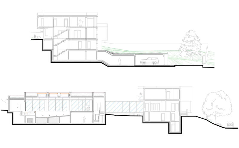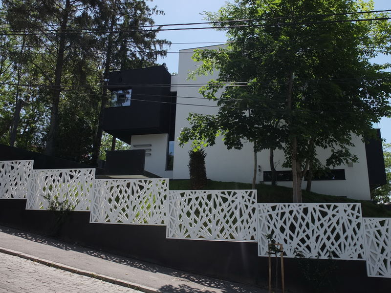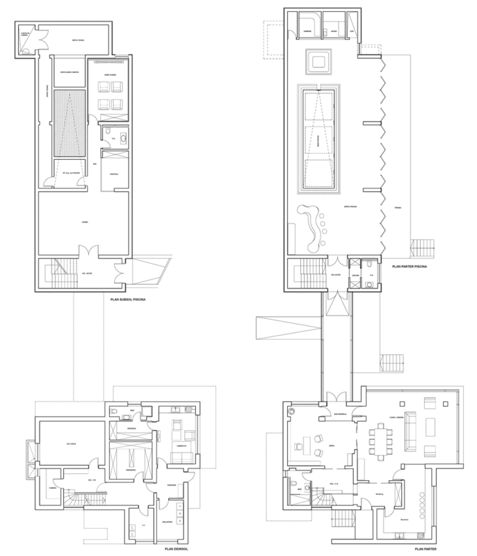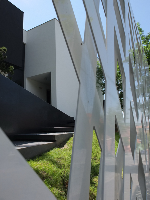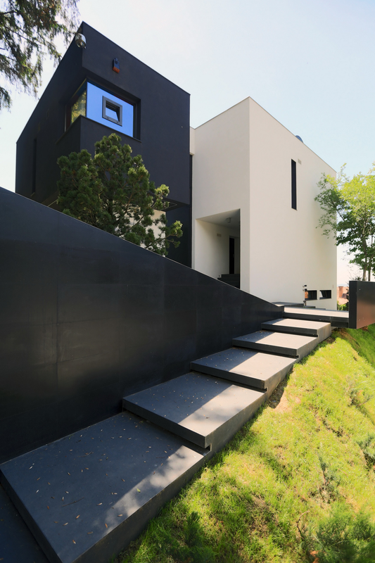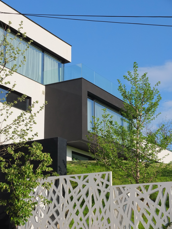 Terenul, in ceea ce priveste conformatia si amplasamentul, este aici cel putin la fel de important ca insasi casa, iar conditionarile reciproce au fost pentru noi de departe atuuri, nu impedimente. Declivitatea accentuata spre zona cu 'best view', diferenta de nivel de peste sase metri intre extreme, deschiderea generoasa la strada, insorirea si distanta suficienta pana la prima constructie pe directia liniei de panta, fac din teren amplasamentul aproape ideal, iar corpurile de constructii, urmeaza un demers firesc de pliere pe aceste caracteristici, atat volumetric cat si functional. Astfel avem corpul garajului incastrat in teren, legat de subsolul casei printr-un tunel subteran, accesul direct si fara trepte de la nivelul terenului in demisol, corpul piscinei pe aceeasi curba de nivel cu casa, legate printr-o pasarela suspendata. De asemenea, dispunerea spatiilor interioare si exterioare, raportul plin-gol in plan vertical la nivelul fatadelor si inclusiv mobilarea s-au facut dependent de acest context.