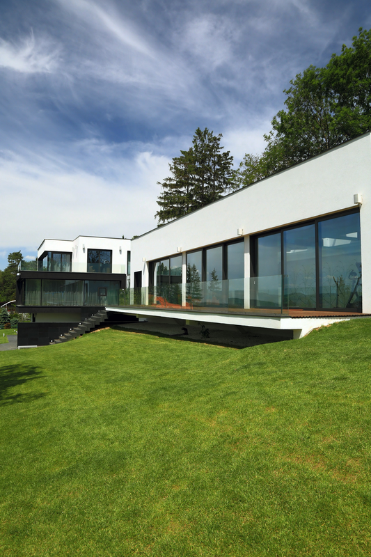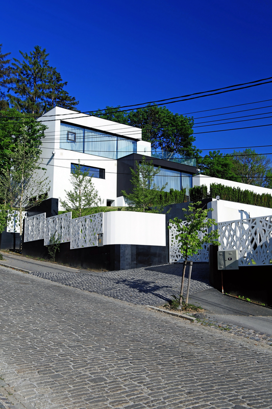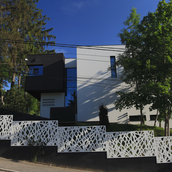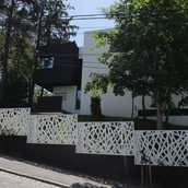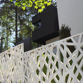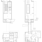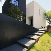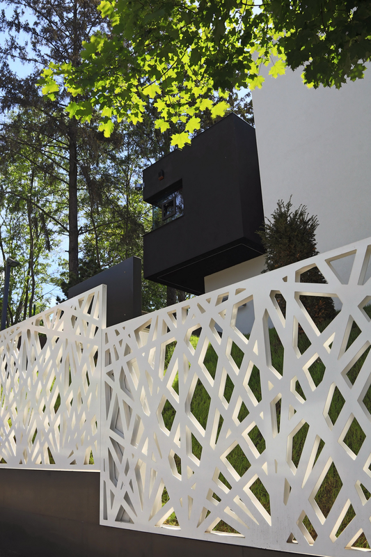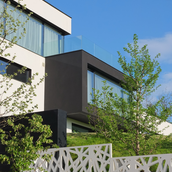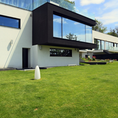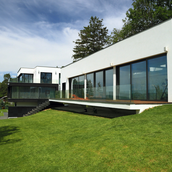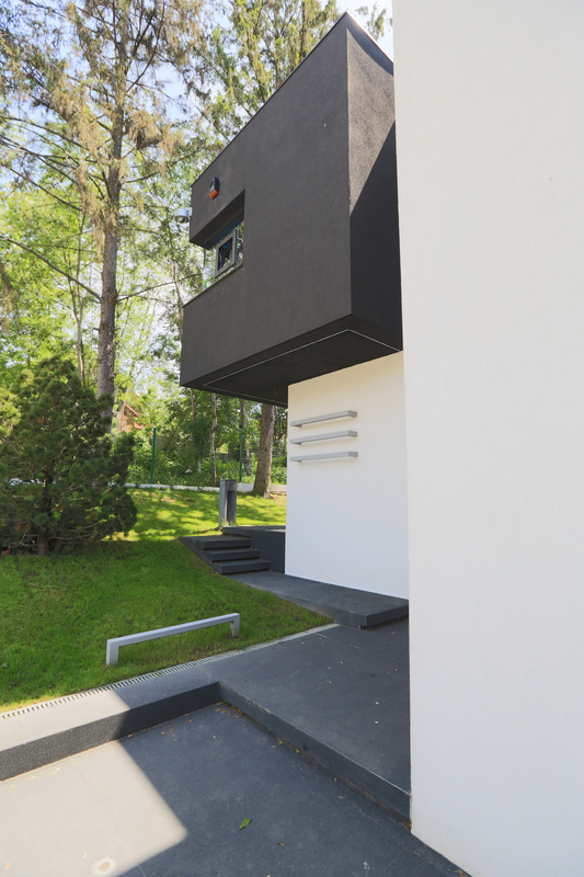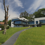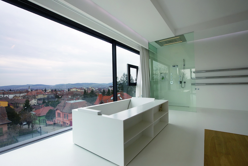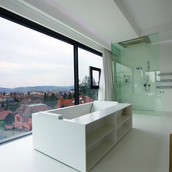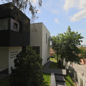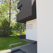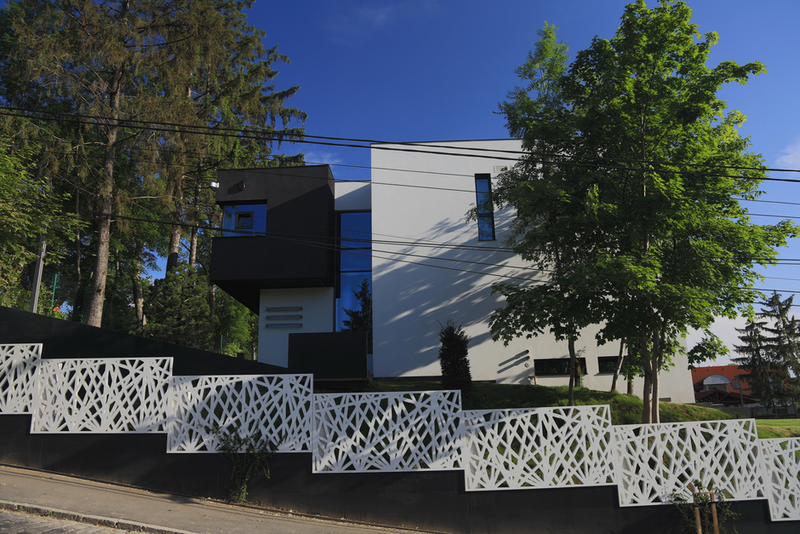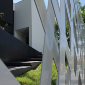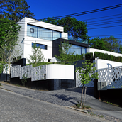 Terenul, in ceea ce priveste conformatia si amplasamentul, este aici cel putin la fel de important ca insasi casa, iar conditionarile reciproce au fost pentru noi de departe atuuri, nu impedimente. Declivitatea accentuata spre zona cu 'best view', diferenta de nivel de peste sase metri intre extreme, deschiderea generoasa la strada, insorirea si distanta suficienta pana la prima constructie pe directia liniei de panta, fac din teren amplasamentul aproape ideal, iar corpurile de constructii, urmeaza un demers firesc de pliere pe aceste caracteristici, atat volumetric cat si functional. Astfel avem corpul garajului incastrat in teren, legat de subsolul casei printr-un tunel subteran, accesul direct si fara trepte de la nivelul terenului in demisol, corpul piscinei pe aceeasi curba de nivel cu casa, legate printr-o pasarela suspendata. De asemenea, dispunerea spatiilor interioare si exterioare, raportul plin-gol in plan vertical la nivelul fatadelor si inclusiv mobilarea s-au facut dependent de acest context.