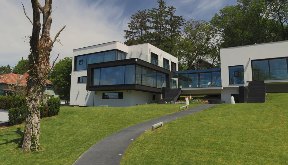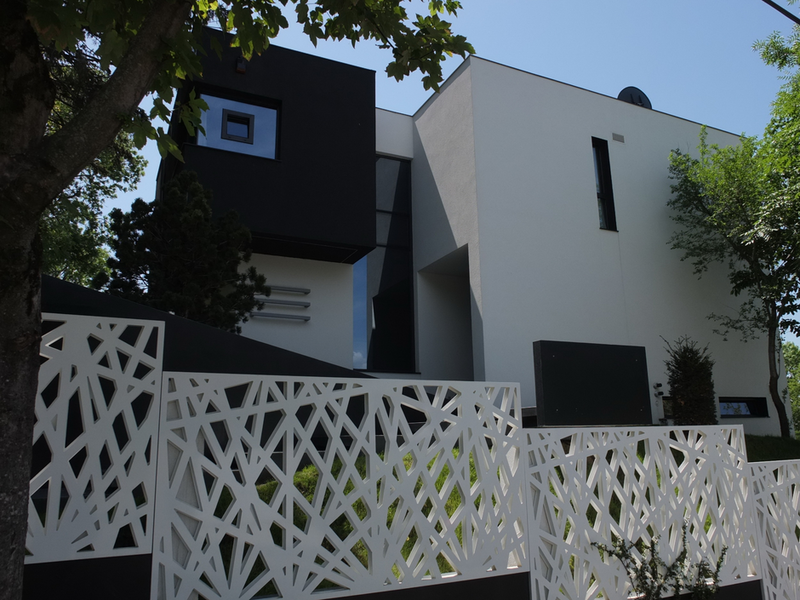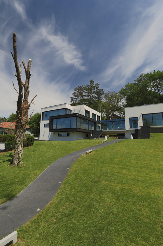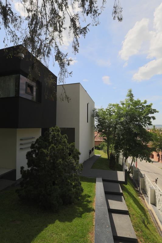 Volumetric si stilistic, constructiile, partial preiau din aerul vechii constructii a casei construite in perioada interbelica, partial fiind rezultatul acceptarii si asumarii provocarii plecate din insumarea dorintelor beneficiarului si a temei cu intrgul concept si cu insertul in tesut urban existent, la nivel de tipologie si de cromatica. Ansamblul este organizat in trei corpuri de constructii. Primul ca impact visual este casa care este dispusa pe doua niveluri supraterane, unul partial si unul subteran, nodul de legatura intre ele particularizandu-se prin faptul ca scarile sunt singurele elemente prin rampa dominanta care 'neaga' panta terenului. Functional, etajul superior e dedicat zonei de noapte, cu trei dormitoare de copii si cel matrimonial - deschis spre panorama; parterul - zona de zi cu living room, dinning, bucatarie si un birou-biblioteca; demisolul - o garsoniera independenta, zona de joaca a copiilor, depozitari si utilitati; subsolul - spatii tehnice si articulatia cu cel de-al treilea corp, anume al garajului. Al doilea doilea corp este cel al piscinei dispus pe doua niveluri, la cel suprateran, bazinul si sala piscinei cu zona SPA, la cel inferior, crama, vinoteca, home cinema si zona tehnica aferenta piscinei.
