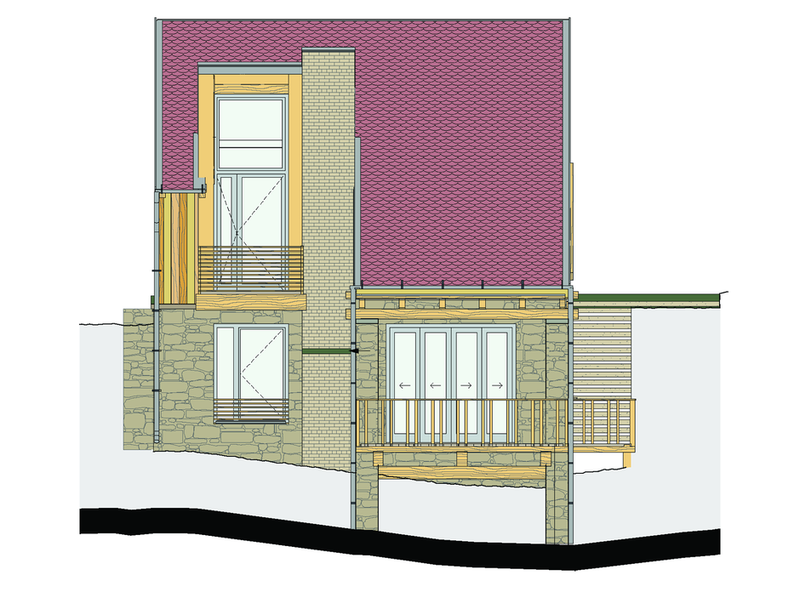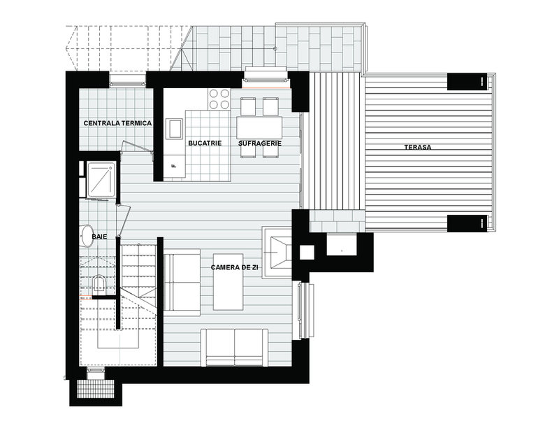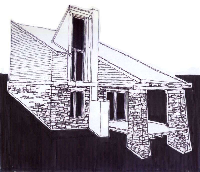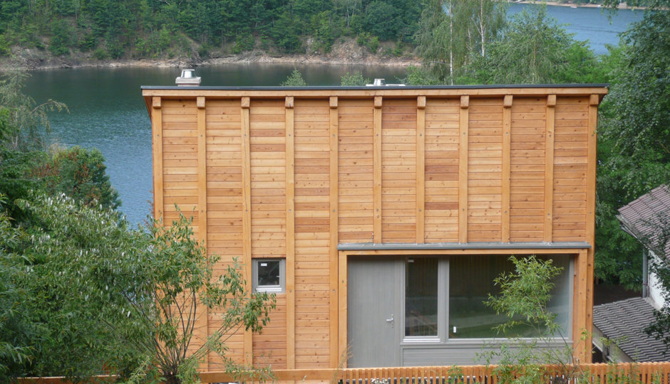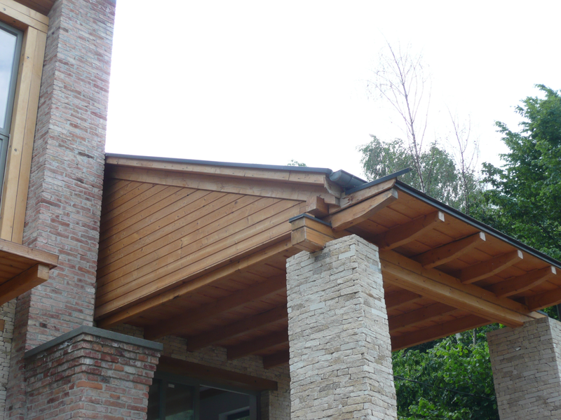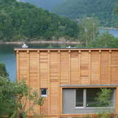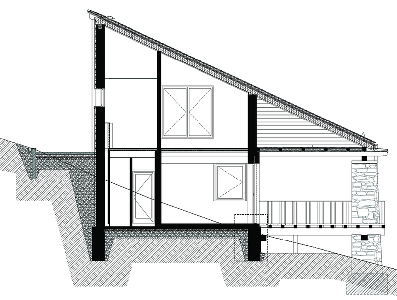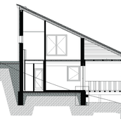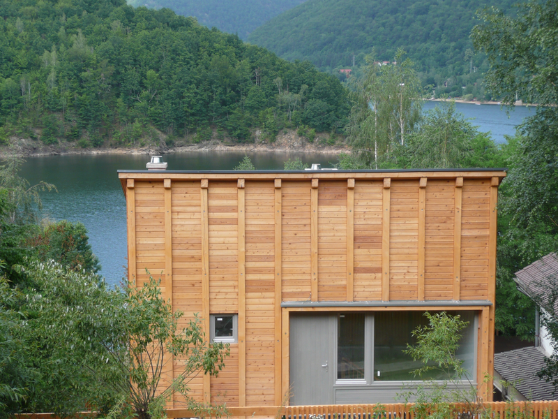 Pentru a ne integra in mediul inconjurător şi a nu genera un volum ieşit în evidenţă, panta acoperişului este paralelă cu terenul, doar coşul masiv şi lucarna rup orizontalitatea si generază un mic punct de observaţie la etaj. Cea mai apreciată zonă a casei este terasa acoperită, care în perioada de vară face parte din ansamblul living-bucătărie, dar totodata, se deschide spre exterior oferind panorame spre lac.