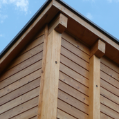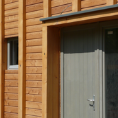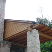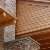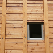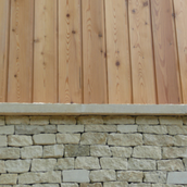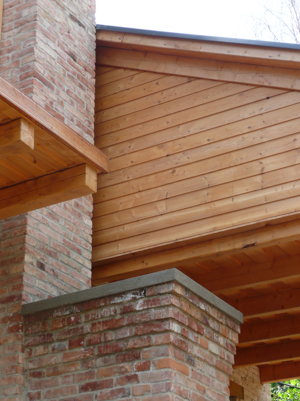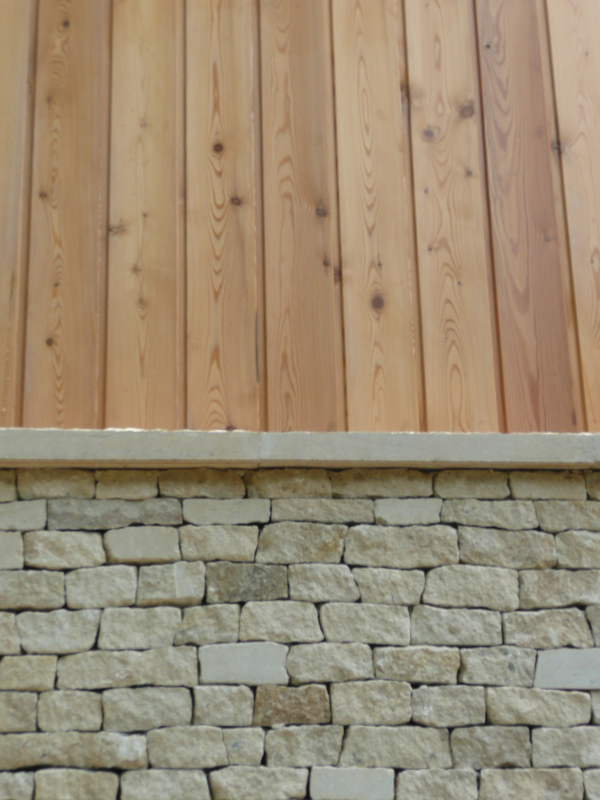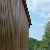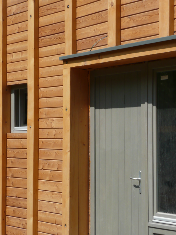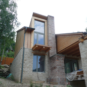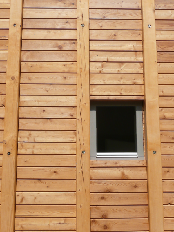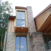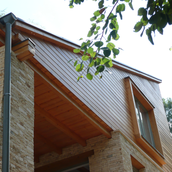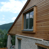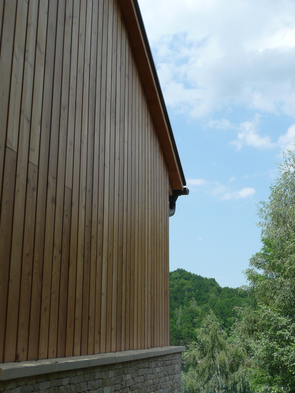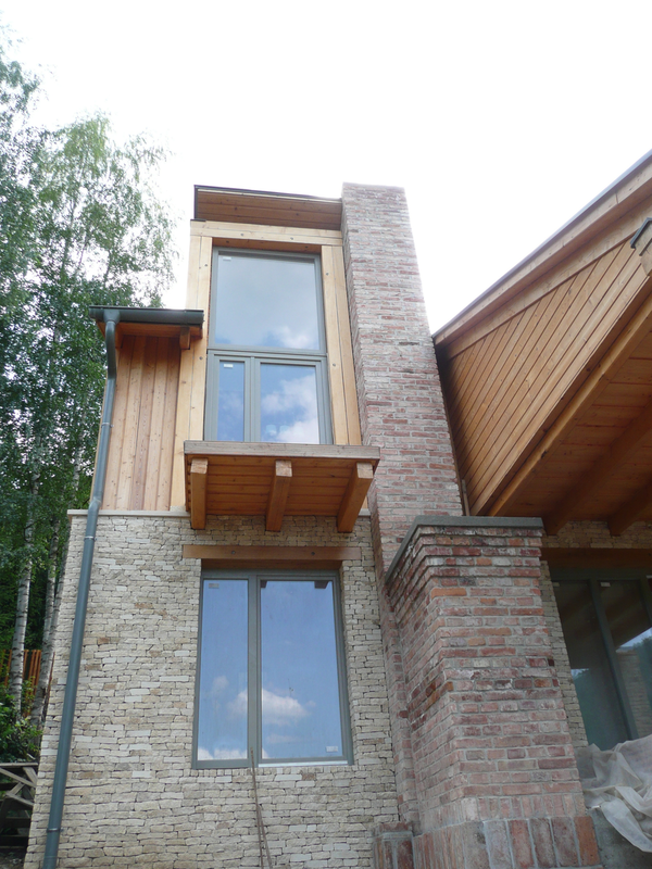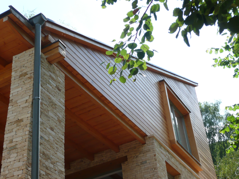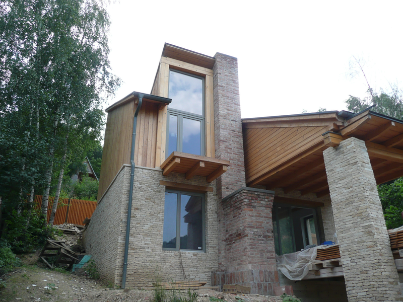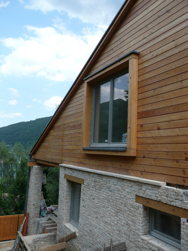 Exteriorul casei este finisat cu piatră de calcar in registrul parterului şi lemn aparent in rest. Coşul de fum şi zona de barbeque este zidit din caramidă refolosită.