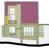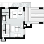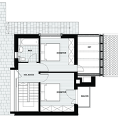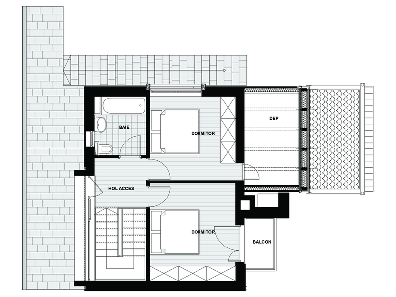 Nivelul superior adăposteşte cele două dormitoare dar şi accesul principal in casă.Această variantă a fost adoptată deoarece accesul pe proprietate se realizează din amonte. Nivelul inferior, semi- ingropat adăposteşte o baie, centrala termică, zona de zi alcătuită dintr-un spaţiu comun bucătărie minimală-living şi o terasă generoasă cu deschidere spre lac.