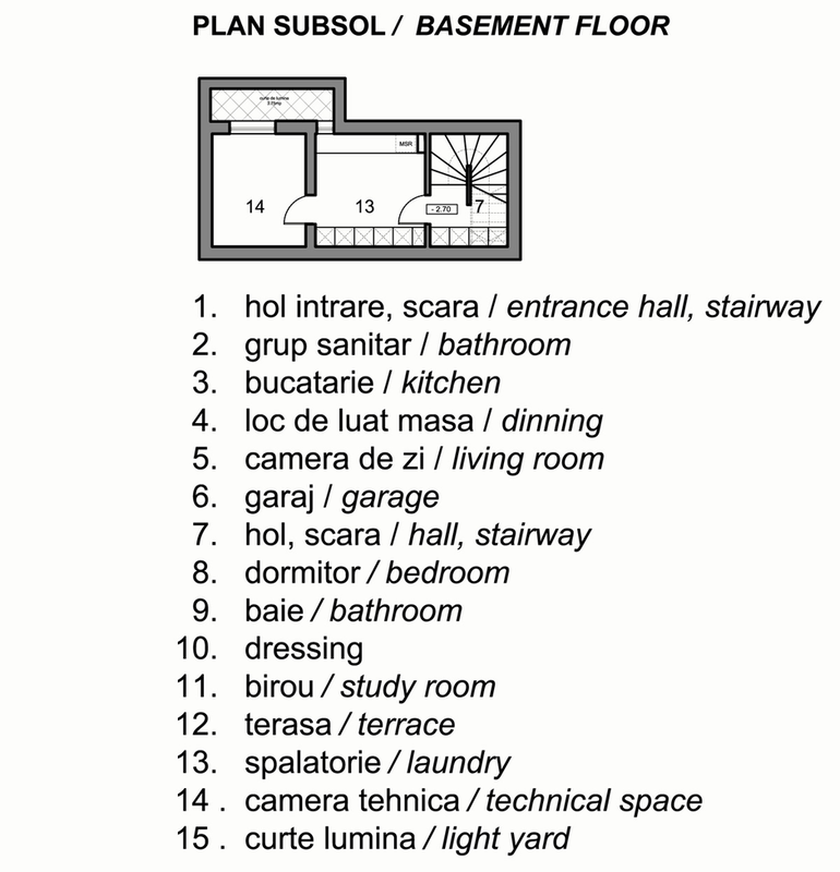 Subsolul, in suprafata construita de 48.75mp, este compus din centrala termica, ventilata natural cu ajutorul unei curti de lumina de 3.75mp, spatiu de depozitare, hol si scara acces parter.