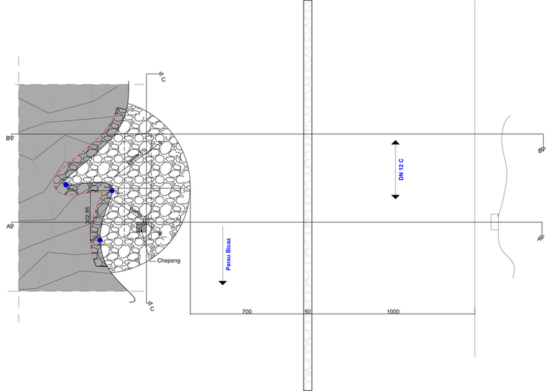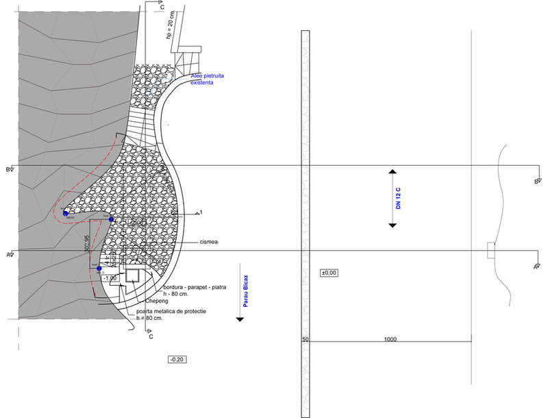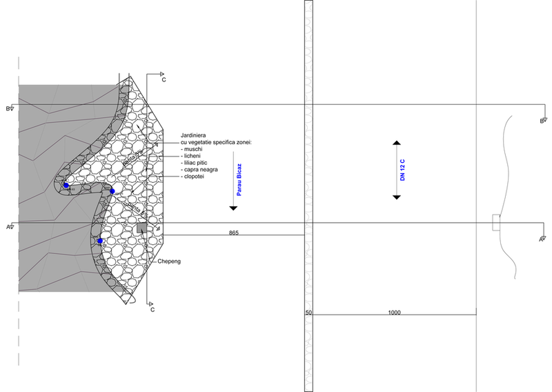 Solutia propusa in varianta V3 raspunde cel mai bine in cazul unor viituri istorice, prin amplasarea zonei de acces in constructie (captare)-a chepengului la o cota superioara fata de solutiile propuse in variantele anterioare. (1m sub cota DN12C);-riscul inundarii spatiilor cu instalatii fiind considerabil diminuat. Aceasta forma ritmeaza cu forma stancilor din imediata apropiere, precum si cu apa raului Bicaz. Impactul apei raului Bicaz in contact cu zidul de protectie este diminuat, prin descompunerea vectorului director- paraul -intr-o multime finita de vectori componenti.Zidul de protectie in forma lui eliptica este mai putin solicitat actiunii raului Bicaz dacait in varianta V2.