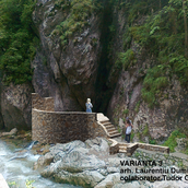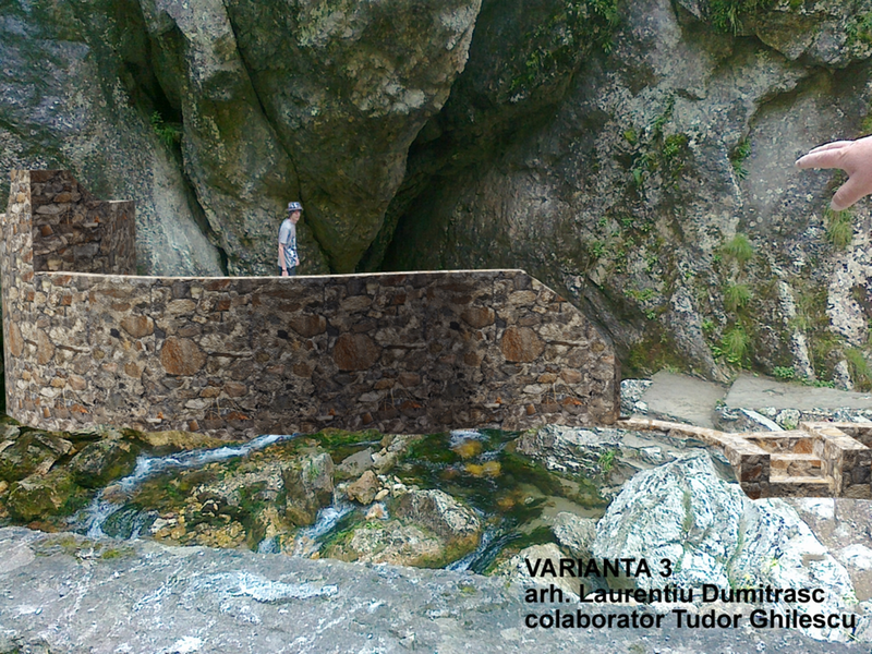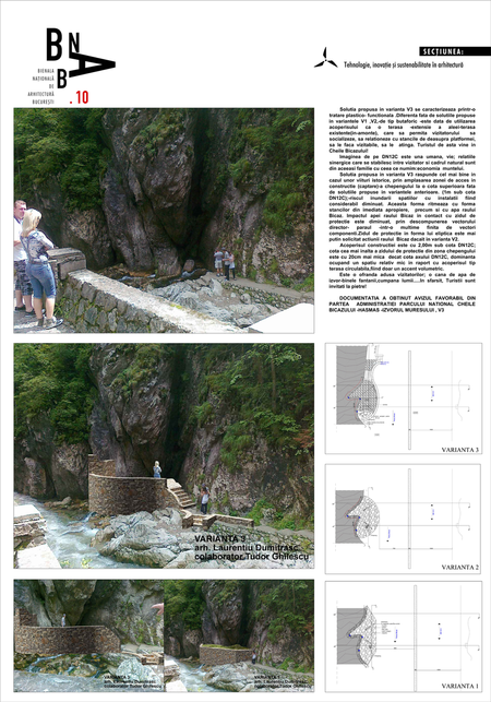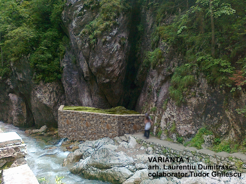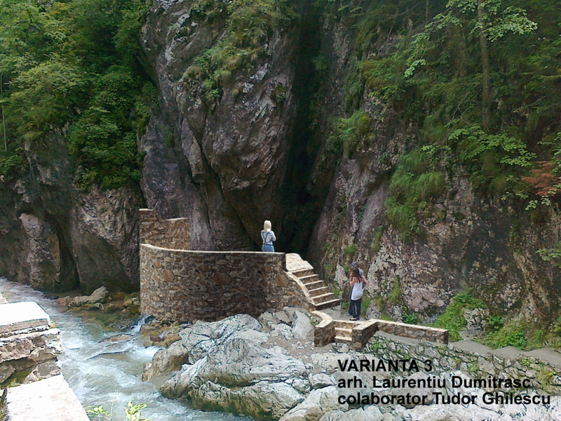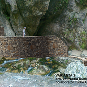 Solutia propusa in varianta V3 se caracterizeaza printr-o tratare plastico- functionala .Diferenta fata de solutiile propuse in variantele V1 ,V2,-de tip butaforic -este data de utilizarea acoperisului ca o terasa -extensie a aleei-terasa existente(in-amonte), care sa permita vizitatorului sa socializeze, sa relationeze cu stancile de deasupra platformei, sa le faca vizitabile, sa le atinga. Turistul de asta vine in Cheile Bicazului!