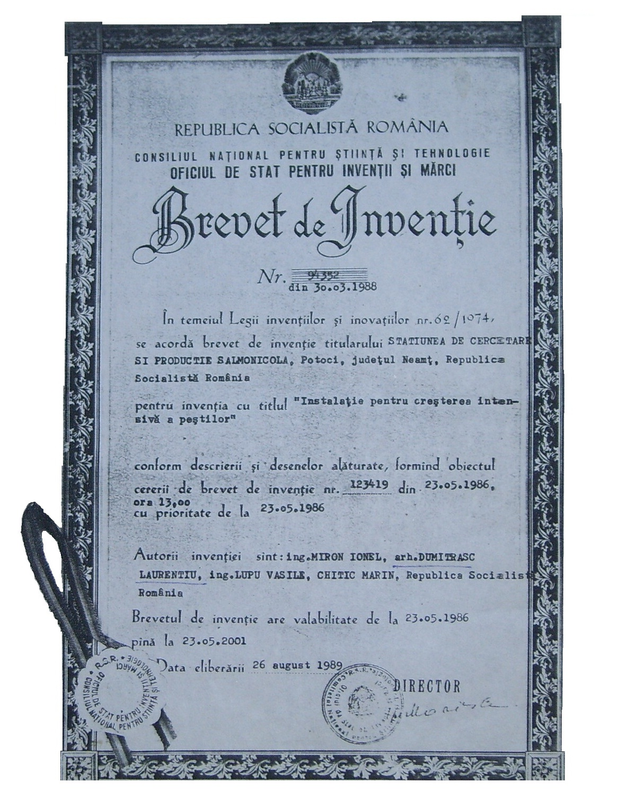 1986 Metoda pentru cresterea pestilor si instalatia pentru aplicarea metodei –Steaua de mare/documentatie depusa la O.S.I.M. pentru brevetare in 1984;prototipul este executat la Statiunea Salmonicola Potoci; receptia finala :octombrie,1986;autor+colectiv. Brevetul de Inventator nr. 94352 din 30.03.1988.