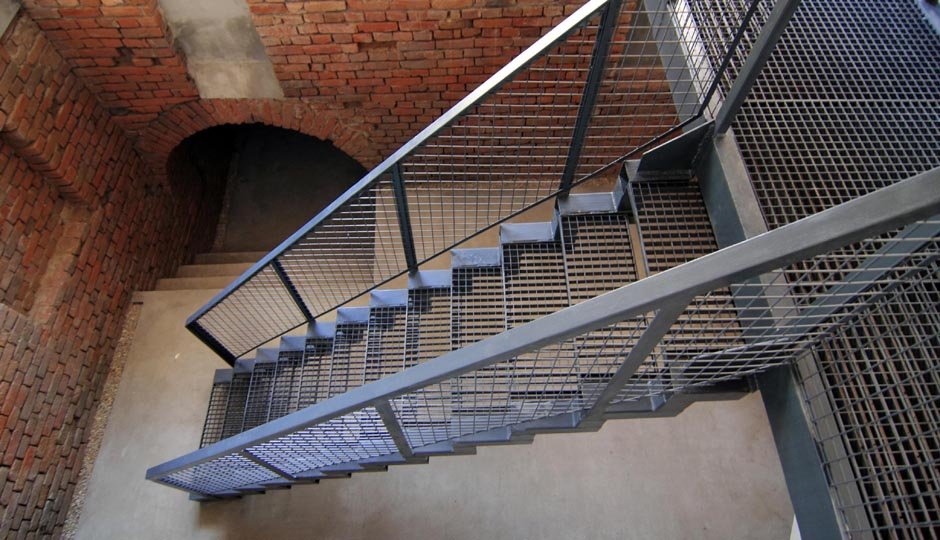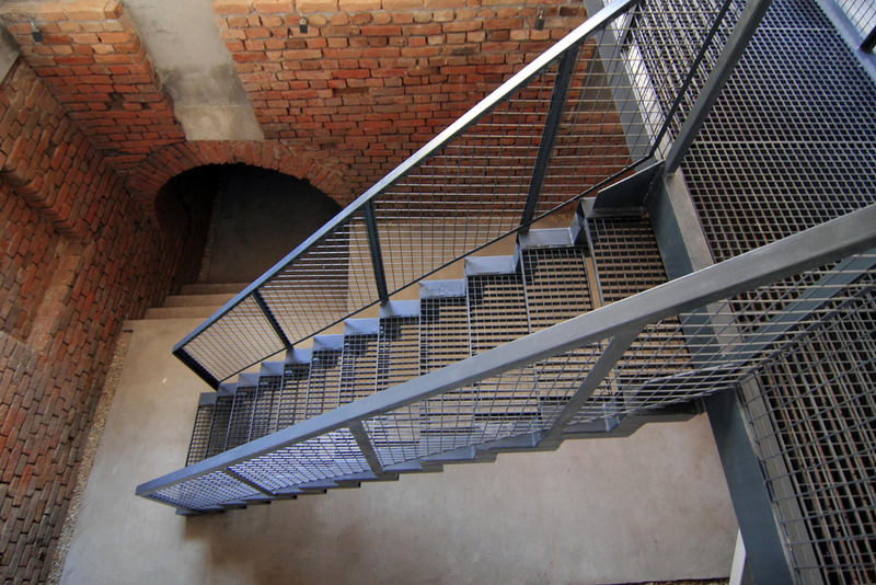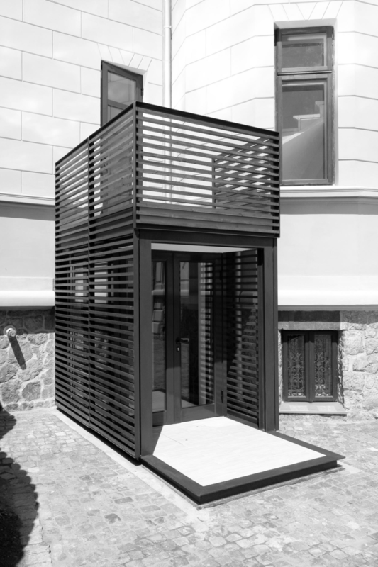 Scara de acces la nivelul inferior, balustrada de la nivelul parterului şi pasarela care traversează subsolul şi leagă interiorul de grădină compun un obiect metalic continuu care aduce împreună toate punctele de interes ale clădirii originale. Sistemul grafic transparent al noilor intervenţii (obloane, elemente metalice) se detaşează de arhitectura de plinuri a clădirii originale.