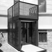 A fost tratată conform aceloraşi principii. Din motive funcţionale, în zona scării interioare de acces în demisol, a fost amplasată o porţiune de pasarelă metalică transparentă. Piesa metalică preia structura şi materialele folosite pentru pasarela şi scara din anexă.