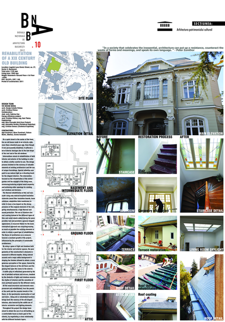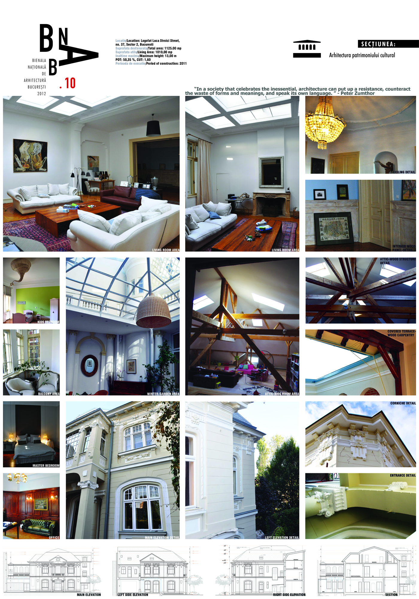 Intervenţiile au vizat reabilitarea interioară si exterioară a clădirii, în scopul de a obţine un confort mai bun în utilizare. Procesul de proiectare a insistat pe recuperarea elementelor valoroase ale arhitecturii existente şi utilizarea mobilierului unicat. O atenţie deosebită a fost acordată utilizării luminii naturale ca o modalitate de a vibra interioarele elegante. Intervenţie s-a axat pe reabilitarea serei, a luminatorului pietonal de peste camera de zi, pe recuperarea/ restaurarea tamplăriei originale din lemn şi pe operarea unor deschideri mai mari pentru ferestrelor de mansardă şi lucarnele existente.