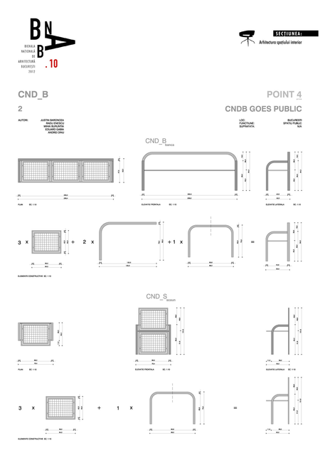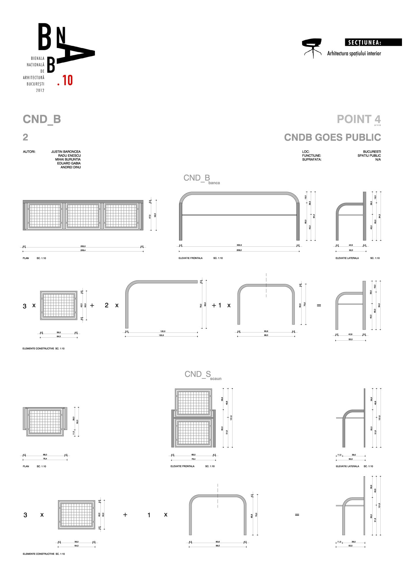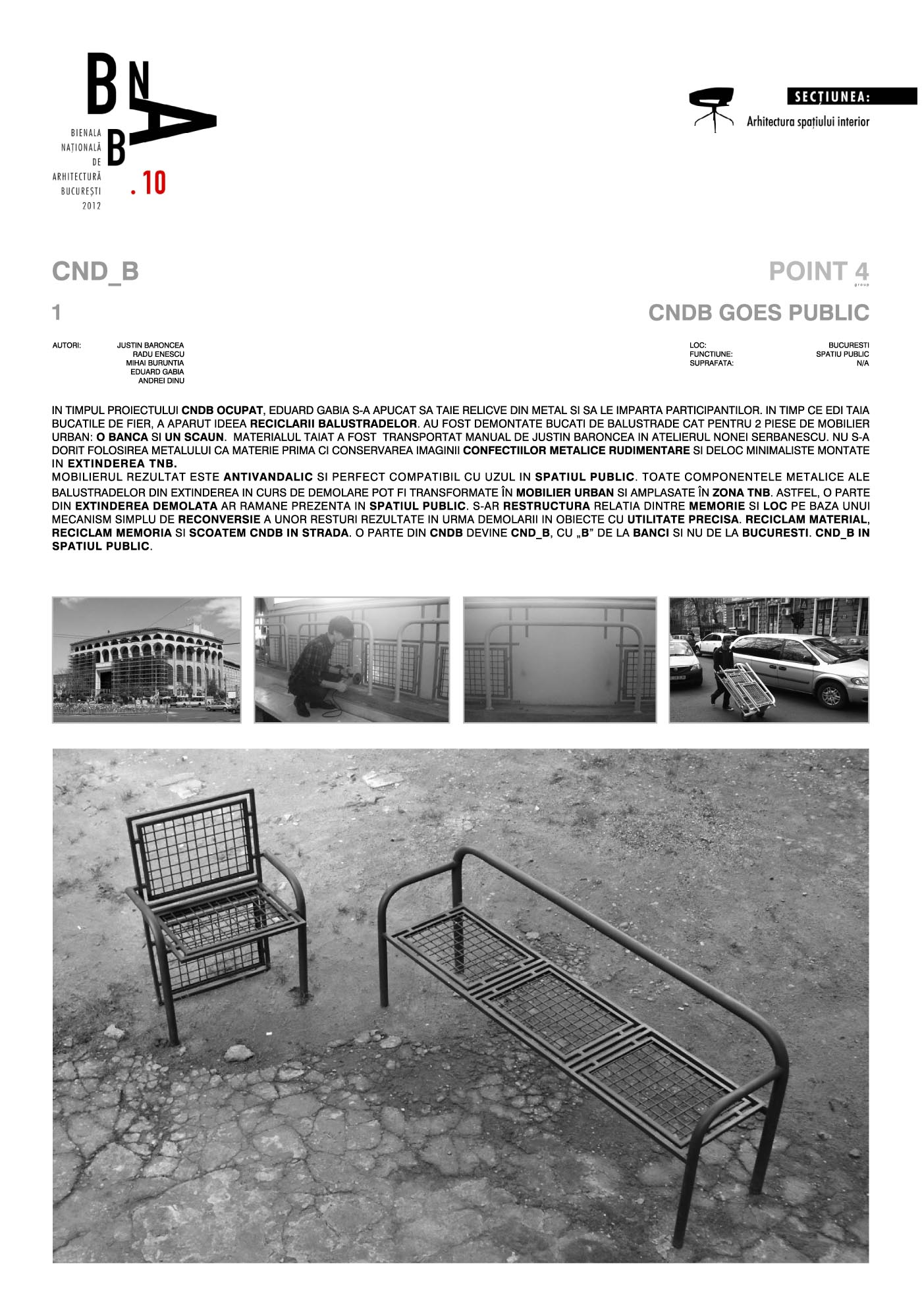 Mobilierul rezultat este antivandalic si perfect compatibil cu uzul in spatiul public. Toate componentele metalice ale balustradelor din extinderea in curs de demolare pot fi transformate în mobilier urban si amplasate în zona Tnb. Astfel, o parte din extinderea demolata ar ramane prezenta in spatiul public. S-ar restructura relatia dintre memorie si loc pe baza unui mecanism simplu de reconversie a unor resturi rezultate in urma demolarii in obiecte cu utilitate precisa. Reciclam material, reciclam memoria si scoatem Cndb in strada. O parte din Cndb devine Cnd_b, cu „b” de la banci si nu de la Bucuresti. Cnd_b in spatiul public.
