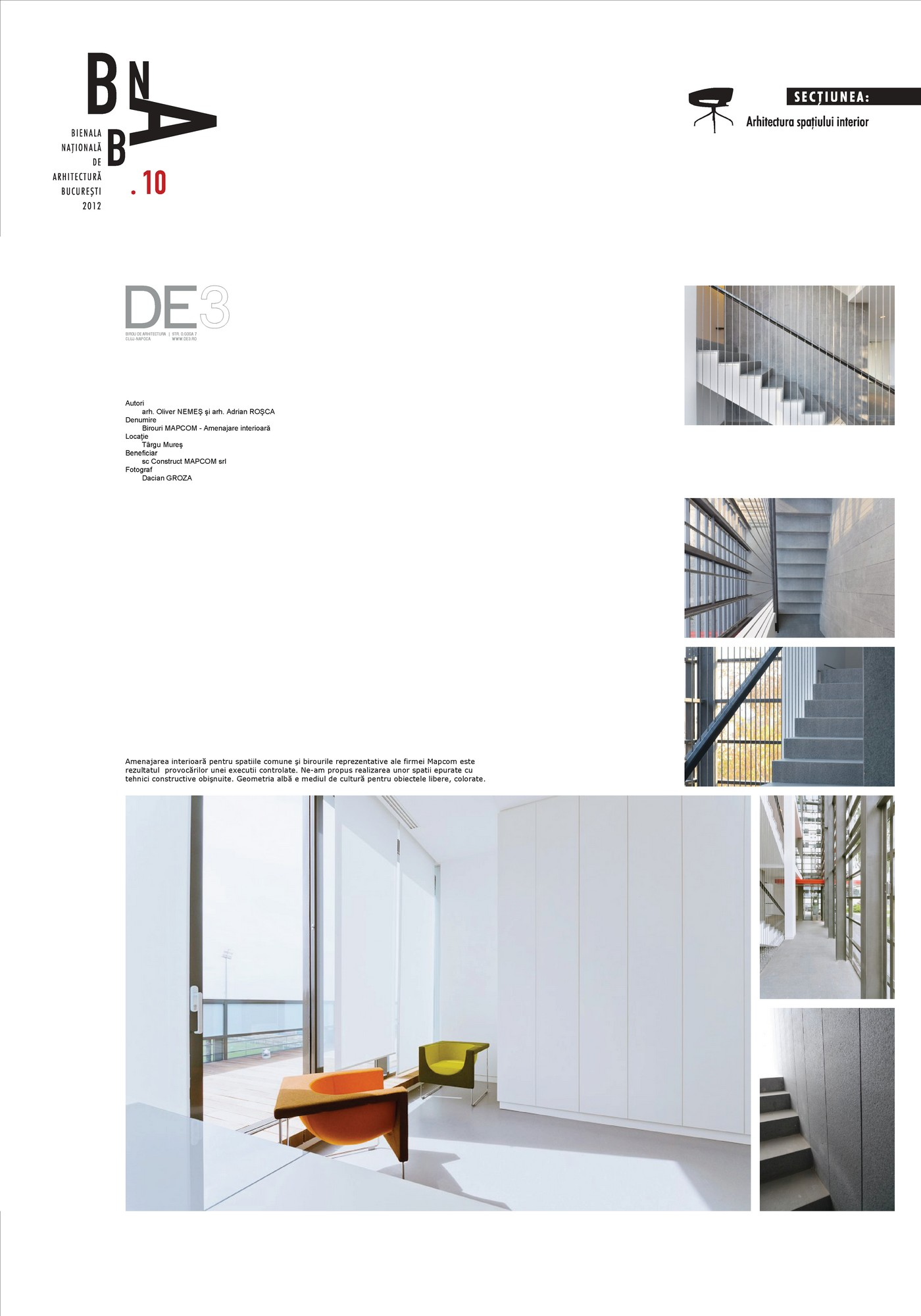 Amenajarea interioara pentru spatiile comune si birourile reprezentative ale firmei Mapcom este rezultatul provocarilor unei executii controlate. Ne-am propus realizarea unor spatii epurate cu tehnici constructive obisnuite. Geometria alba e mediul de cultura pentru obiectele libere, colorate.