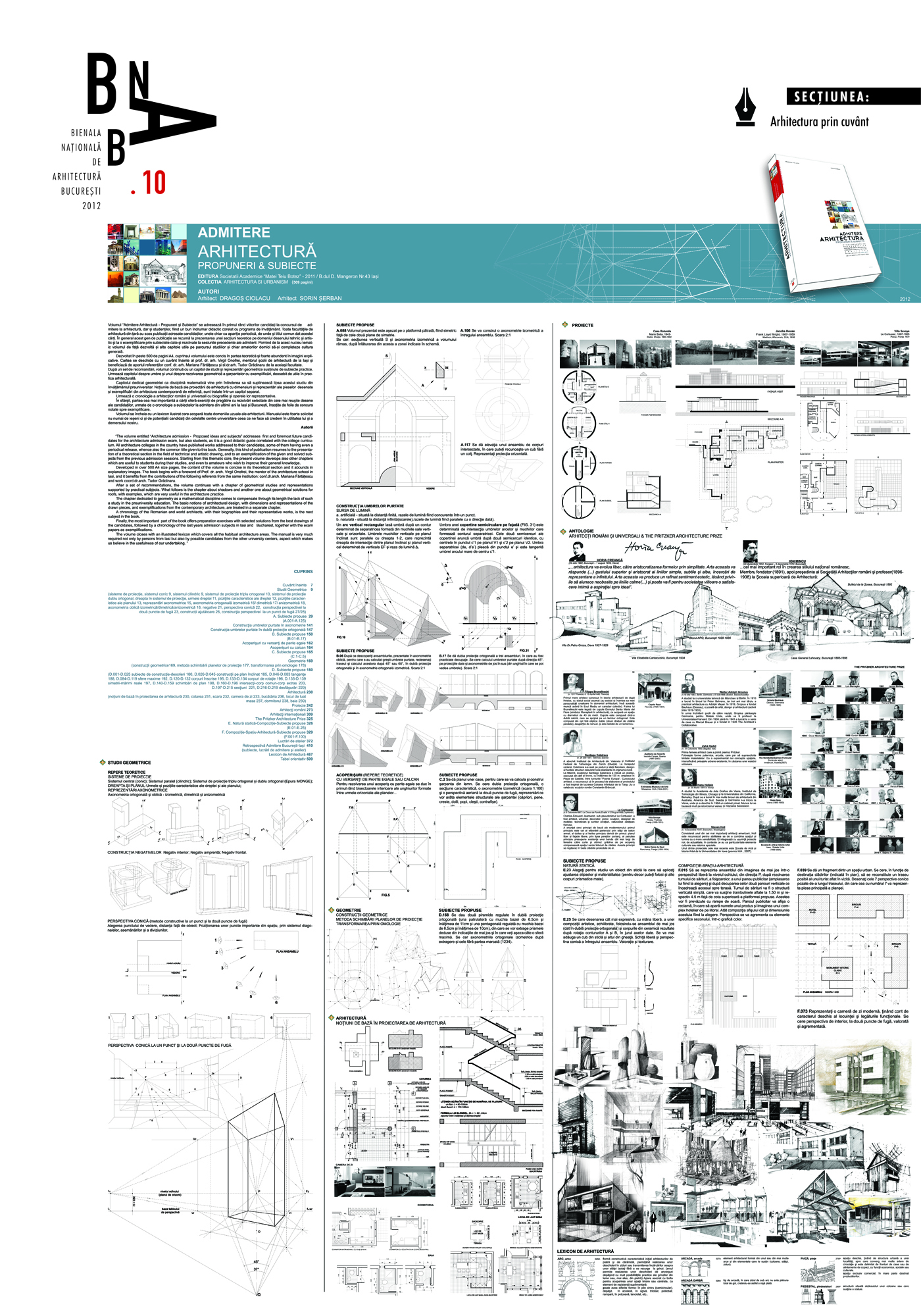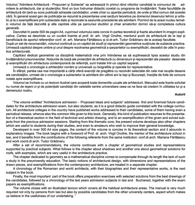 Volumul “Admitere Arhitectură - Propuneri şi Subiecte” se adresează în primul rând viitorilor candidaţi la concursul de admitere la arhitectură, dar şi studenţilor, fiind un bun îndrumar didactic corelat cu programa de învăţământ. Toate facultăţile de arhitectură din ţară au scos publicaţii adresate candidaţilor, unele chiar cu apariţie periodică, de unde şi titlul comun dat acestei cărţi. În general acest gen de publicaţie se rezumă la prezentarea unei secţiuni teoretice pe domeniul desenului tehnic şi artistic şi la o exemplificare prin subiectele date şi rezolvate la sesiunile precedente ale admiterii. Pornind de la acest nucleu tematic volumul de faţă dezvoltă şi alte capitole utile pe parcursul studiilor şi chiar amatorilor dornici să-şi completeze cultura generală.