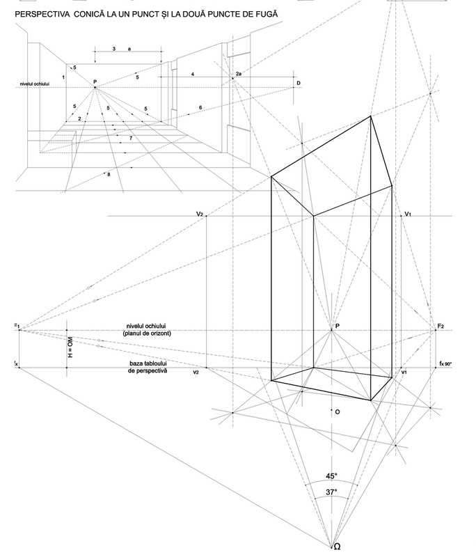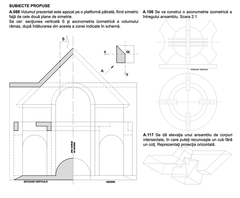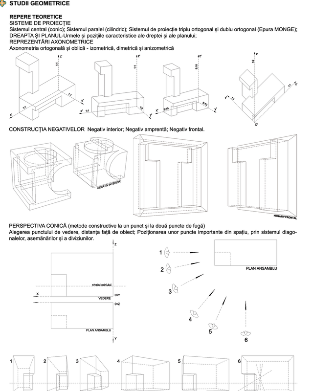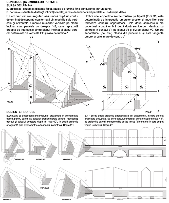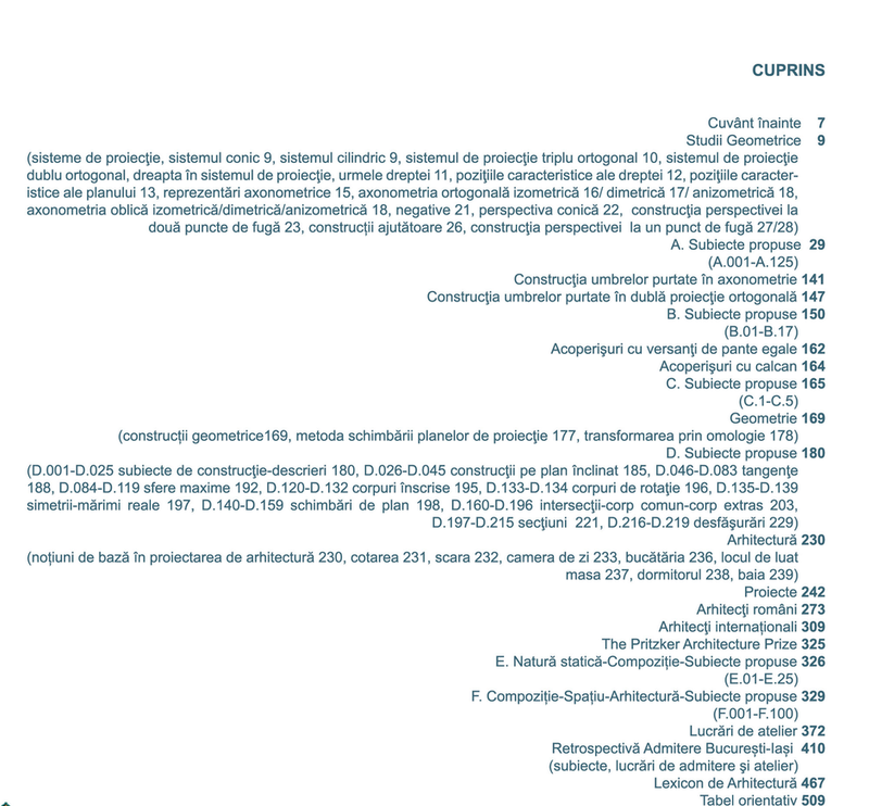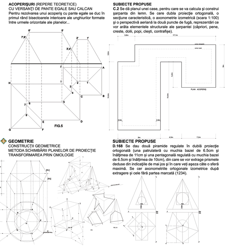 După un set de recomandări, volumul continuă cu un capitol de studii şi reprezentări geometrice susţinute de subiecte practice. Urmează capitolul despre umbre şi unul despre rezolvarea geometrică a şarpantelor cu exemplificări, deosebit de utile în practica arhitecturală.