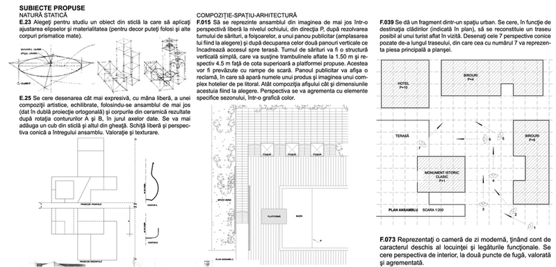 În sfârşit, partea cea mai importantă a cărţii oferă exerciţii de pregătire cu rezolvări selectate din cele mai reuşite desene ale candidaţilor, urmate de o cronologie a subiectelor la admitere din ultimii ani la Iaşi şi Bucureşti, însoţite de foile de concurs notate spre exemplificare.