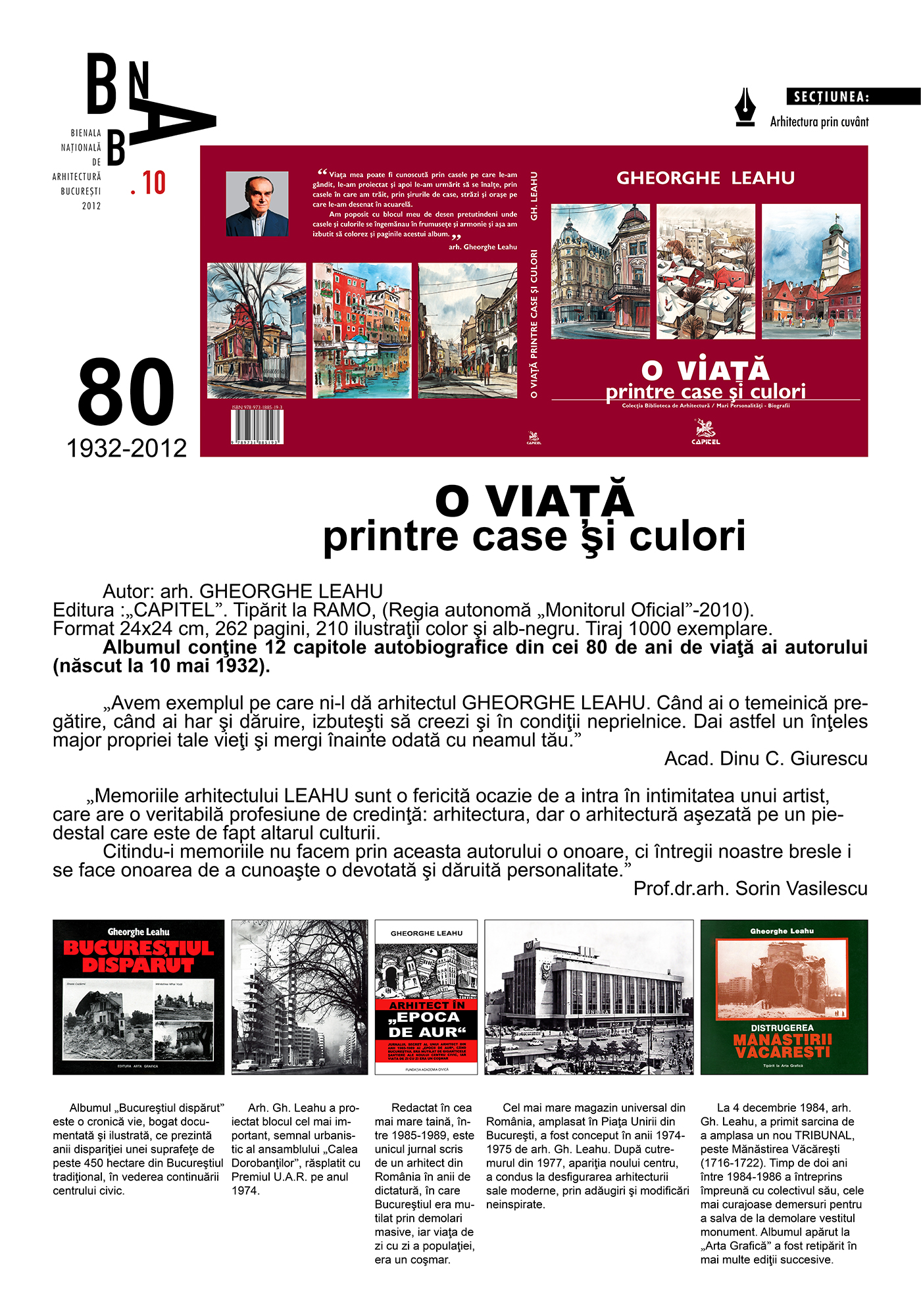 Albumul intitulat „O VIAŢĂ PRINTRE CASE ŞI CULORI„ dezvoltă cele doua repere şi pasiuni ale existenţei sale: casele şi culorile. După cum menţionează în prefaţă, din casele pe care le-a proiectat şi-a asigurat împlinirea profesională, iar culorile acuarelelor adunate în albume, reprezintă popasurile prin care a încercat sa transforme pe colile albe de hârtie, comorile de arhitectură ale României.