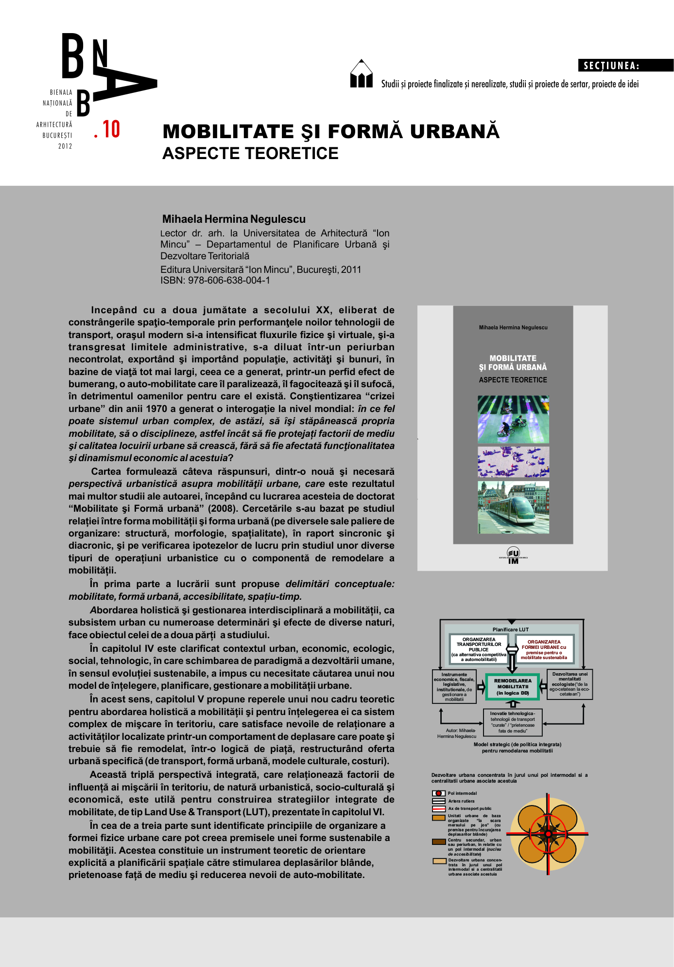 Mobilitatea este, prin complexitate şi importanţă, o trăsătură definitorie a marilor “oraşe-flux” contemporane. Numeroasele determinări şi efecte pe care aceasta le are în diversele domenii ale existenţei umane - social, economic, mediu fizic şi natural – au impus trecerea la o abordare holistică a sistemelor de mişcare în teritoriile urbane. Noi politici integrate -LandUse&Transport - vizează gestionarea mobilităţii în logica durabilităţii. În acest sens, organizarea formei urbane trebuie să se facă ţinând cont de un set de principii care să creeze premisele unei mobilităţi sustenabile.
