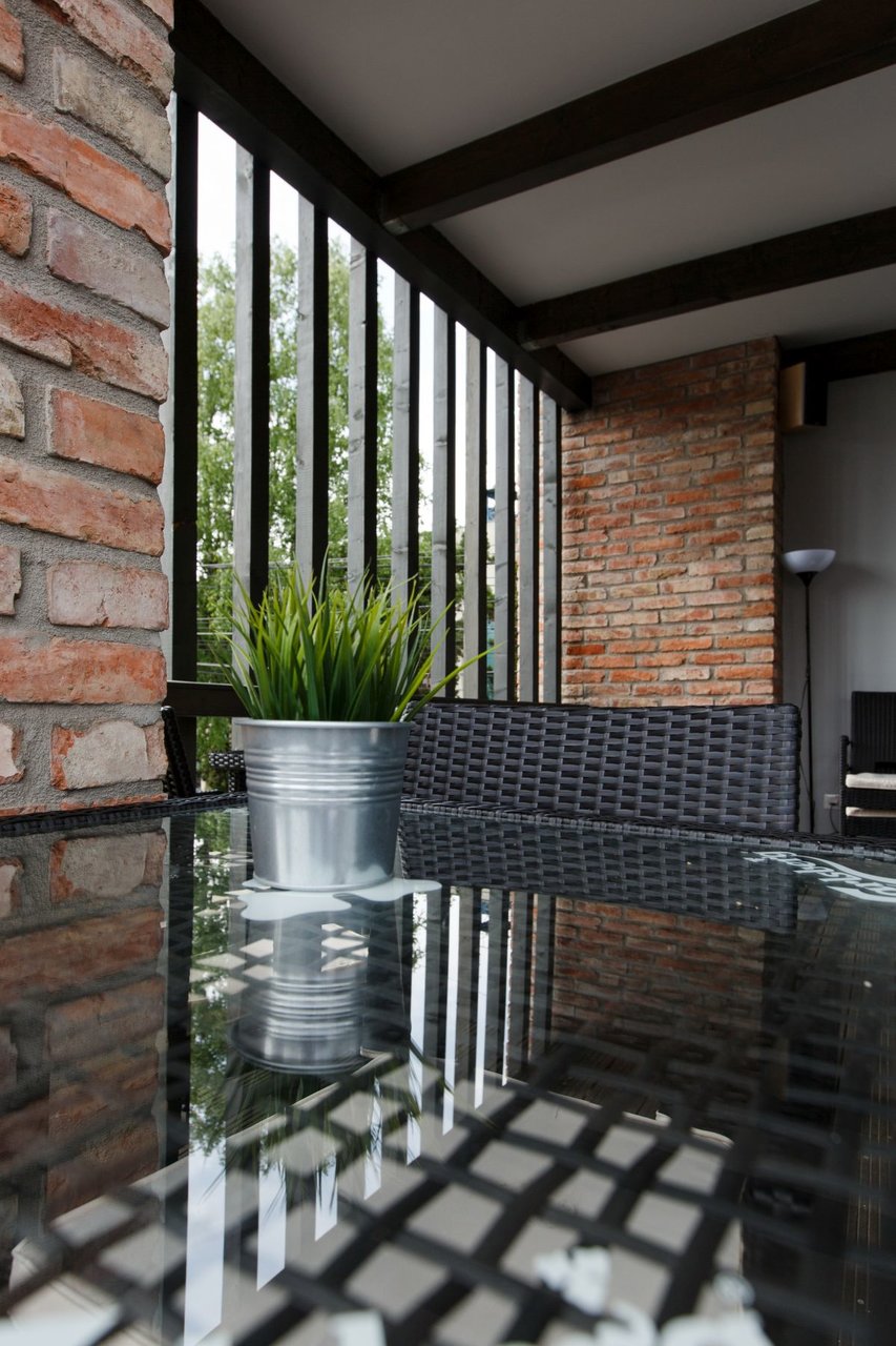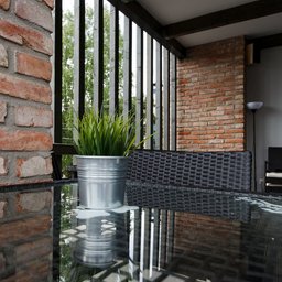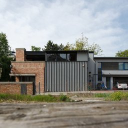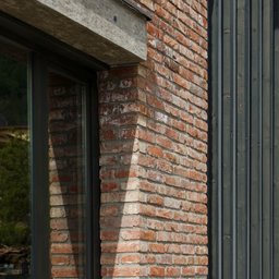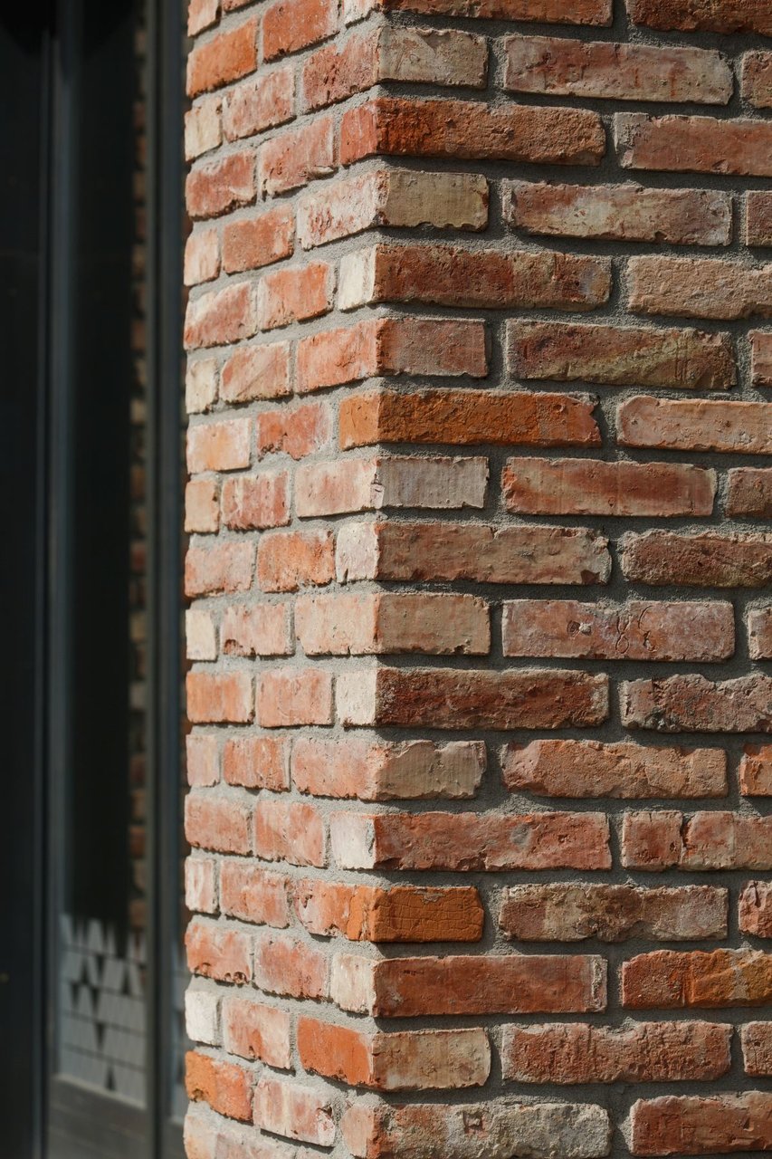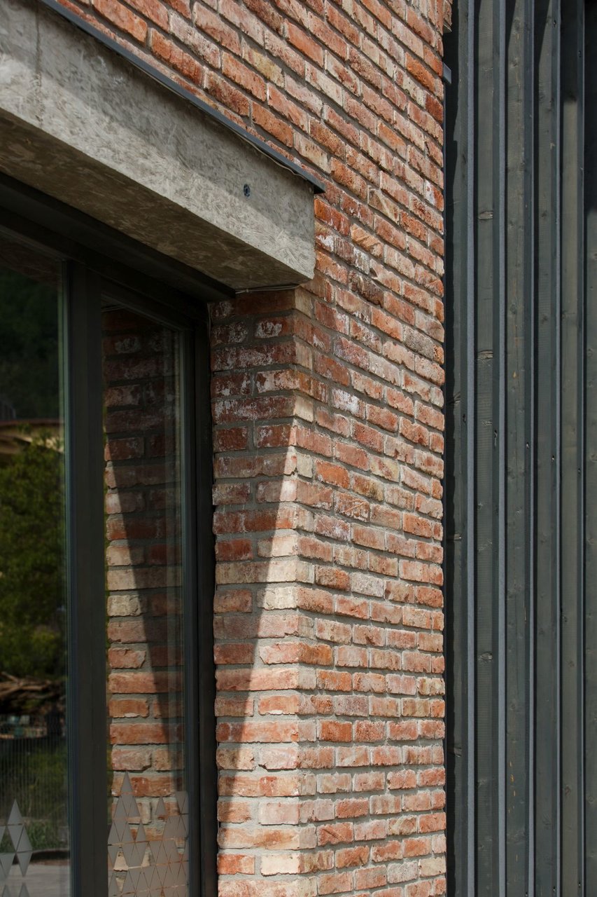 Spațiul clădirii este o prismă construită între doi stâlpi masivi de cărămidă. Fațada laterală este parțial tencuită cu un grilaj de lemn care întră în relație cu fațada de la stradă și cu interioarele.
