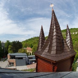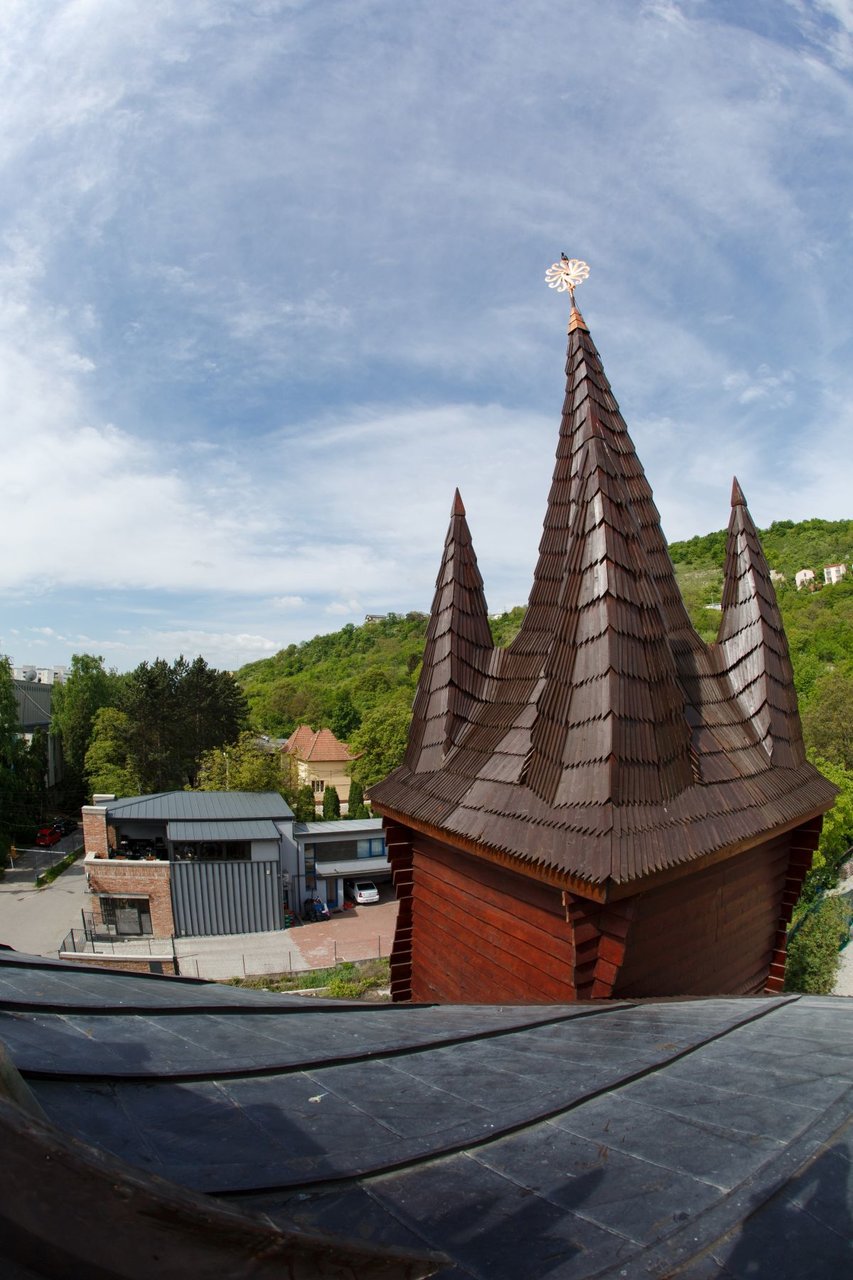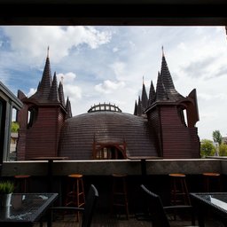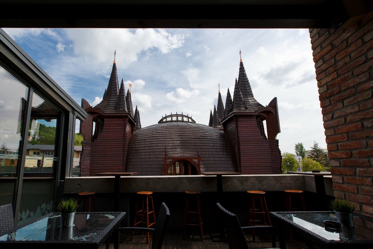 Clădirea cu compoziție sureală a lui Makovecz nu poate oferi un sol fertil, numai un accent cu influențe puternic asimetrice, își cere spațiul propriu, universul său privat într-un sit existent trist. Din această cauză limbajul arhitectural folosit la cafenea este neutră, se renunță la citate. Are o compoziție mai degrabă geometrică, arată cărămida, betonul aparent, lemnul. Culorile sunt bine alese, culoarea roșiatică al cărămizii este contrastată de accente de betoane aparente brute și cu grilaje de lemn vopsite într-o culoare gri- verzui.