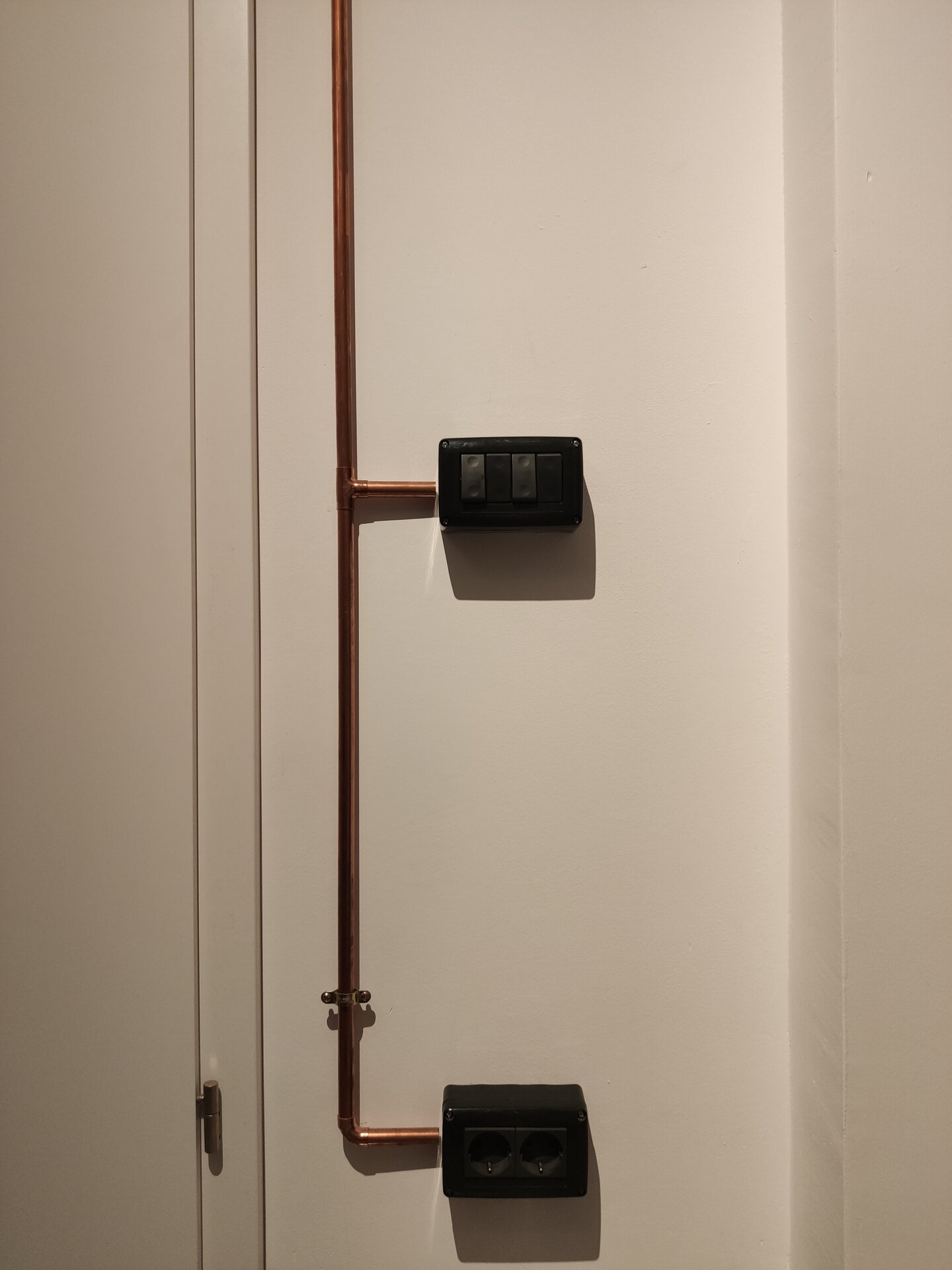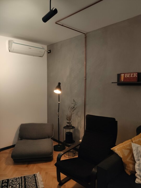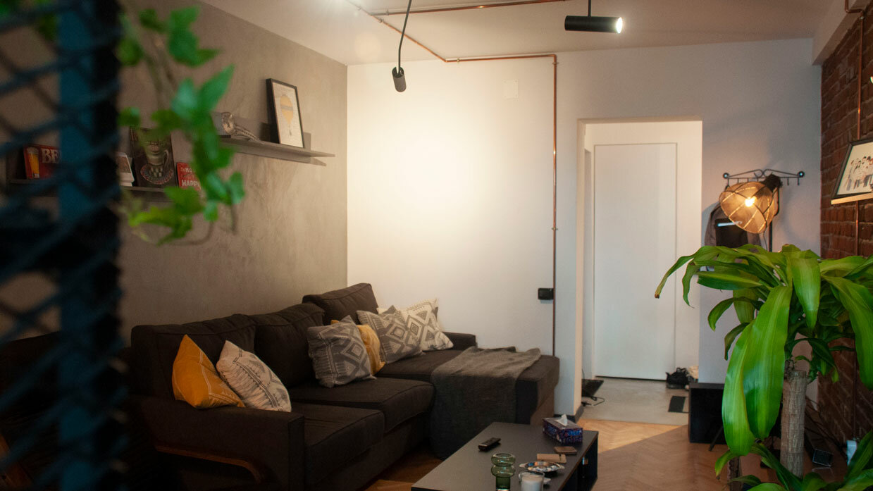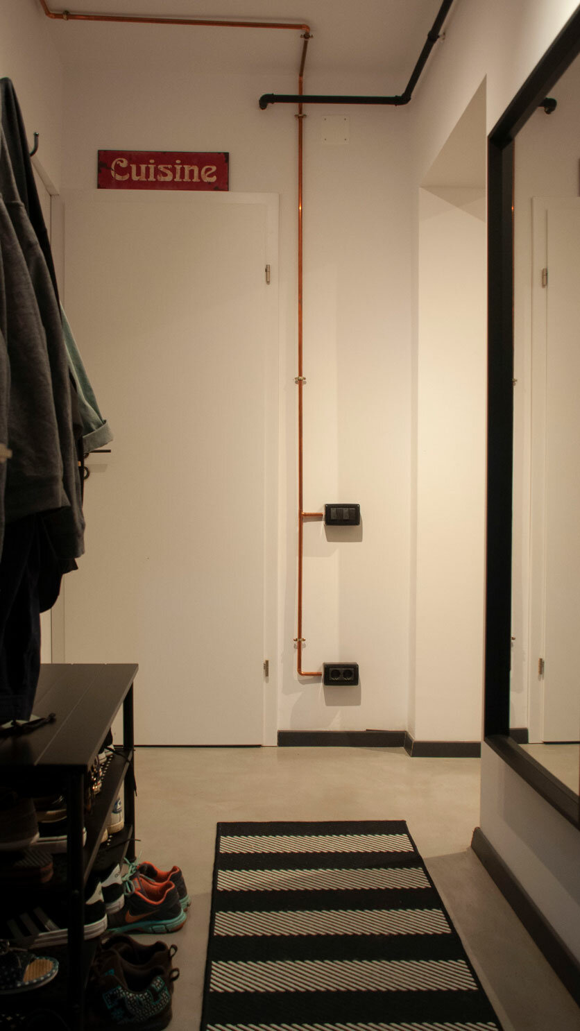 Amenajarea a început prin decopertarea pereților pentru a fi ranforsați și pentru că blocul este construit pe o structură de zidărie din cărămidă, am dorit să o punem in valoare, lăsând-o la vedere.