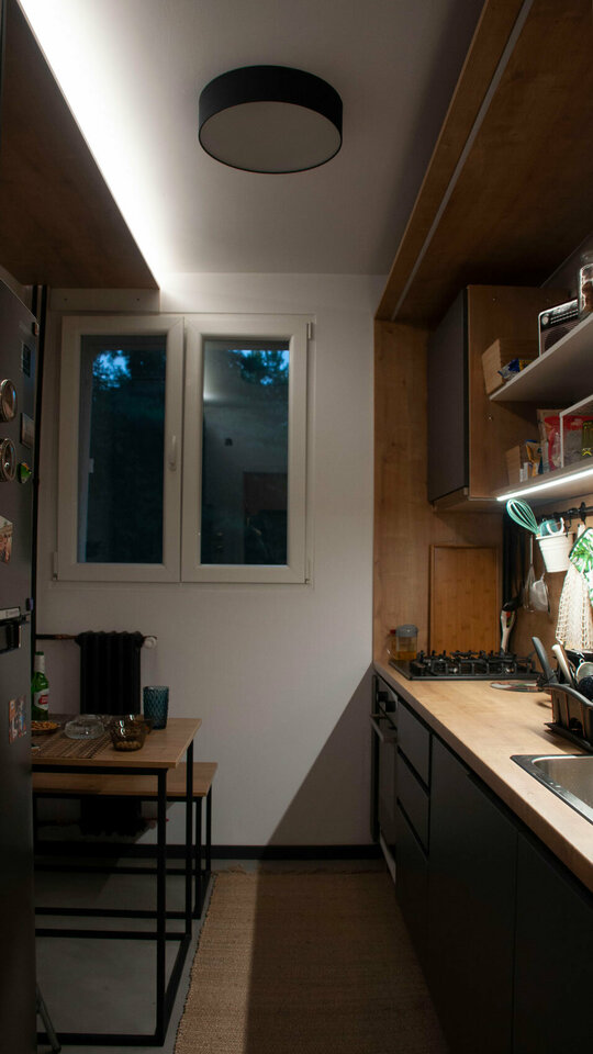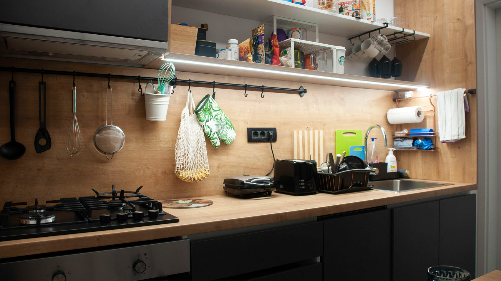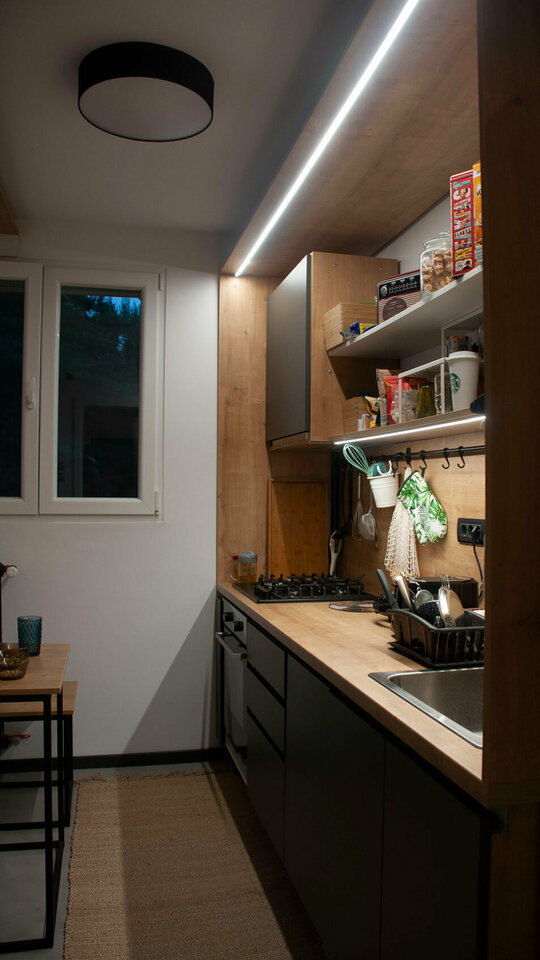 Bucataria a fost facuta la comanda, dupa desenele noastre. Astfel am creat o bucatarie pe doua fronturi, zona de lucu si spatiul de luat masa. Frontul de lucru este gandit pentru stilul de viata actual, avand toate utilitatile, dar cu o estetica deosebita, minimalista.
