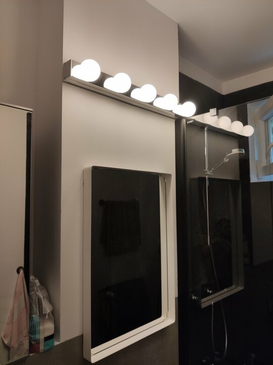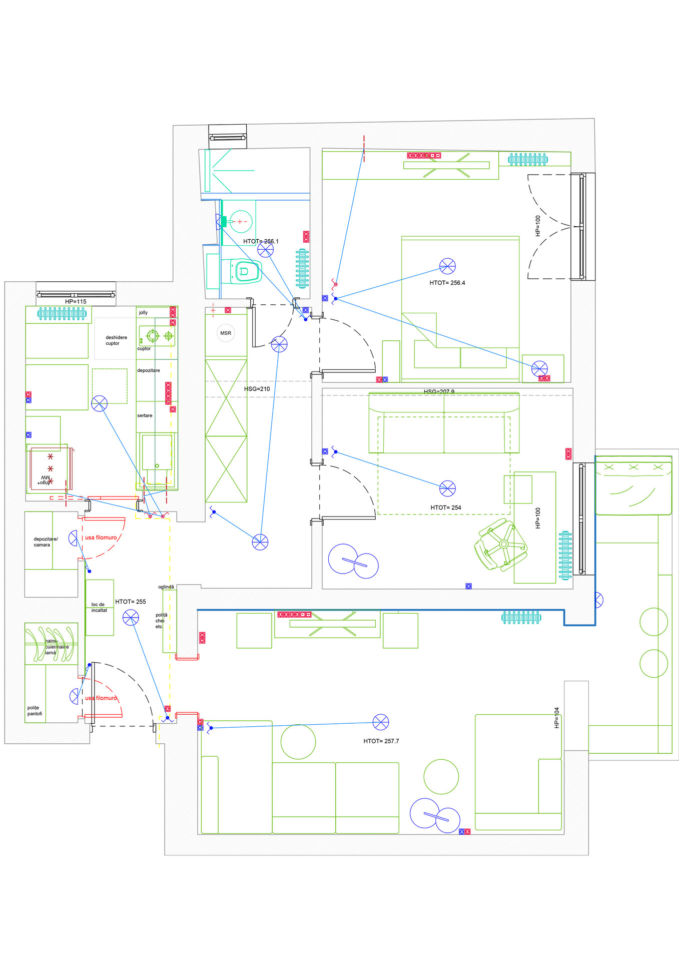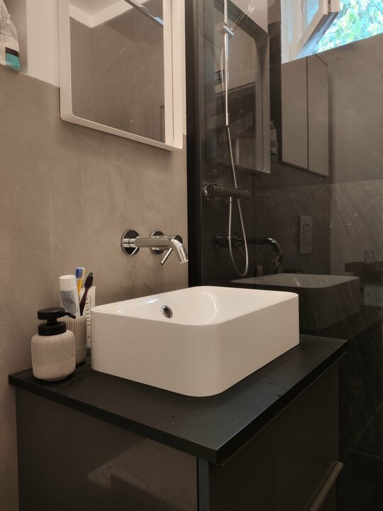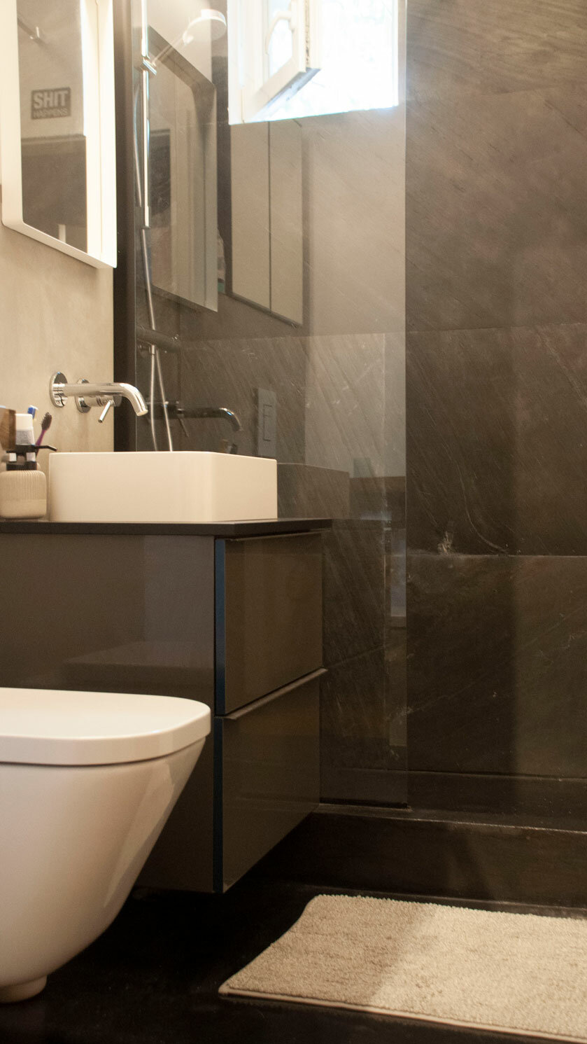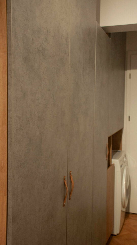 La nivelul pardoselilor ne-am confruntat cu mozaicul turnat pe zonele de trafic (hol, bucătărie, baie) și cu parchet din lemn masiv montat tip brăduț. În această situație, am fost nevoiți să găsim o soluție cât mai practică și puțin costisitoare, pentru a păstra pardoseala la același nivel în tot apartamentul. Soluția noastră pentru zona de mozaic turnat a fost microcimentul , care are o grosime de 3mm și o viață foarte lunga, și pentru ca se poate repara local, sau covorul PVC, care este un finisaj cald cu o rezistentă bună la trafic. Am ales microcimentul, accentuând stilul industrial și in hol, bucătărie si baie. Parchetul a fost recondiționat (rașchetat si lăcuit mat).