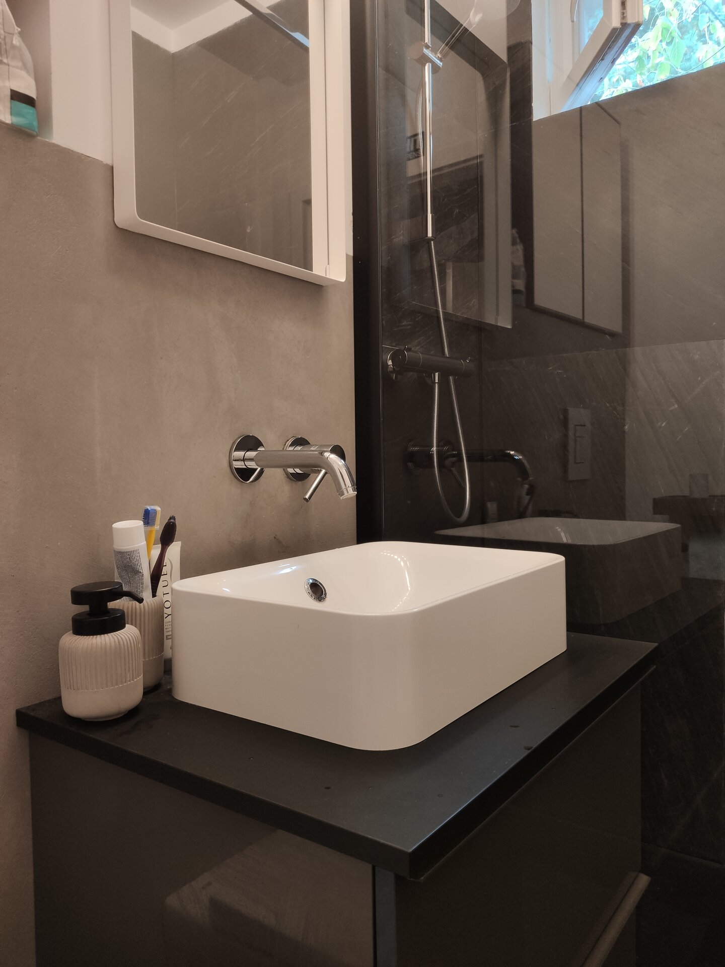 La nivel de mobilier, ne-am dorit câteva elemente metalice și textura de beton, care sa devina laitmotivul acestei amenajări.