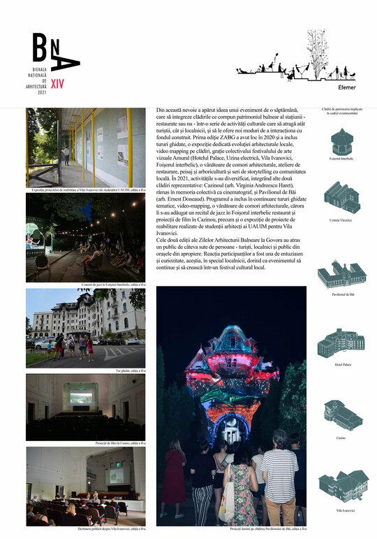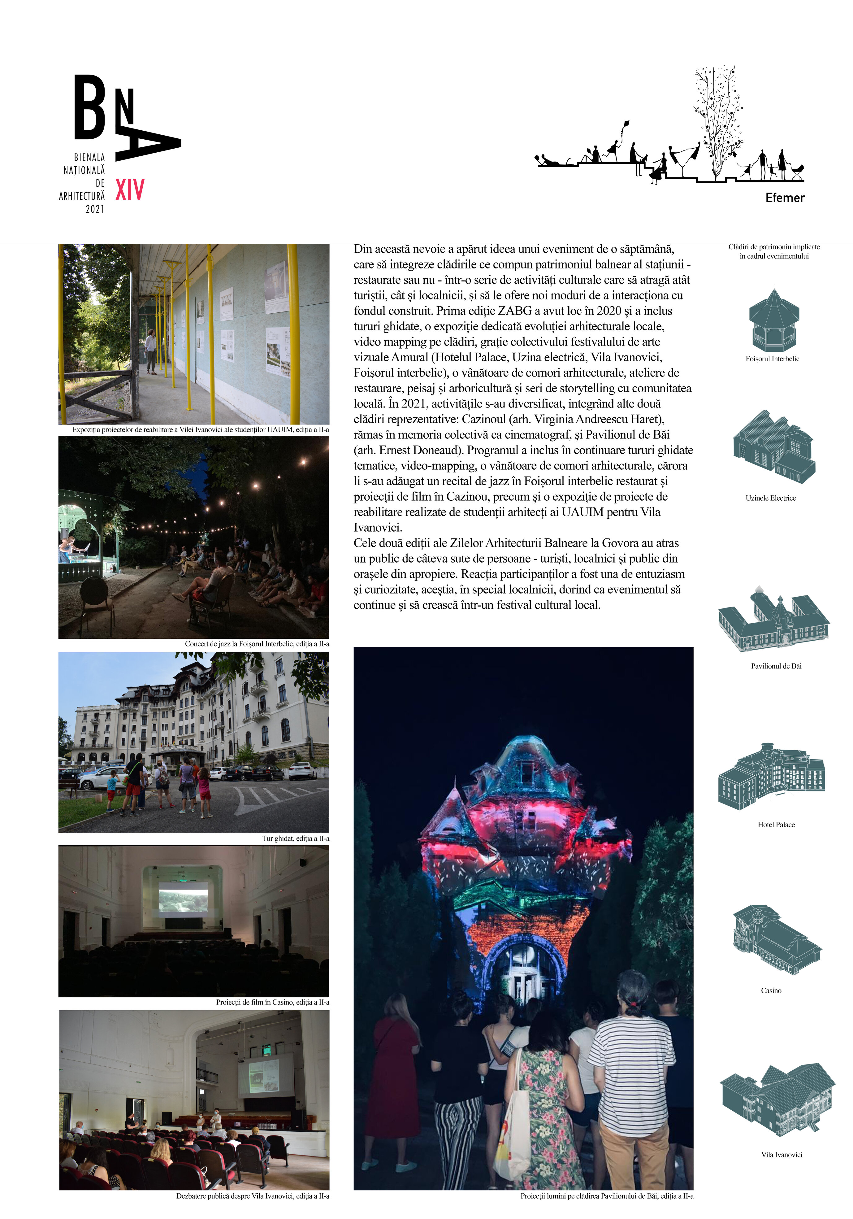 Din această nevoie a apărut ideea unui eveniment de o săptămână, care să integreze clădirile ce compun patrimoniul balnear al stațiunii - restaurate sau nu - într-o serie de activități culturale care să atragă atât turiștii, cât și localnicii, și să le ofere noi moduri de a interacționa cu fondul construit. Prima ediție ZABG a avut loc în 2020 și a inclus tururi ghidate, o expoziție dedicată evoluției arhitecturale locale, video mapping pe clădiri, grație colectivului festivalului de arte vizuale Amural (Hotelul Palace, Uzina electrică, Vila Ivanovici, Foișorul interbelic), o vânătoare de comori arhitecturale, ateliere de restaurare, peisaj și arboricultură și seri de storytelling cu comunitatea locală. În 2021, activitățile s-au diversificat, integrând alte două clădiri reprezentative: Cazinoul (arh. Virginia Andreescu Haret), rămas în memoria colectivă ca cinematograf, și Pavilionul de Băi (arh. Ernest Doneaud). Programul a inclus în continuare tururi ghidate tematice, video-mapping, o vânătoare de comori arhitecturale, cărora li s-au adăugat un recital de jazz în Foișorul interbelic restaurat și proiecții de film în Cazinou, precum și o expoziție de proiecte de reabilitare realizate de studenții arhitecți ai UAUIM pentru Vila Ivanovici.
