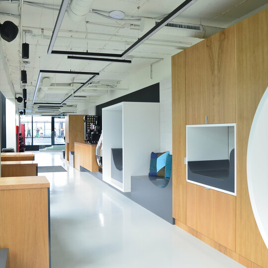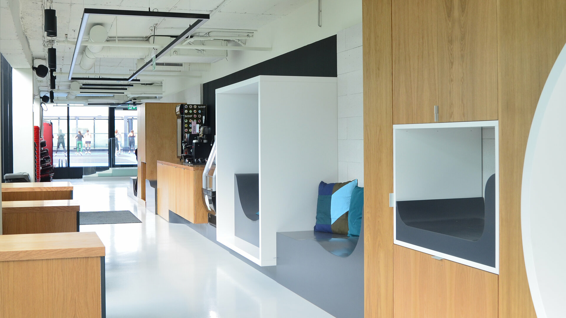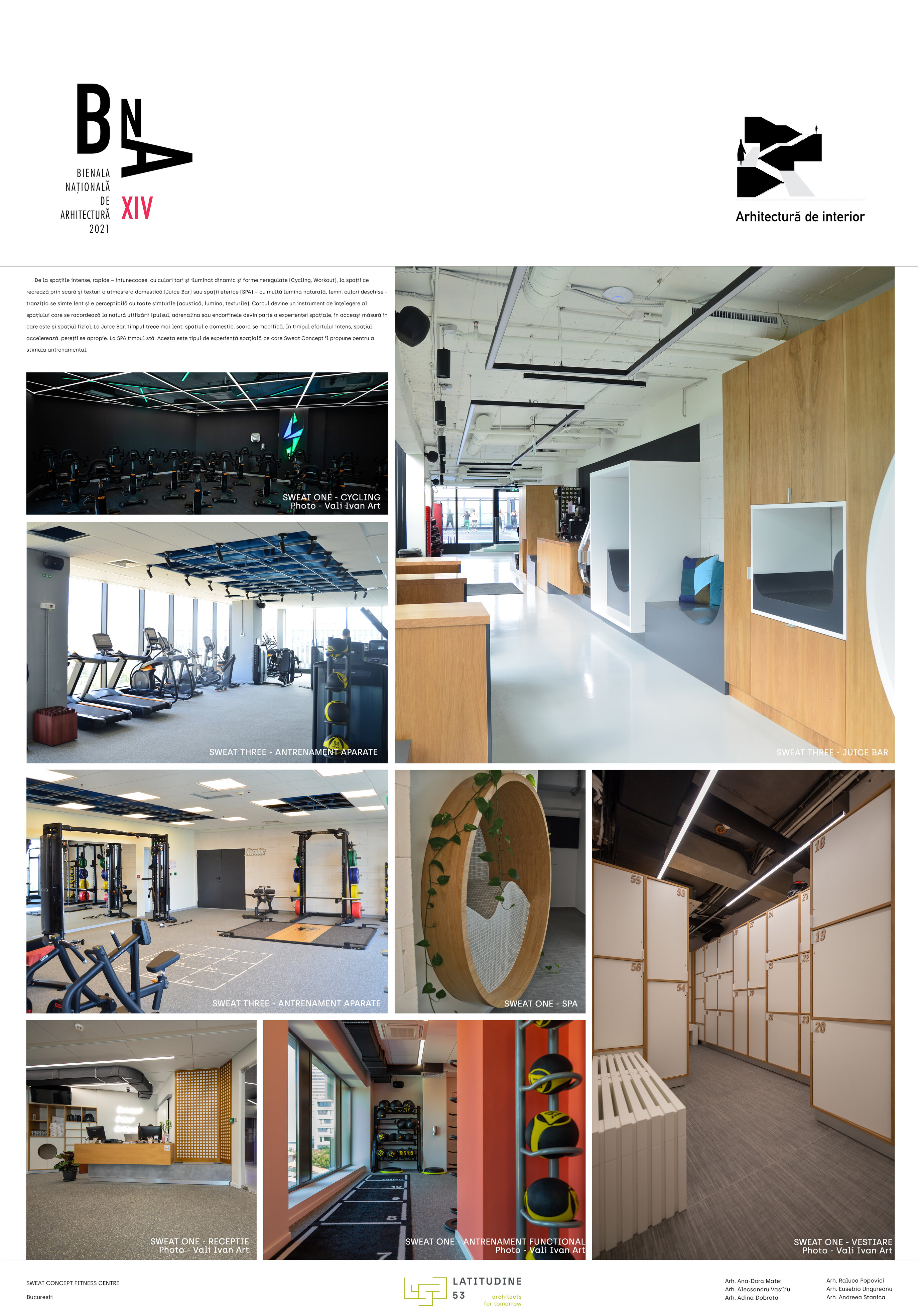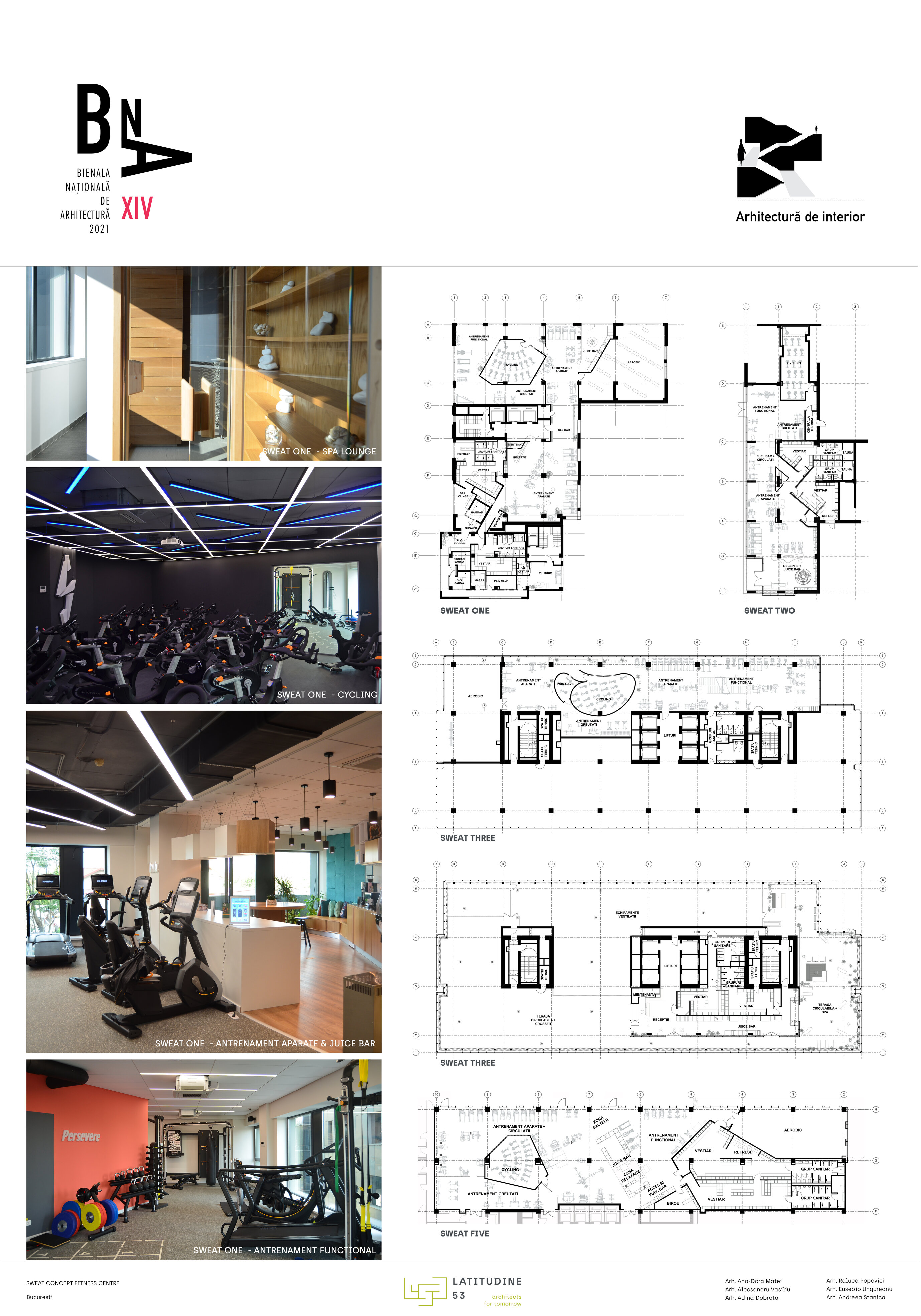 De la spațiile intense, rapide – întunecoase, cu culori tari și iluminat dinamic și forme neregulate (Cycling, Workout), la spații ce recrează prin scară și texturi o atmosfera domestică (Juice Bar) sau spații eterice (SPA) – cu multă lumina naturală, lemn, culori deschise - tranziția se simte lent și e perceptibilă cu toate simțurile (acustică, lumina, texturile). Corpul devine un instrument de înțelegere al spațiului care se racordează la natură utilizării (pulsul, adrenalina sau endorfinele devin parte a experienței spațiale, în acceași măsură în care este și spațiul fizic). La Juice Bar, timpul trece mai lent, spațiul e domestic, scara se modifică. În timpul efortului intens, spațiul accelerează, pereții se apropie. La SPA timpul stă. Acesta este tipul de experiență spațială pe care Sweat Concept îl propune pentru a stimula antrenamentul.