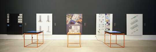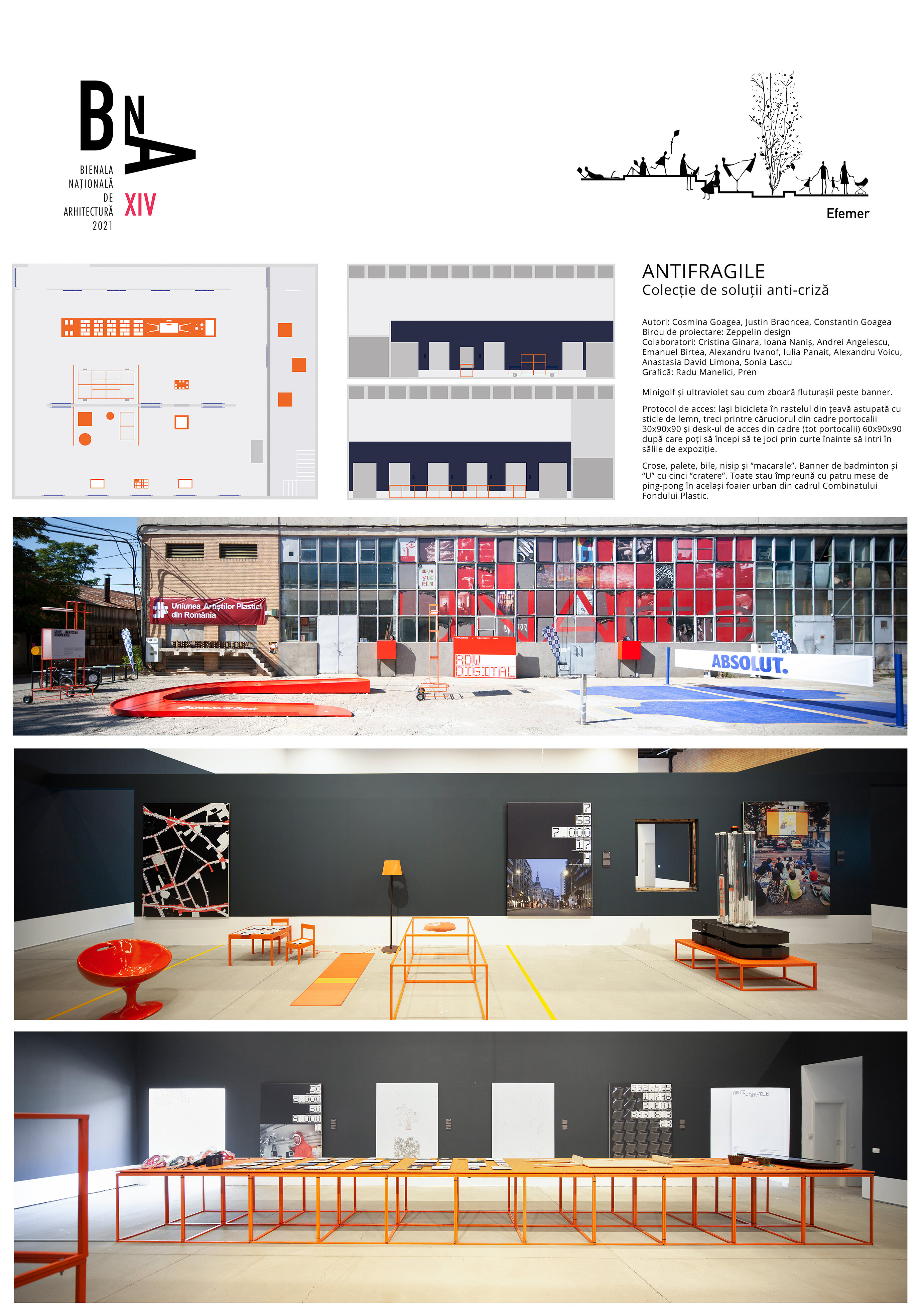 În mijlocul expoziției “Antifragile” un perete bleumarin cu fereastră de lemn. De o parte a peretelui o mașină și o masă din plăci perforate așezate pe cadre portocalii 60x90x90; pe masă măști, grafică și design produs pe timp de criză. De partea cealaltă un pat din cadre 60x90x90 și-un robot. Robot de dezinfectat produs de “Modulab”; cu ultraviolet după cum indică și titlul.