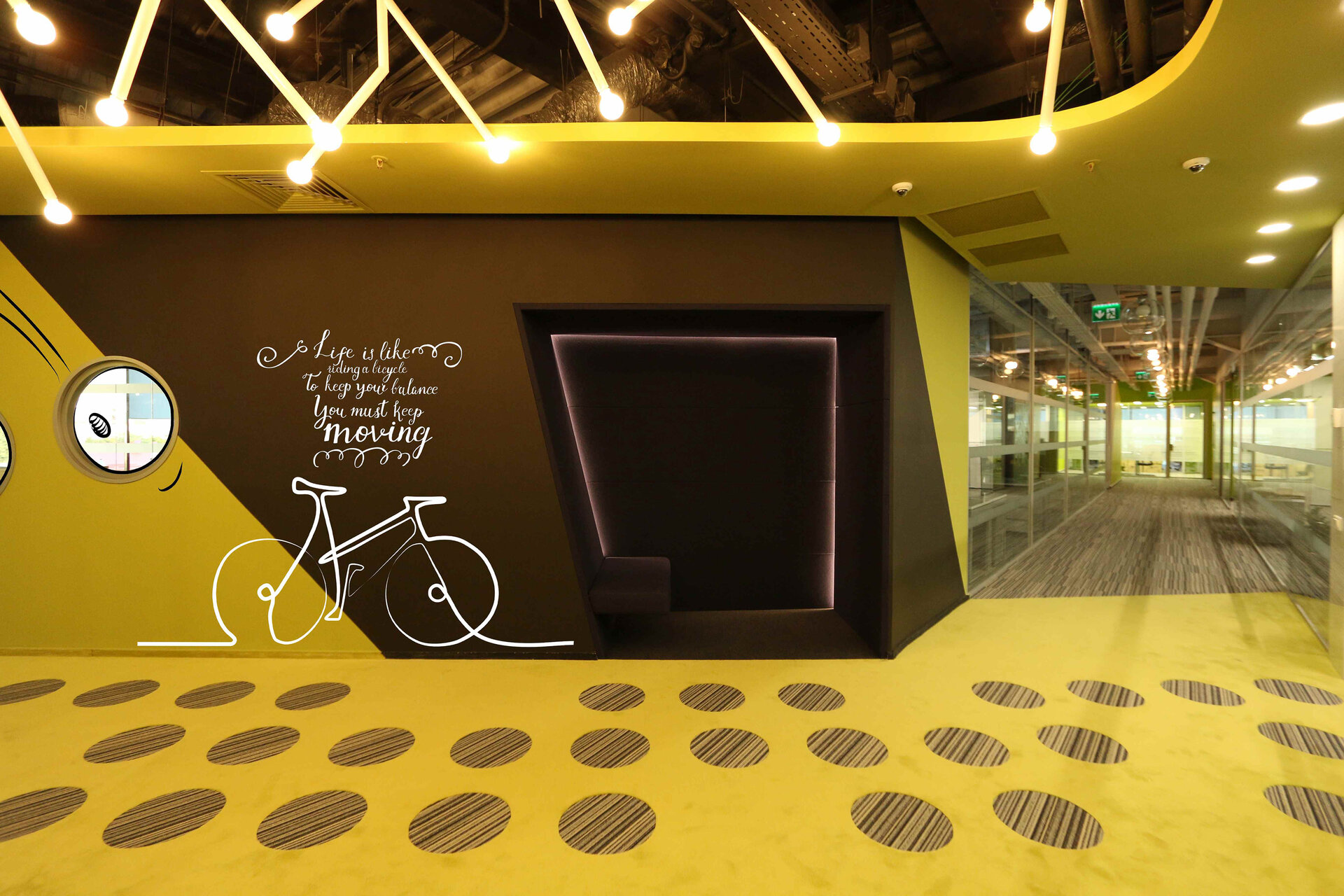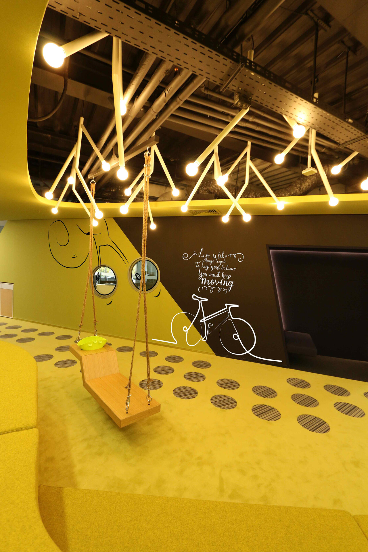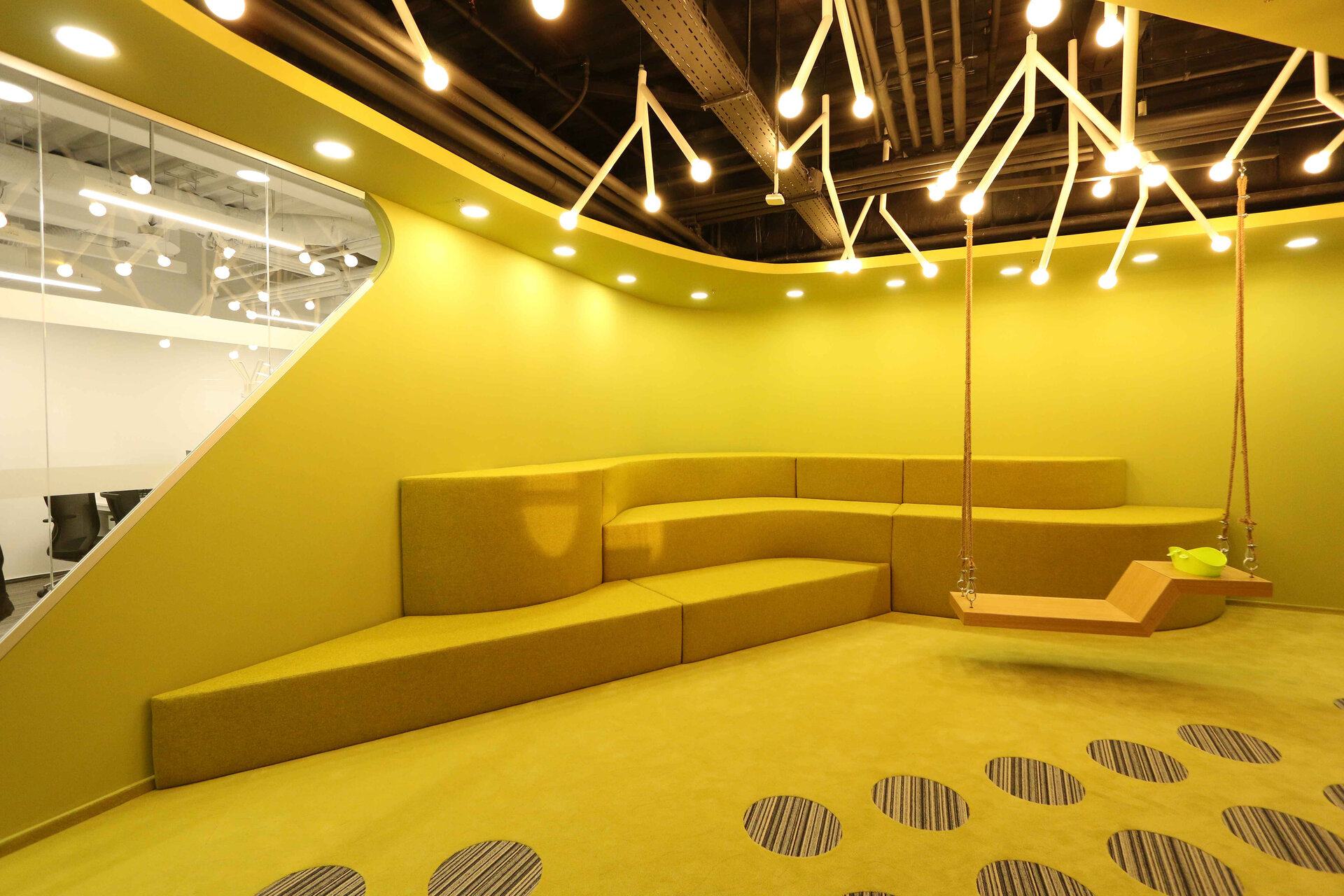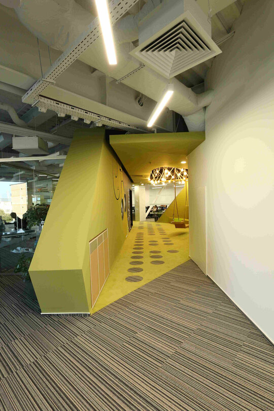 Zona cu o formă triunghiulară are rol multifuncțional, fiind spațiu de trecere, spațiu de relaxare, de socializare sau de lucru. Este echipat cu o banchetă cu diverse variațiuni de nivel și un leagăn. Un alt element este corpul de separare al coridorului central care are și rol de banchetă. S-a urmărit o tranziție lină între diverse abordări estetice.