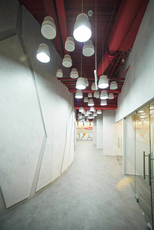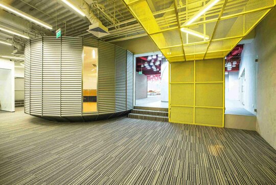 Zona de relaxare a fost realizată în incinta unui cilindru cu aspect de siloz, silozul fiind un element esențial în activitatea companiei.