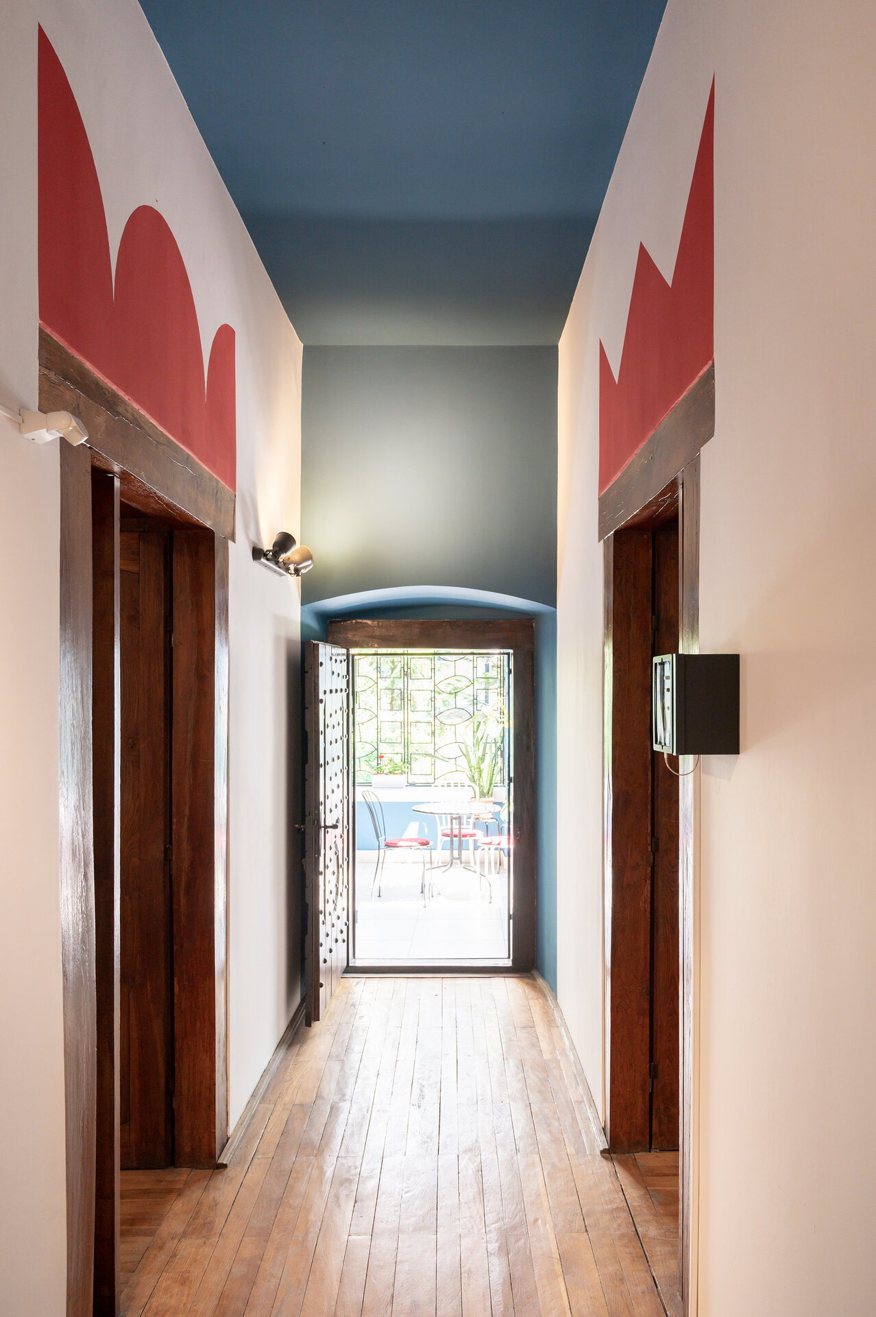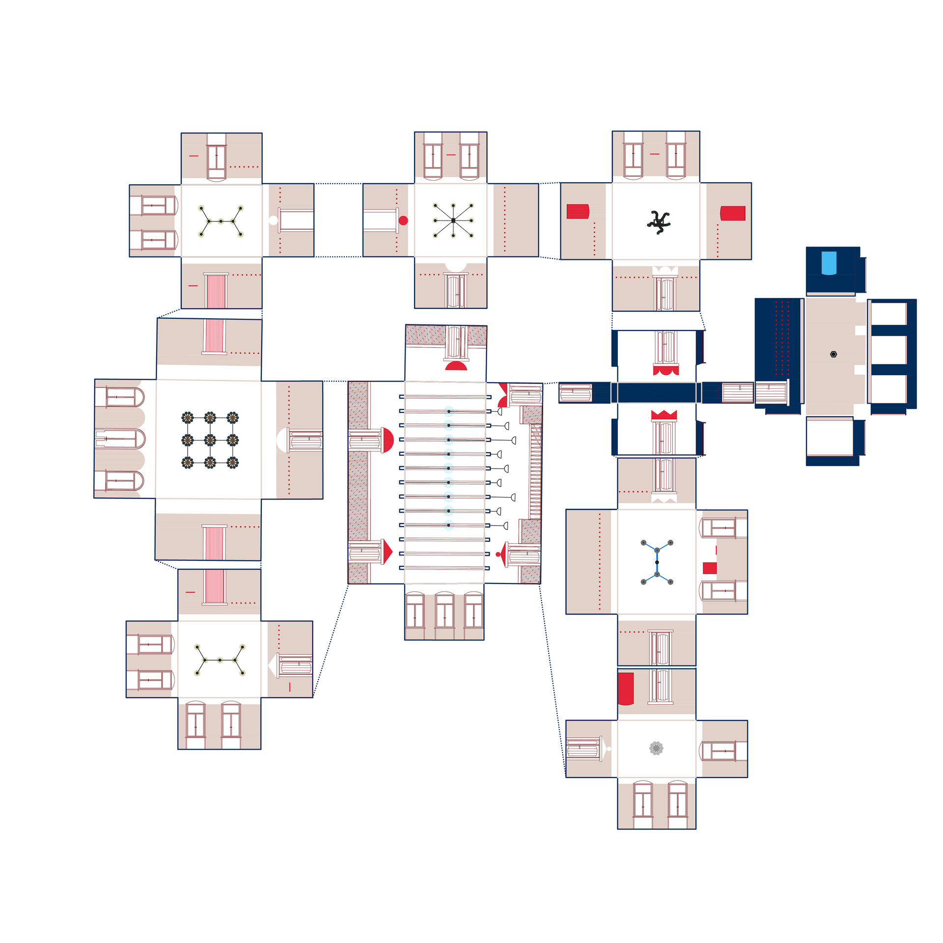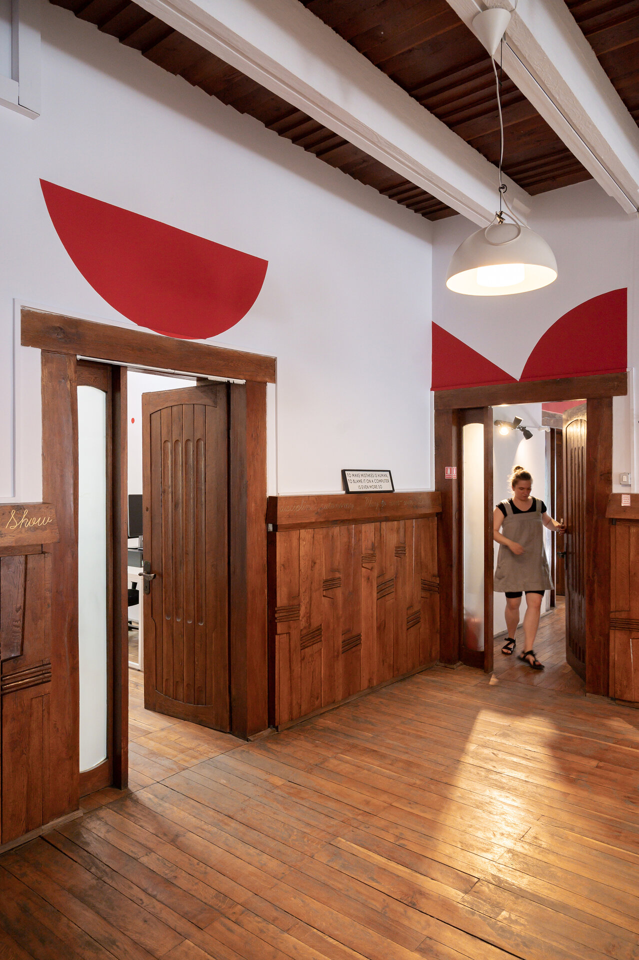 În holul de la etaj, se face cunoștință cu „personajele” din MaiMuzeu. Sălile de lucru, cu cromatică mai reținută la interior, care îndeamnă la liniște și concentrare, își exprimă personalitatea spre holul comun. Prin formele desenate deasupra buiandrugului fiecăreia, ușile camerelor de lucru devin personaje de teatru. Joaca cu proporțiile ușilor face referire la elemente neoclasice pe care le-ar fi avut în trecut și acestă clădire, dar care au fost anulate de restaurarea din anii ”70 (uși înalte, brâuri și decorații ale pereților).