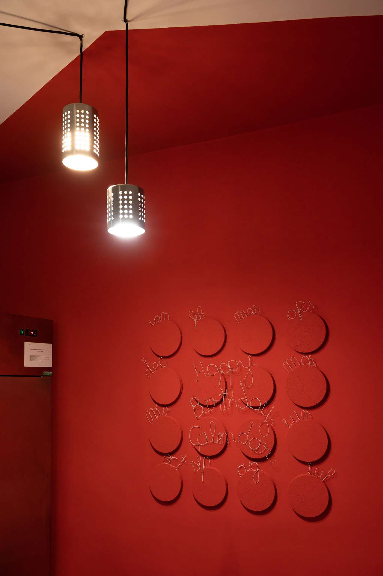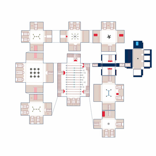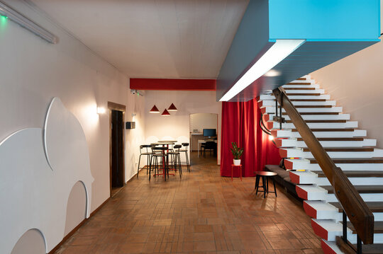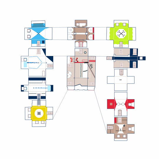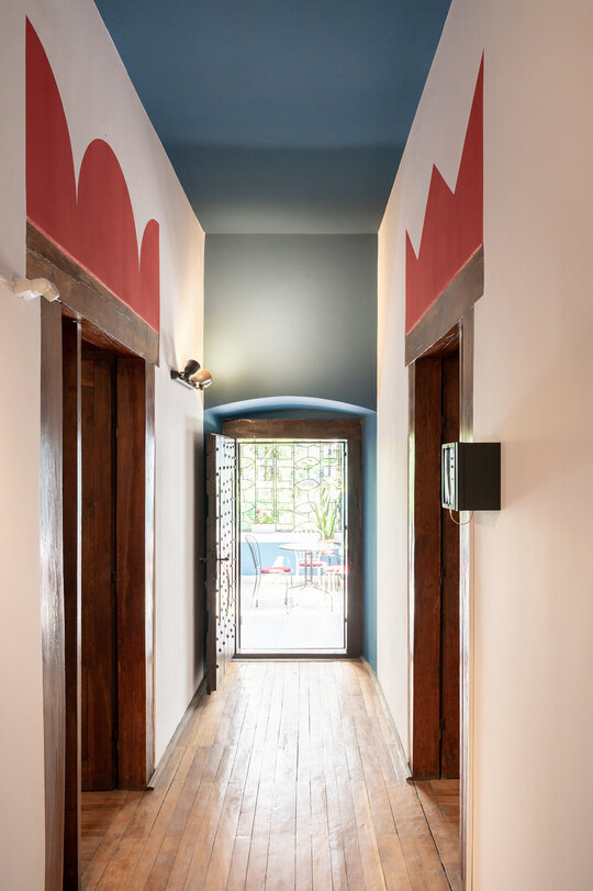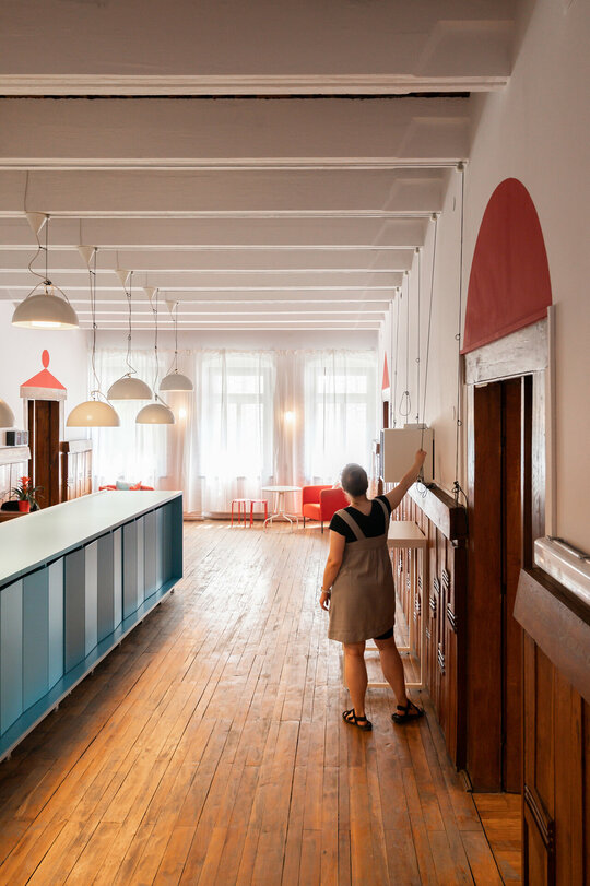 În holul de la etaj, se face cunoștință cu „personajele” din MaiMuzeu. Sălile de lucru, cu cromatică mai reținută la interior, care îndeamnă la liniște și concentrare, își exprimă personalitatea spre holul comun. Prin formele desenate deasupra buiandrugului fiecăreia, ușile camerelor de lucru devin personaje de teatru. Joaca cu proporțiile ușilor face referire la elemente neoclasice pe care le-ar fi avut în trecut și acestă clădire, dar care au fost anulate de restaurarea din anii ”70 (uși înalte, brâuri și decorații ale pereților).