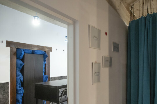Lacul, o sală de ședințe grevată de circulații către alte săli, primește o draperie care o învăluie și separă spațiul funcțional propriu-zis de alte fluxuri, atât fizic cât și acustic.
