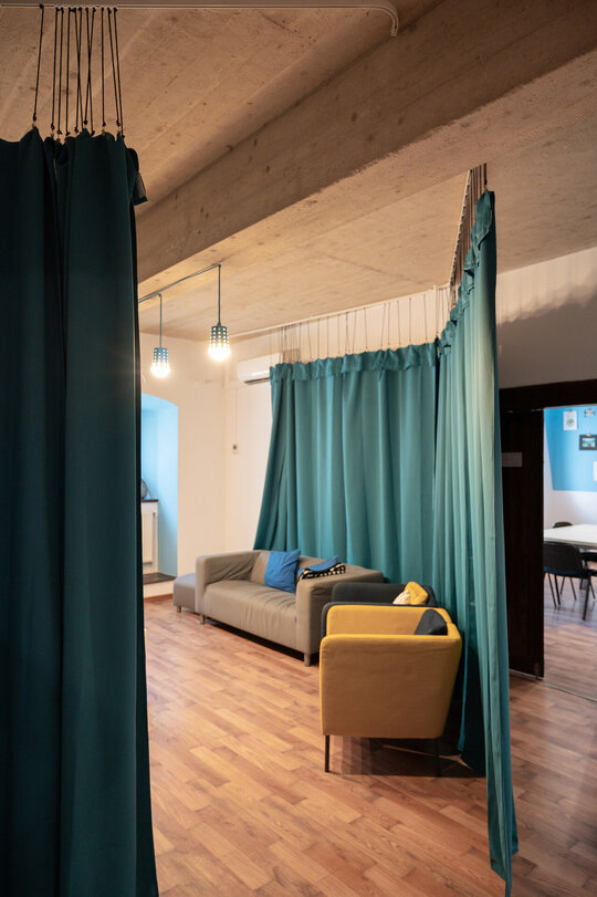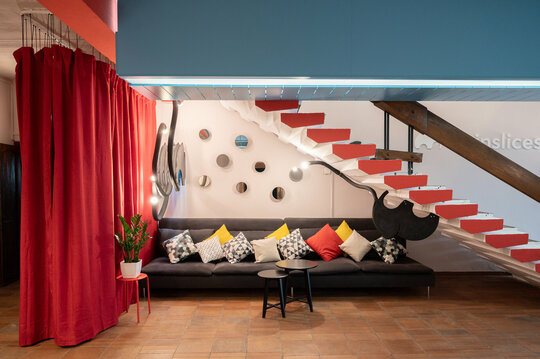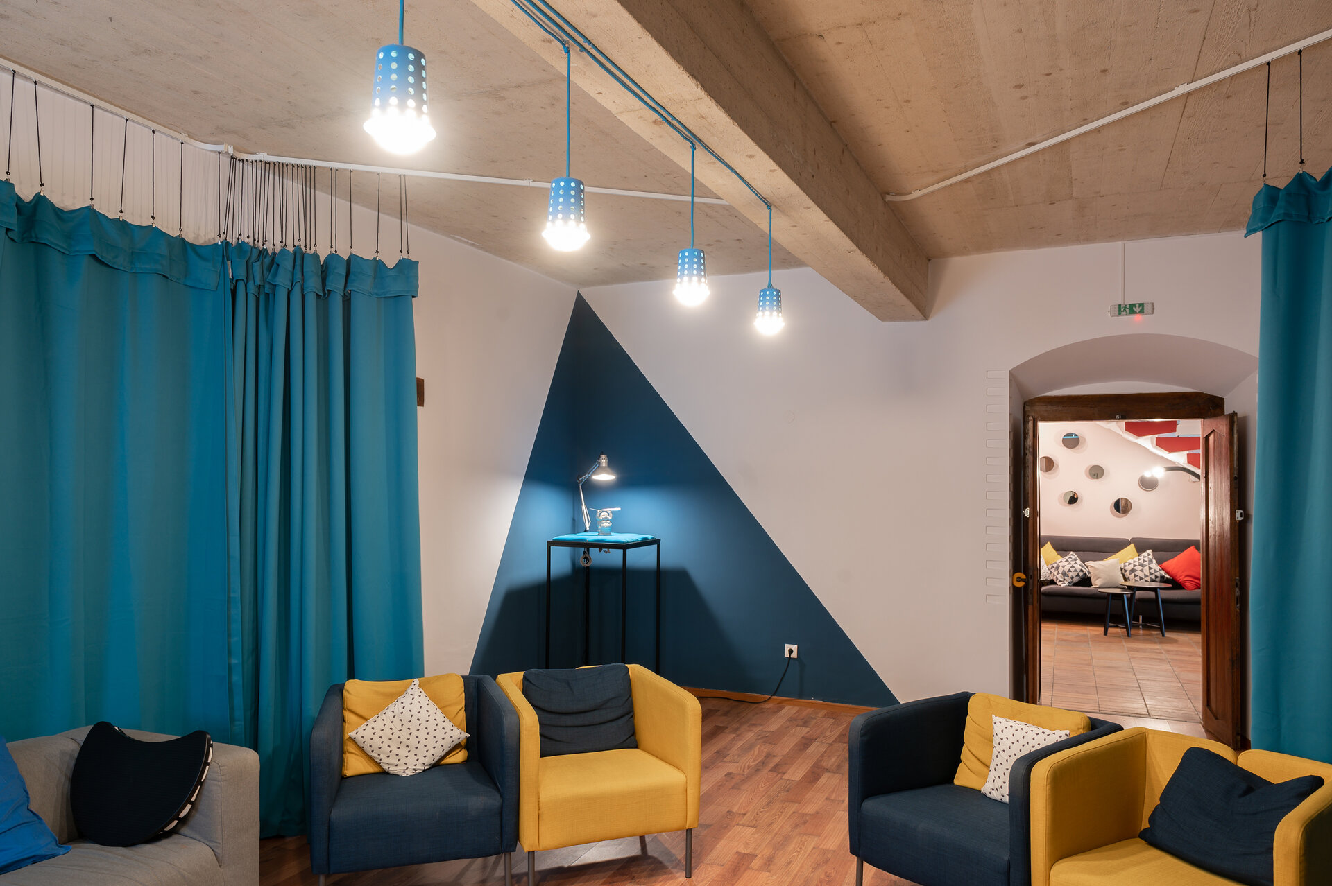 Luminișul devine sală de interviuri și un loc „viu”, verde și vesel care exprimă personalitatea echipei. Terasa, umbrită, e transformată prin culoare și cu o canapea într-un adevărat loc de relaxare, cu vibe de cafenea franceză.
