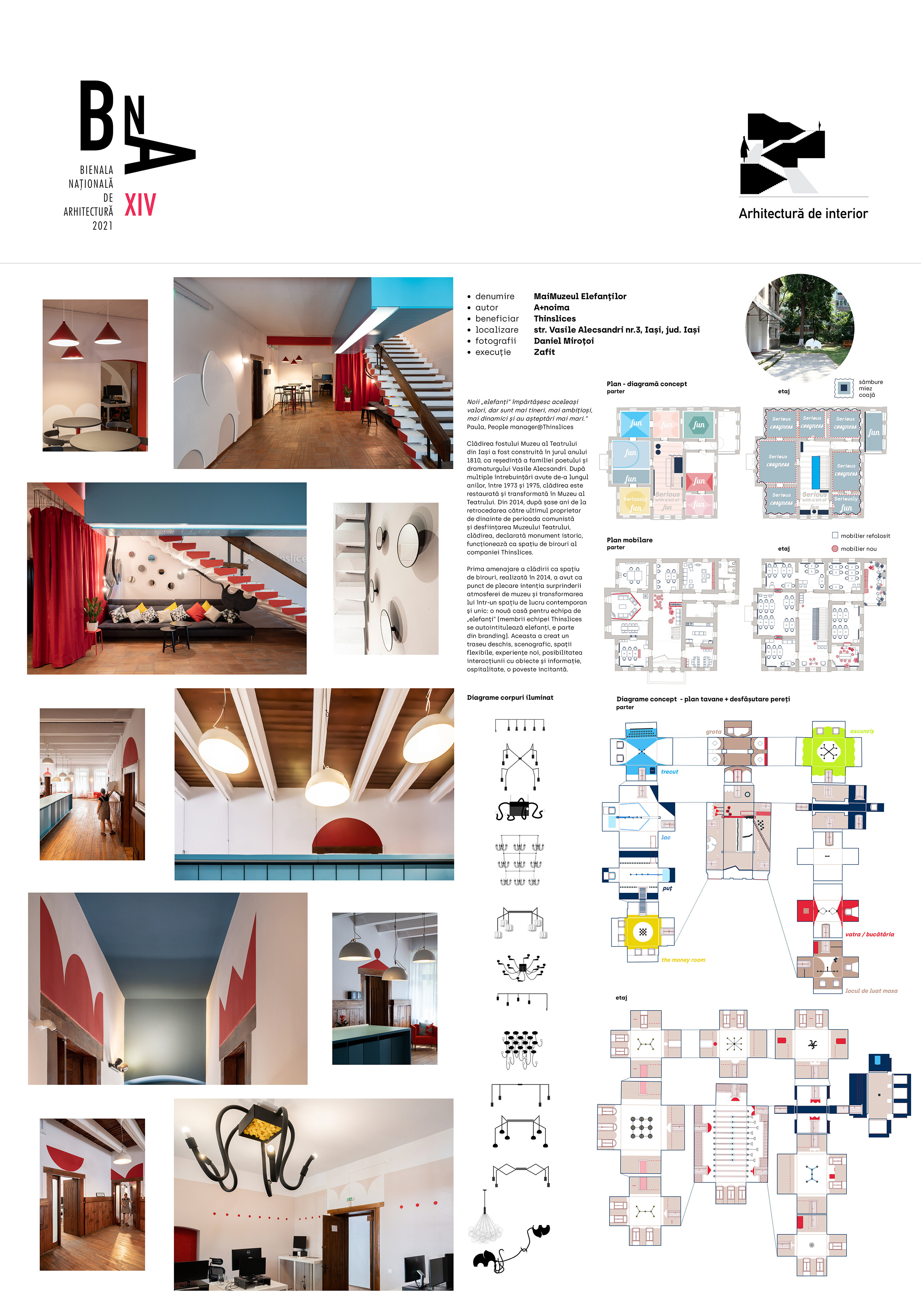 Prima amenajare a clădirii ca spațiu de birouri, realizată în 2014, a avut ca punct de plecare intenția surprinderii atmosferei de muzeu și transformarea lui într-un spaţiu de lucru contemporan şi unic: o nouă casă pentru echipa de „elefanți” (membrii echipei Thinslices se autointitulează elefanți, e parte din branding). Aceasta a creat un traseu deschis, scenografic, spații flexibile, experiențe noi, posibilitatea interacţiunii cu obiecte şi informaţie, ospitalitate, o poveste incitantă.