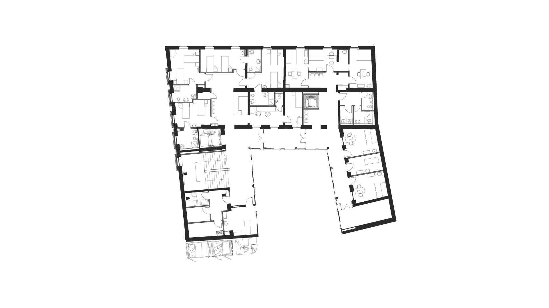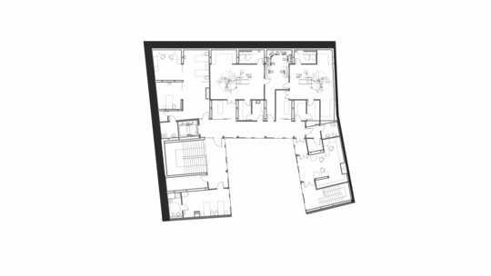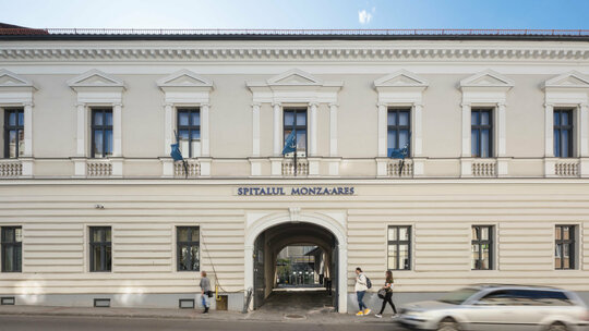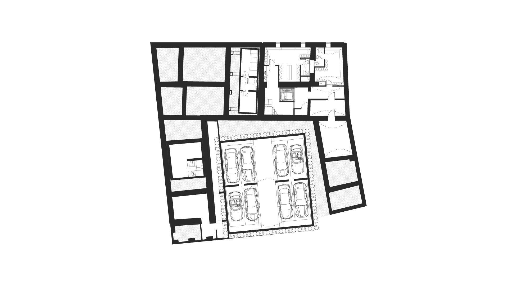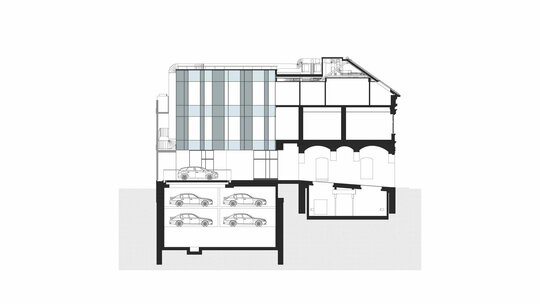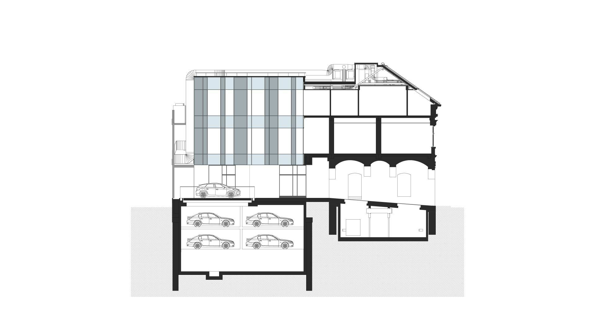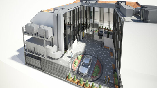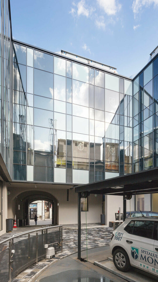 Transformarea a necesitat utilizarea rațională a fiecărui metru pătrat al construcției existente și al extinderilor interioare, subterane și superioare.Imaginea exterioară catalogată ca valoroasă ambiental a fost atent conservată în vreme ce spre interiorul curții o a doua față închisă în sticlă a avut un aport decisiv în rezolvarea funcțională.Jocul oglindirilor reciproce amplifică spațiul.Echipamentele și instalațiile au fost parțial agățate pe calcanul vestic, parțial scufundate sub pavimentul gangului de intrare.Mansarda este parțială pentru a conserva volumetria pe de o parte și pentru a obține volum util pe de cealaltă. Soluțiile tehnologice nu se opresc aici. Pentru a asigura numărul de parcări cerute în condițiile de deficit de spațiu am recurs la folosirea unui sistem de parcare automat, care este de fapt un robot amplasat în subteranul curții care reușește să stocheze 16 autovehicule. Operația a reușit, pacientul a căpătat o viață nouă!