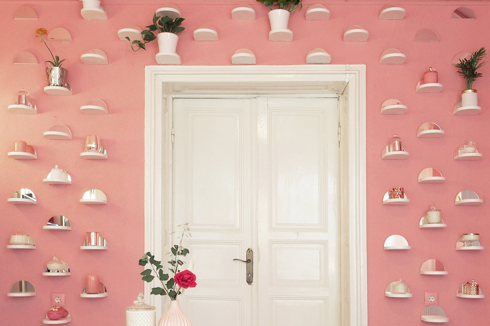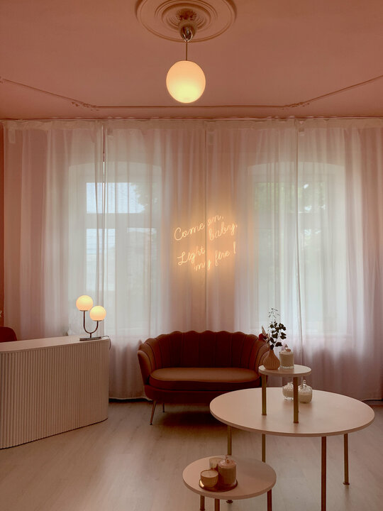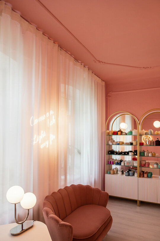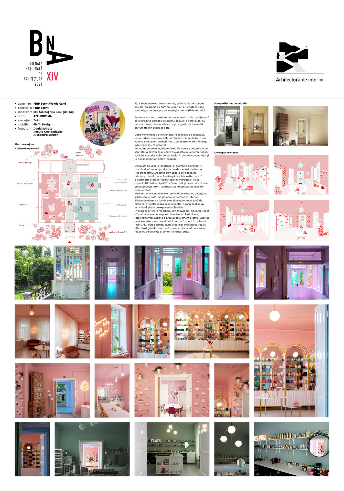 În ceea ce privește mobilierul din showroom, am intenționat să creăm un mediu inspirat din universul Flair Scent, folosind forma curbată a arcului ca element plastic. Spațiul devine o extensie a brandului, la o scară diferită, cu forme „moi”, linii curbe, detalii aurii și oglinzi. Mobilierul, vopsit alb, a fost gândit ca un cadru poetic, dar vesel care să se joace cu percepțiile și simțurile vizitatorilor.