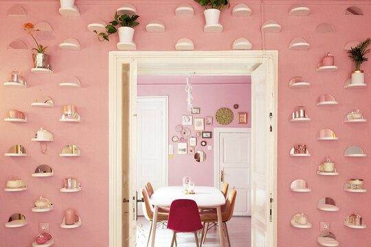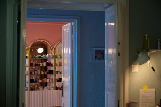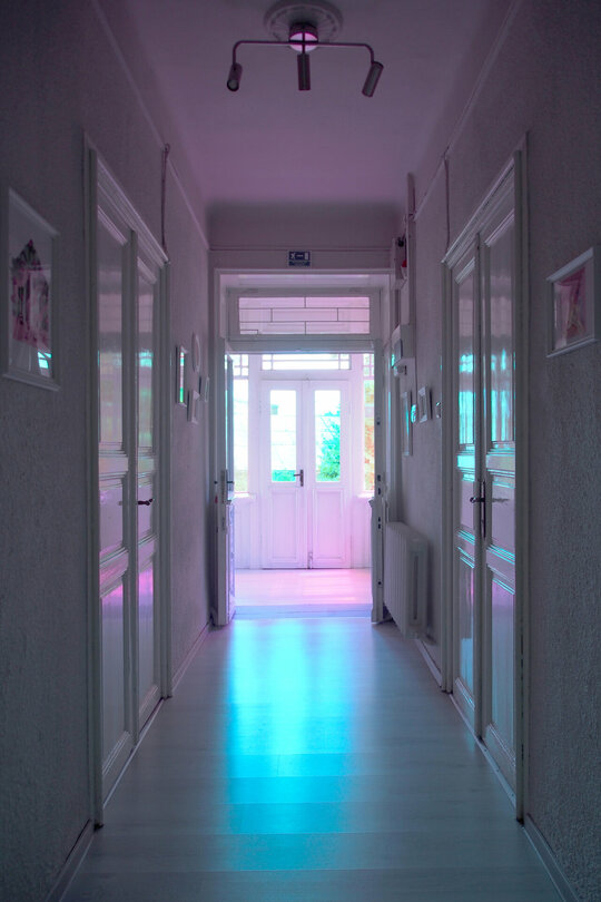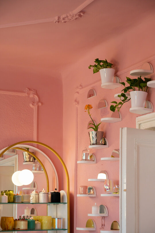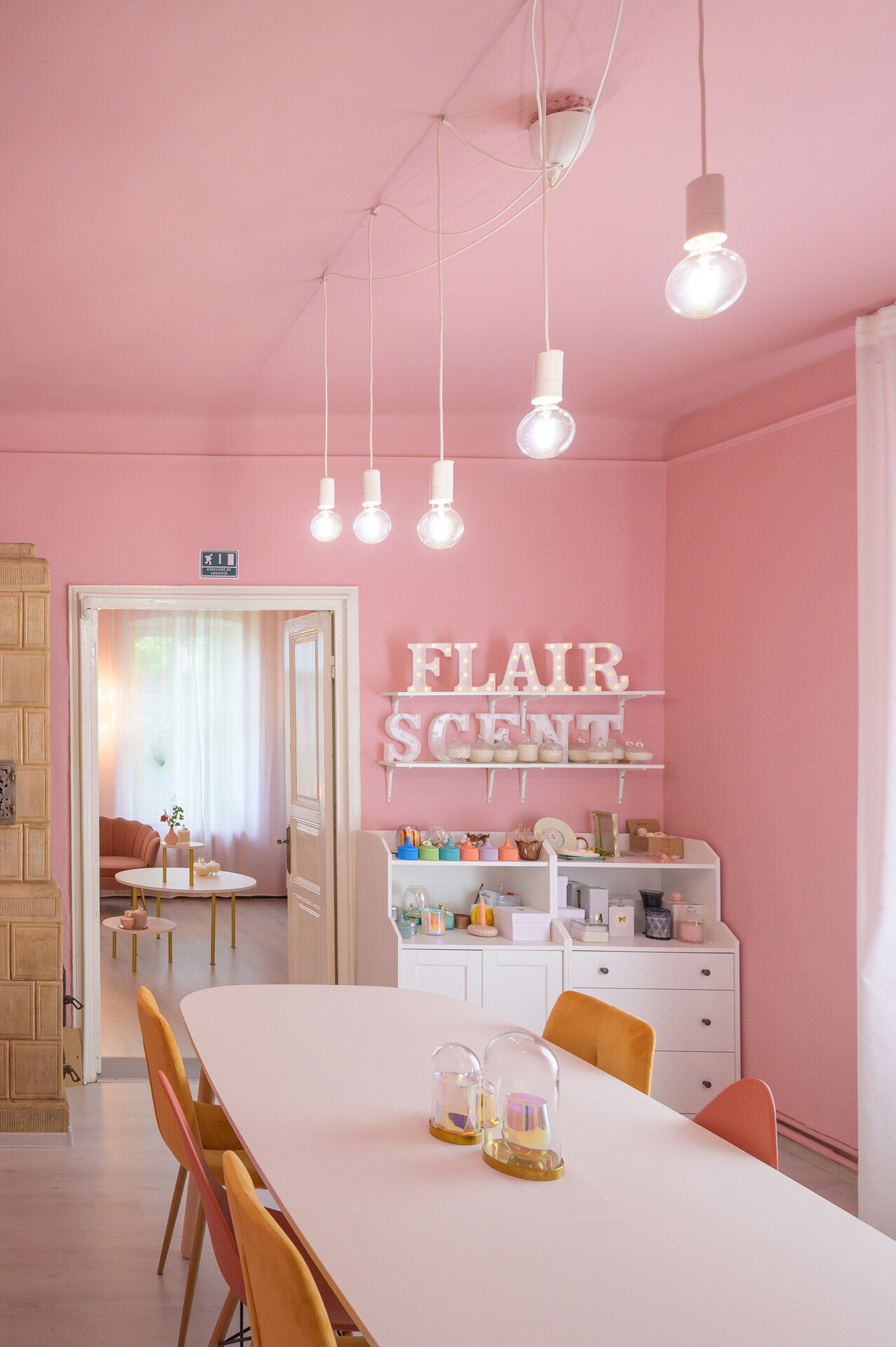 Funcțional și cromatic am împărțit casa în două zone - producție (verde mentă) și vânzare (roz trandafiriu). Acestea sunt legate de o zonă de primire și circulație, colorată gri deschis. Astfel, există o destinație clară a fiecărui spațiu, marcată și vizual, aspect util atât echipei Flair Scent, cât și celor care le trec pragul (cumpărători, vizitatori, colaboratori, oameni din comunitate).