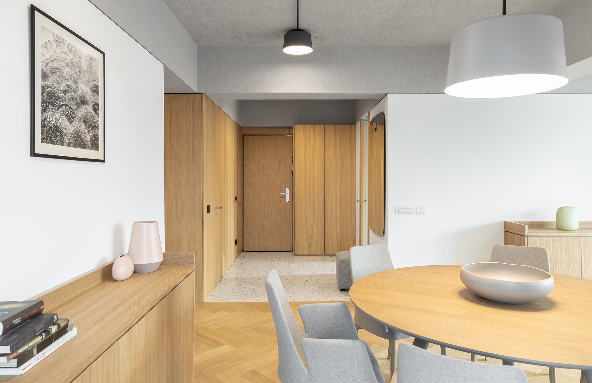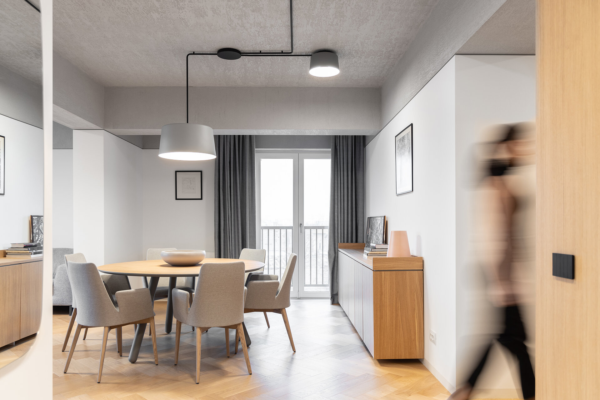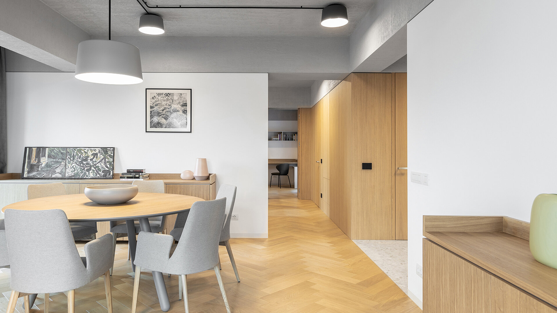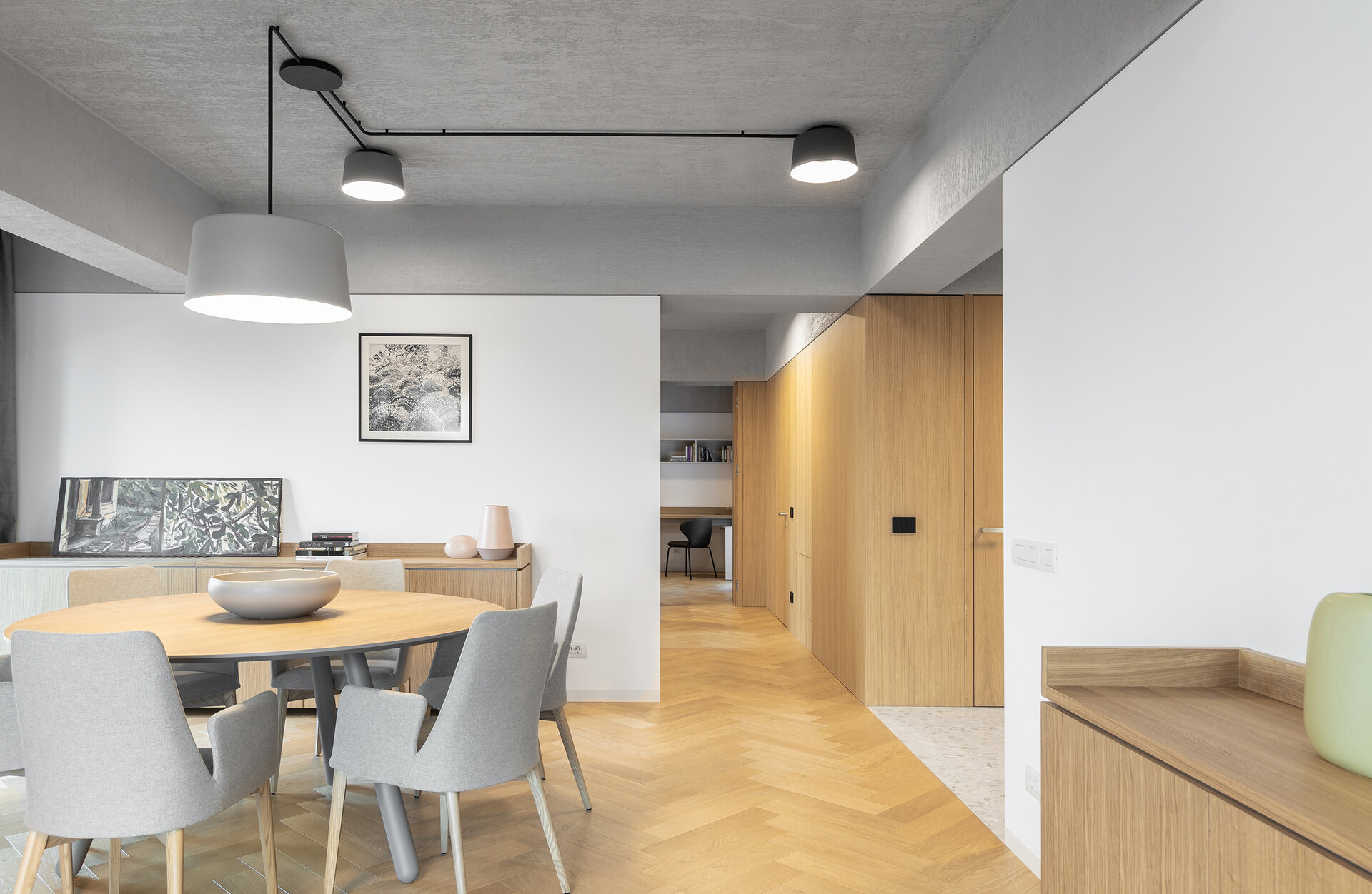 Spațiul de 150 mp a rezultat din unirea a două apartamente mai mici, și avea să răspundă unui cumul de funcțiuni necesare locuirii contemporane, a cărei versatiltate s-a anunțat odată cu lucrul de la distanță.