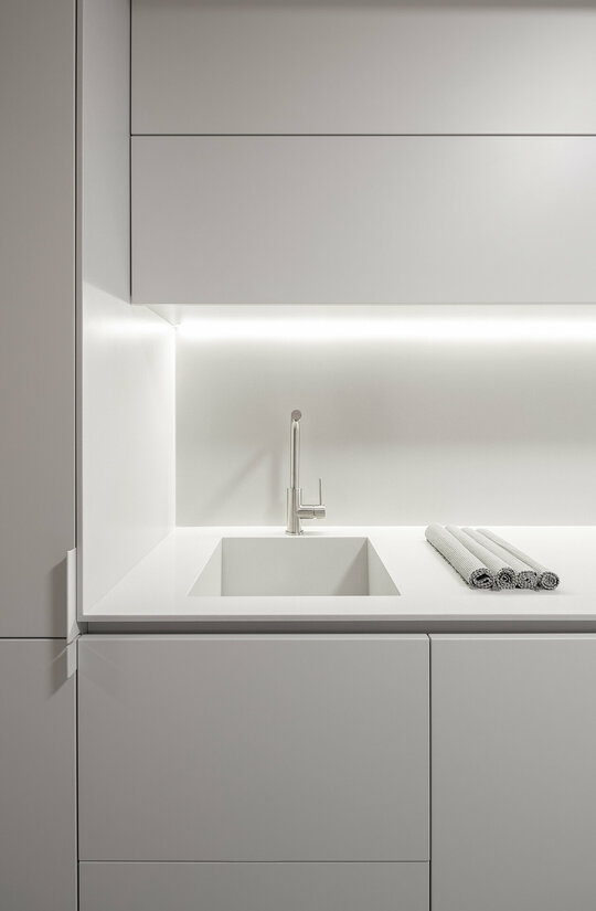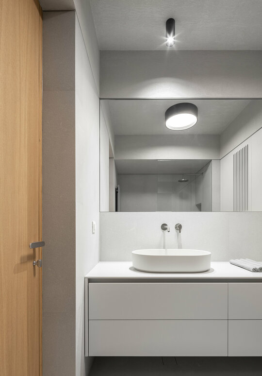 Între cele două registre s-a instalat, pe fondul luminos și calm al pereților albi, un mobilier discret pus în scenă de corpuri de iluminat care mizează pe minimalism. În mod voit, mobilierul este de dimensiuni reduse pentru a nu încărca inutil spațiul.