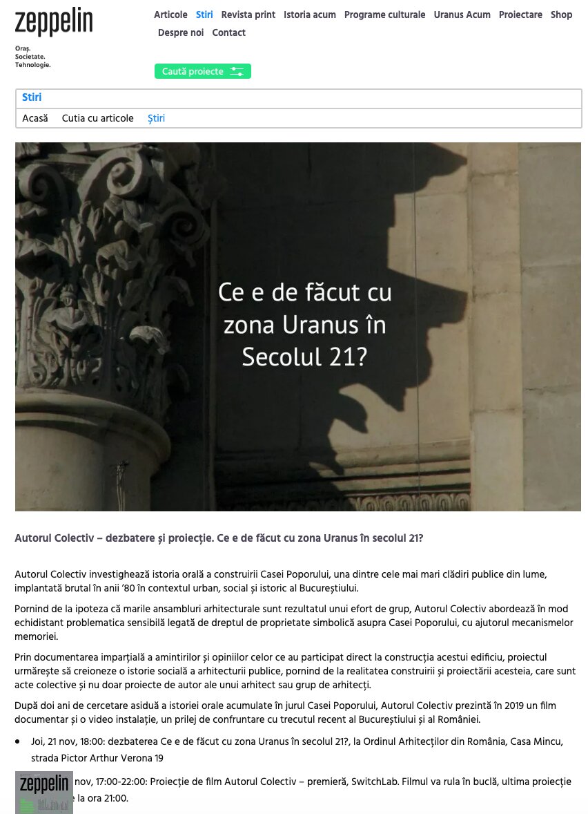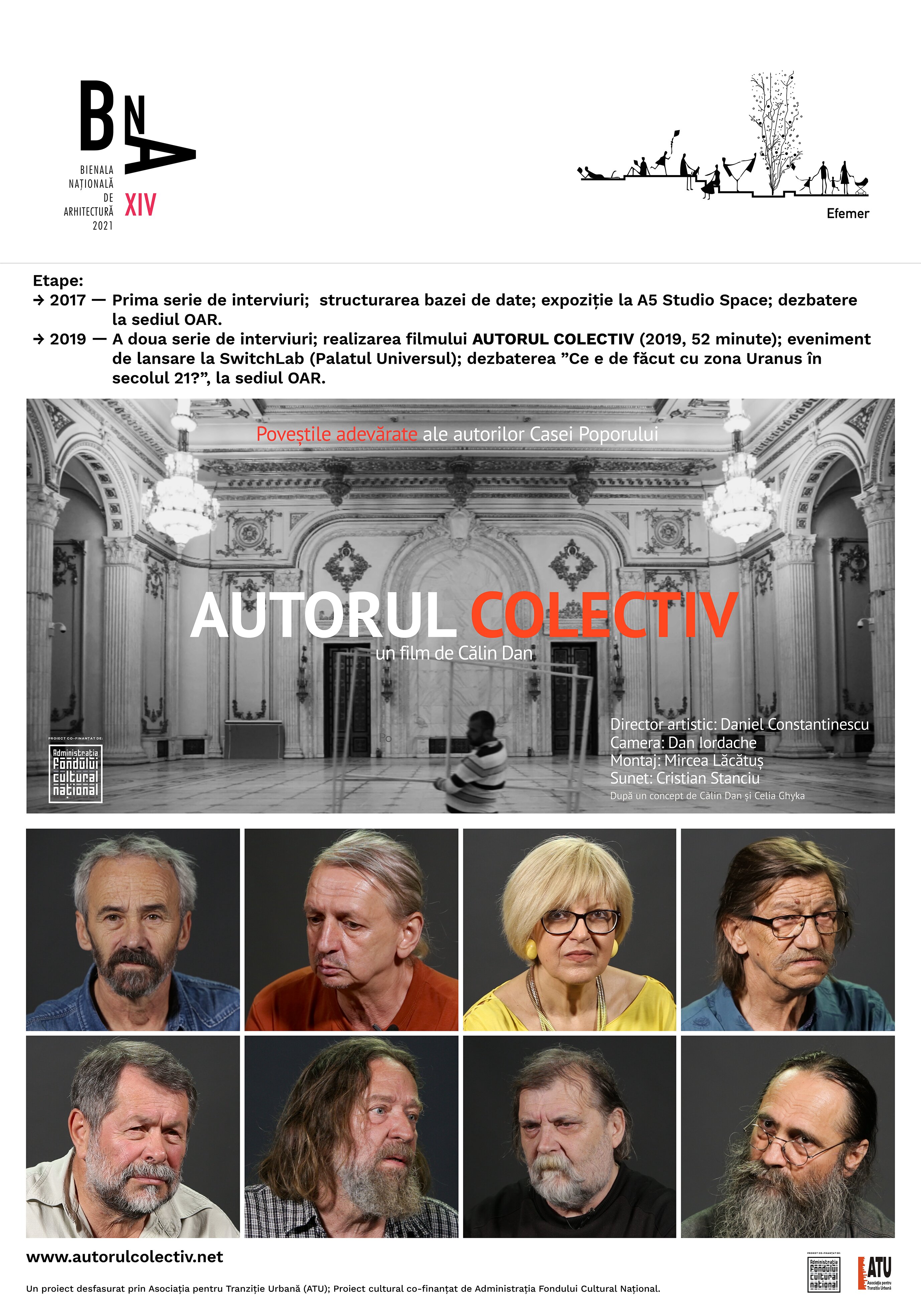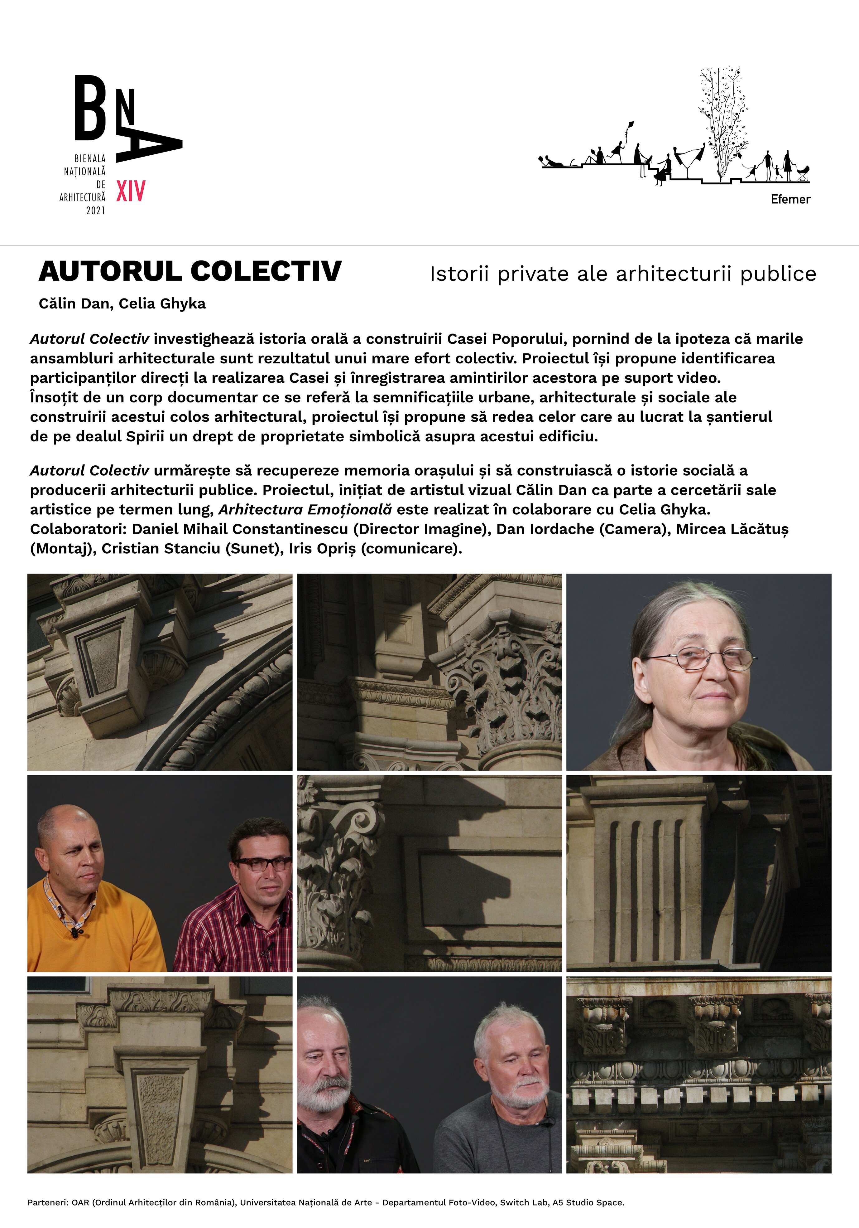”Autorul Colectiv. Istorii private ale arhitecturii publice” e un proiect cultural care investighează istoria producerii Casei Poporului, pornind de la ipoteza că marile ansambluri arhitecturale sunt rezultatul unui efort colectiv, rămas adesea invizibil. Ne-am propus identificarea a cât mai mulți participanți direcți la proiectarea și realizarea Casei și înregistrarea amintirilor acestora. Proiectul documentează în mod neutru opiniile participanților, evitând abordarea moralistă a acestei teme dificile, care a marcat în mod traumatic memoria colectivă a Bucureștiului și a locuitorilor săi.