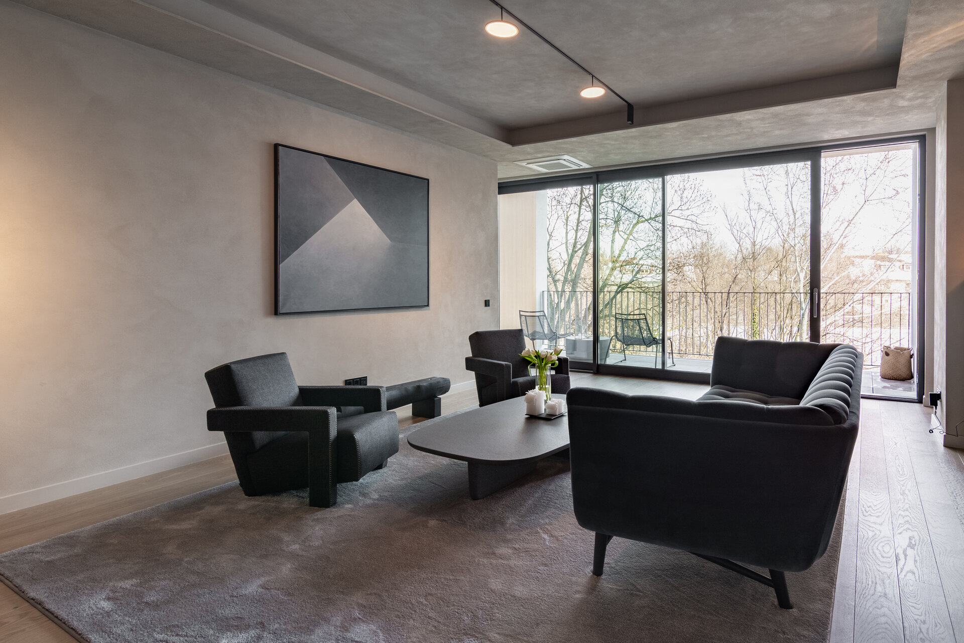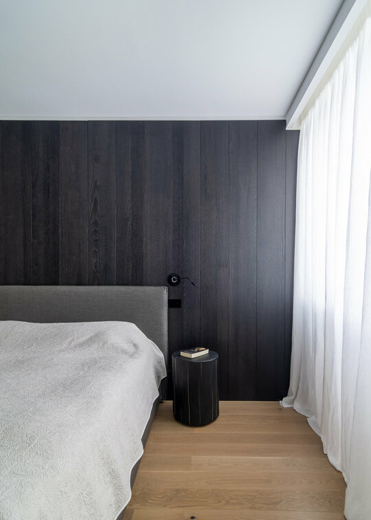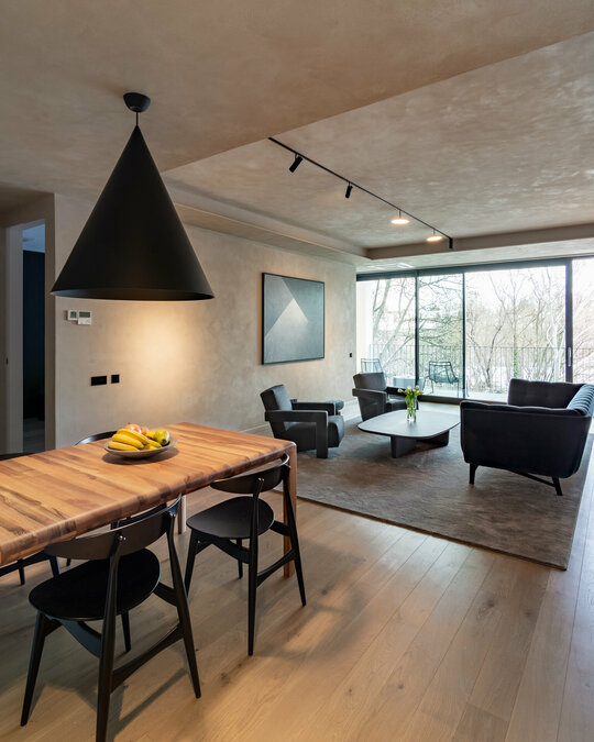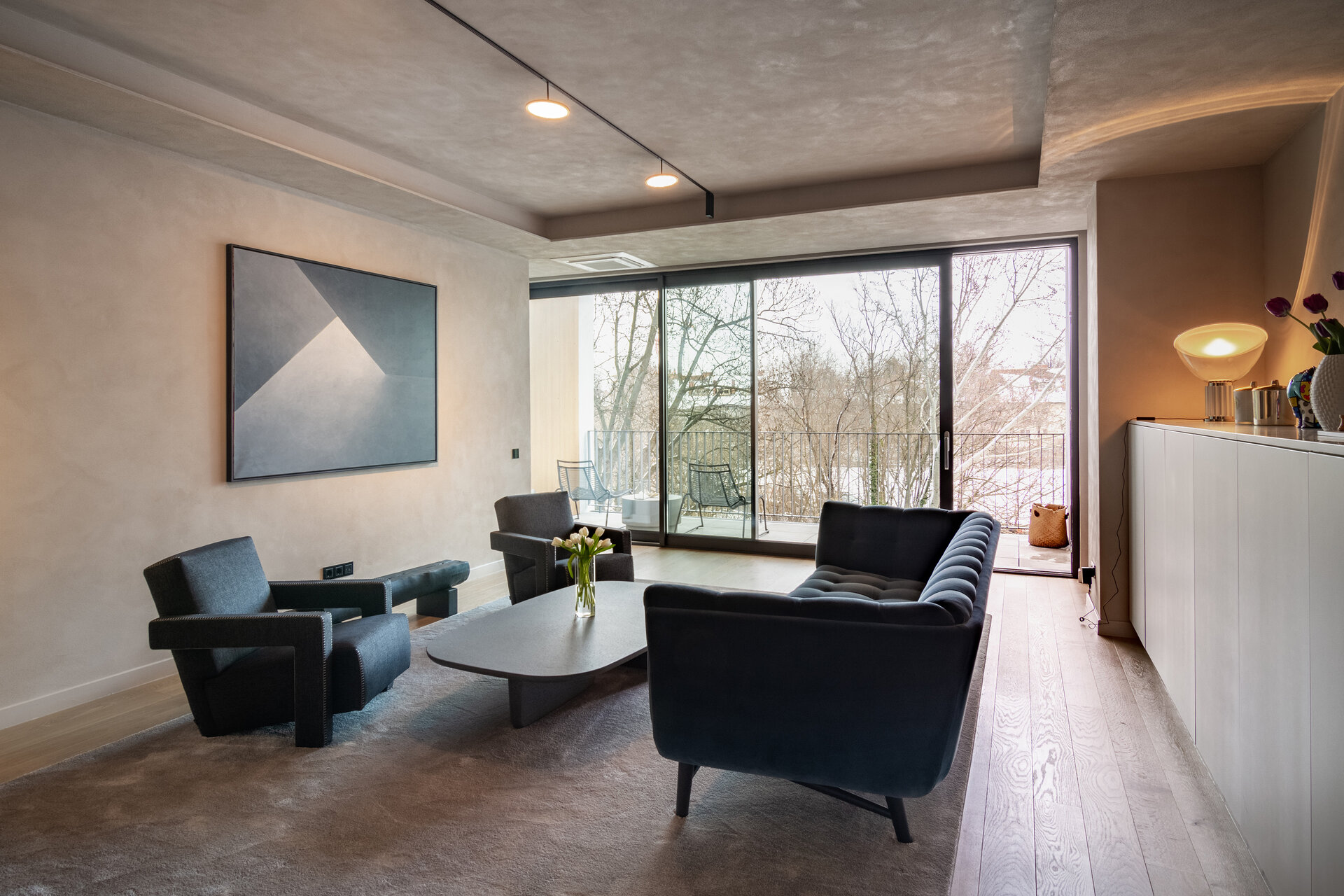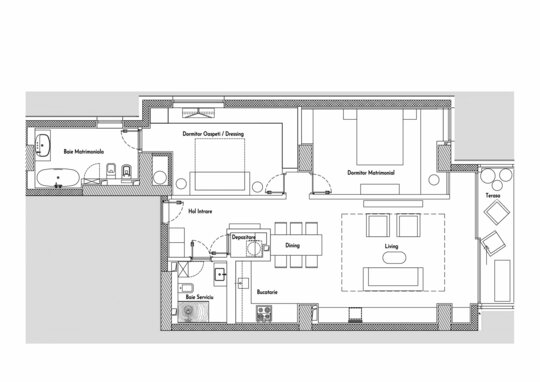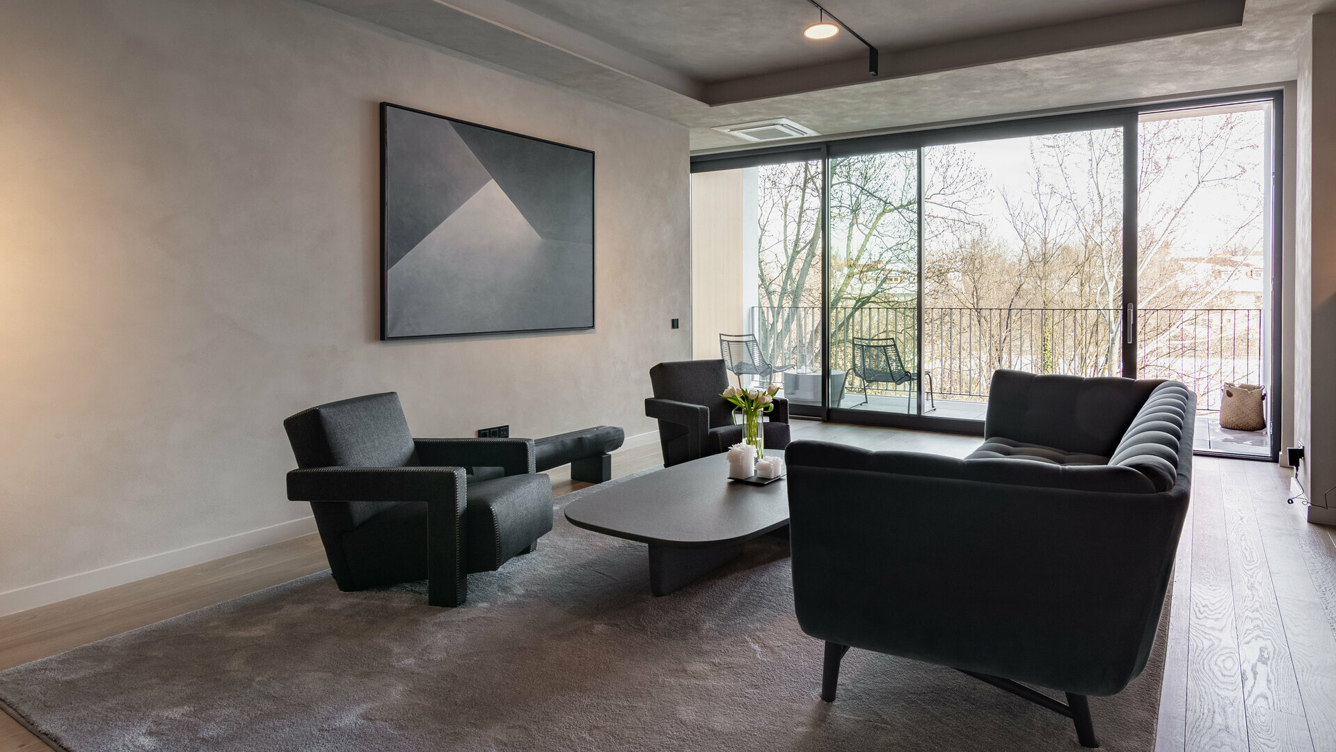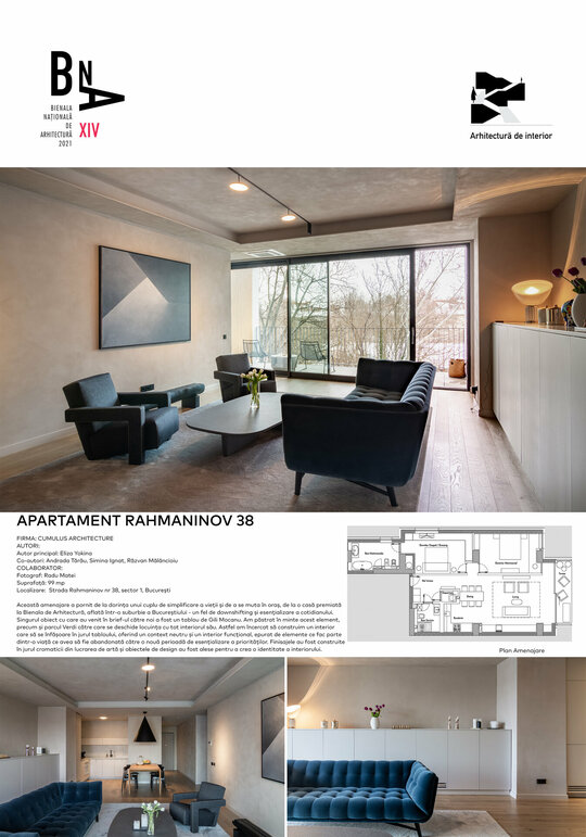 Această amenajare a pornit de la dorința unui cuplu de simplificare a vieții și de a se muta în oraș, de la o casă premiată la Bienala de Arhitectură, aflată într-o suburbie a Bucureștiului - un fel de downshifting și esențializare a cotidianului. Singurul obiect cu care au venit în brief-ul către noi a fost un tablou de Gili Mocanu. Am păstrat în minte acest element, precum și parcul Verdi către care se deschide locuința cu tot interiorul său.