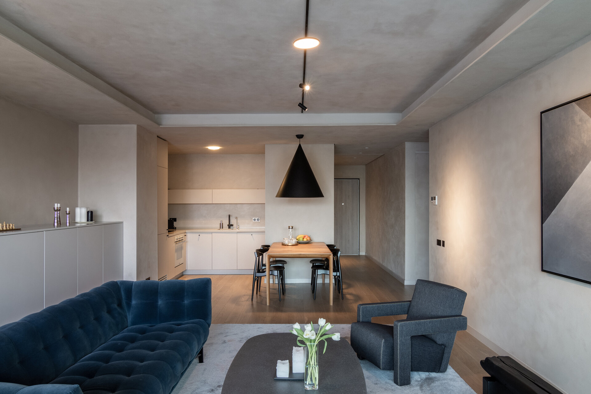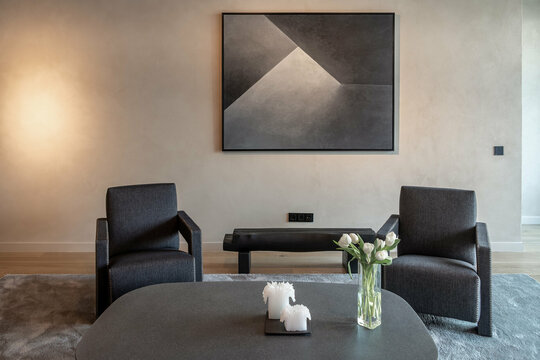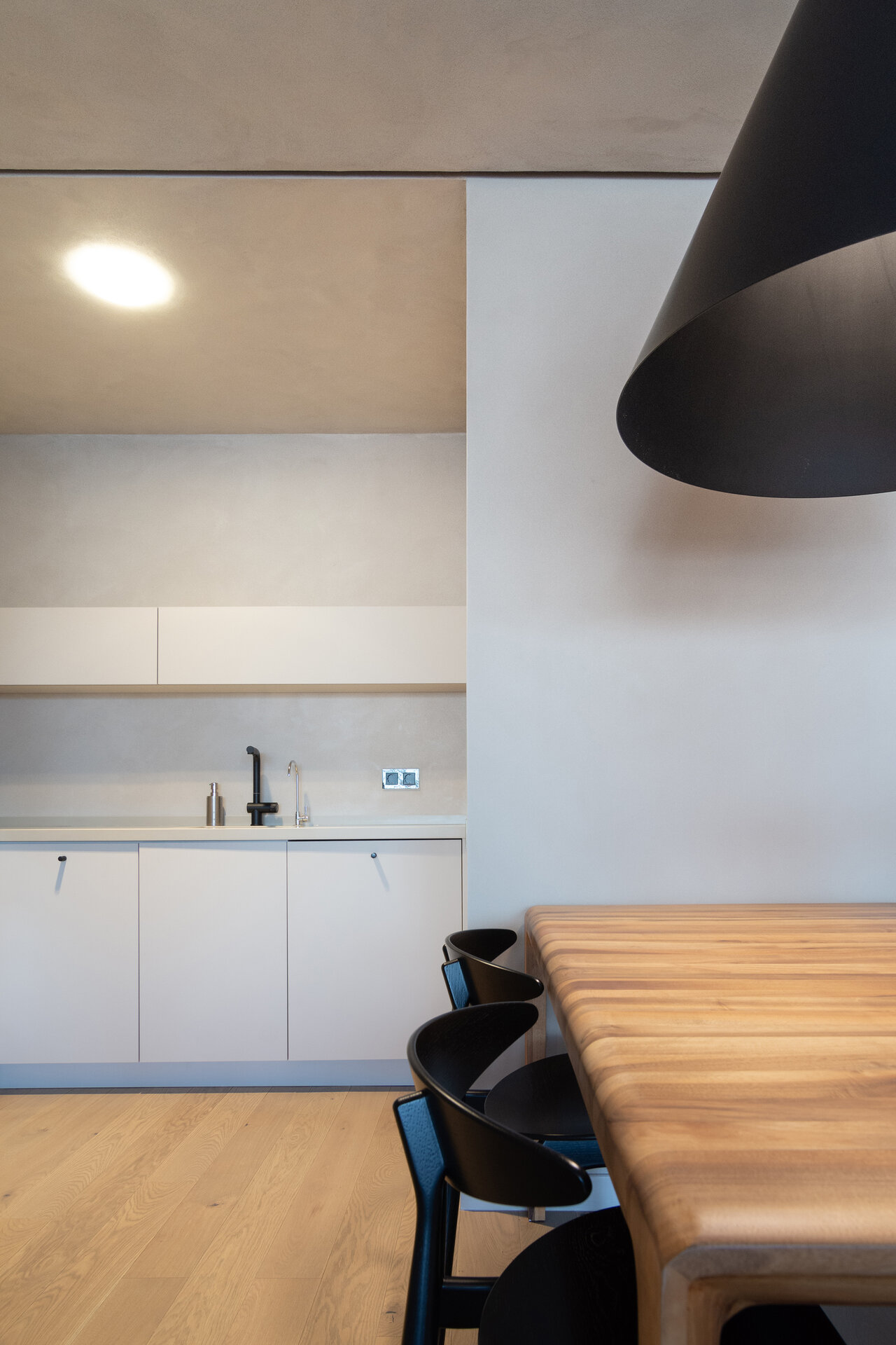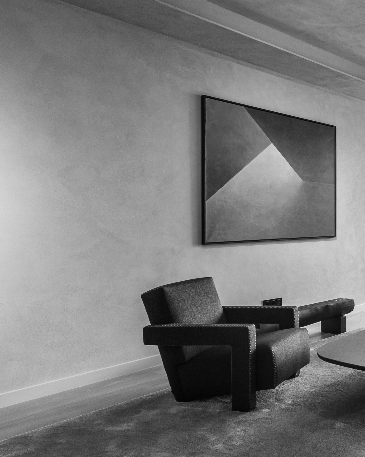 Astfel am încercat să construim un interior care să se înfășoare în jurul tabloului, oferind un context neutru și un interior funcțional, epurat de elemente ce fac parte dintr-o viață ce avea să fie abandonată către o nouă perioadă de esențializare a priorităților. Finisajele au fost construite în jurul cromaticii din lucrarea de artă și obiectele de design au fost alese pentru a crea o identitate a interiorului.