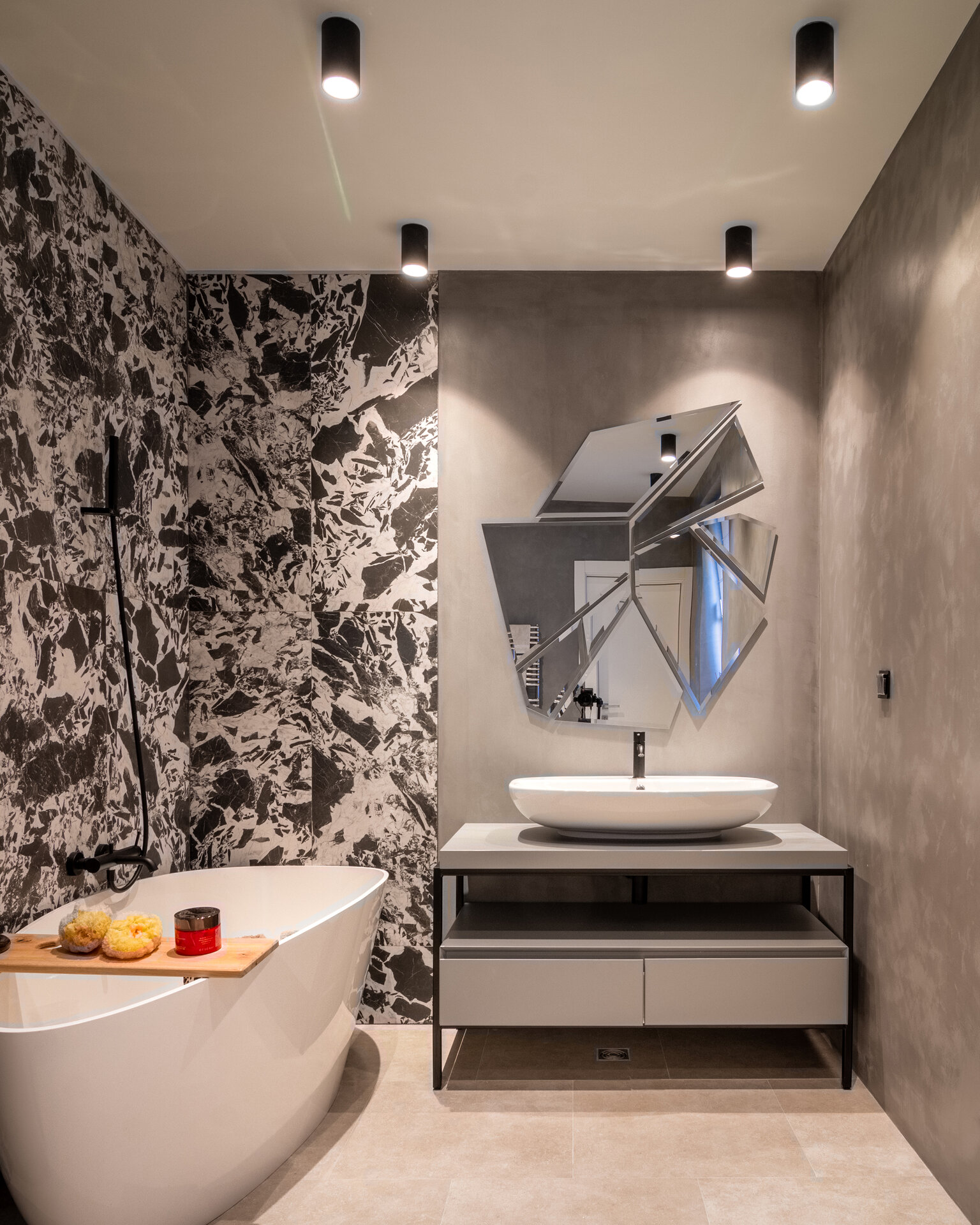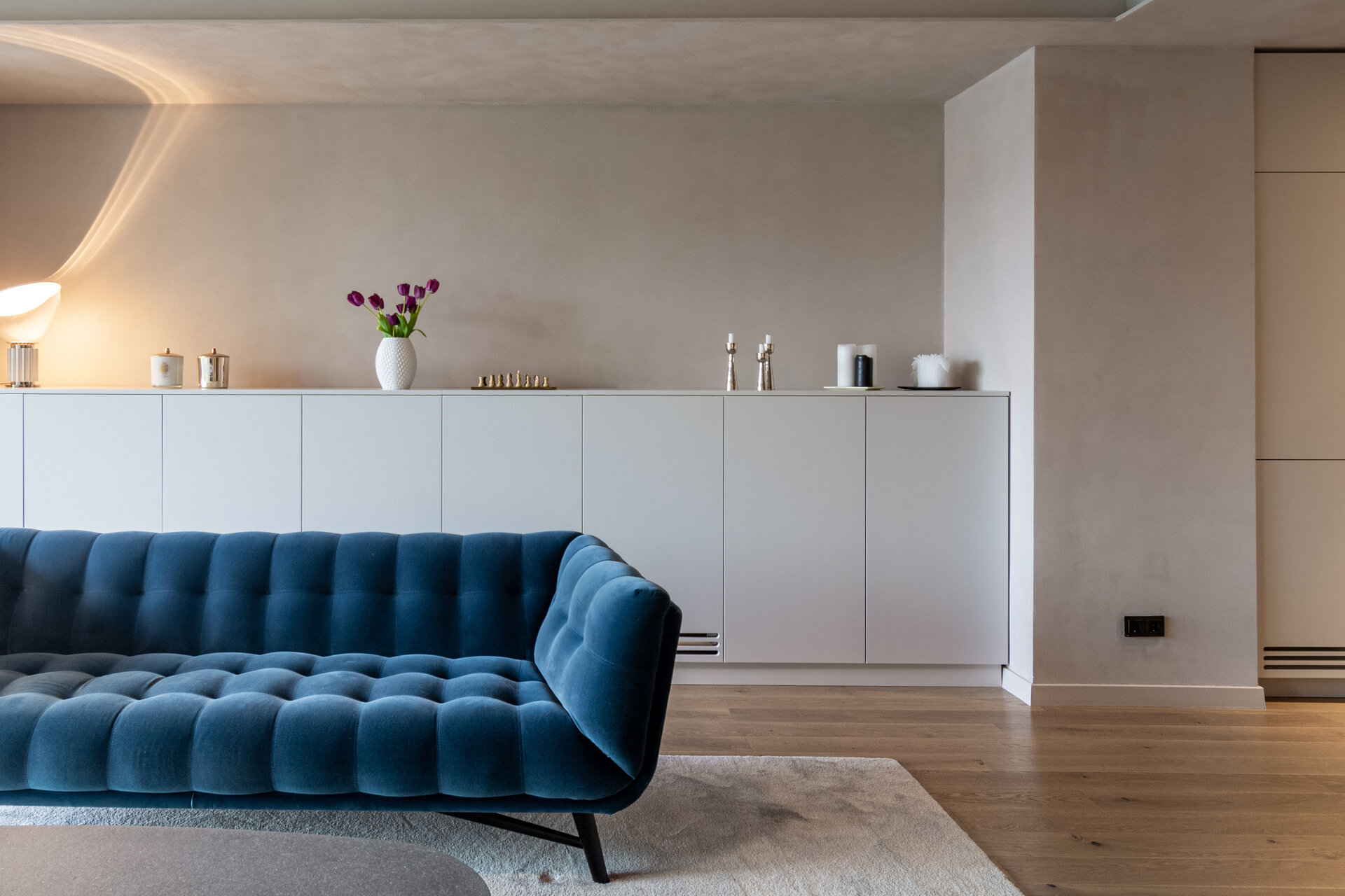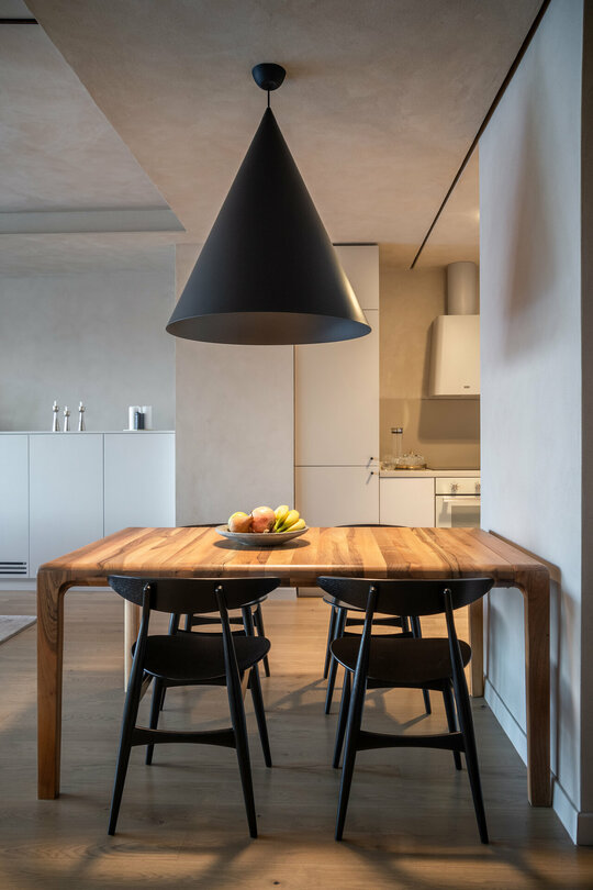 Astfel am încercat să construim un interior care să se înfășoare în jurul tabloului, oferind un context neutru și un interior funcțional, epurat de elemente ce fac parte dintr-o viață ce avea să fie abandonată către o nouă perioadă de esențializare a priorităților. Finisajele au fost construite în jurul cromaticii din lucrarea de artă și obiectele de design au fost alese pentru a crea o identitate a interiorului.